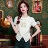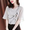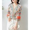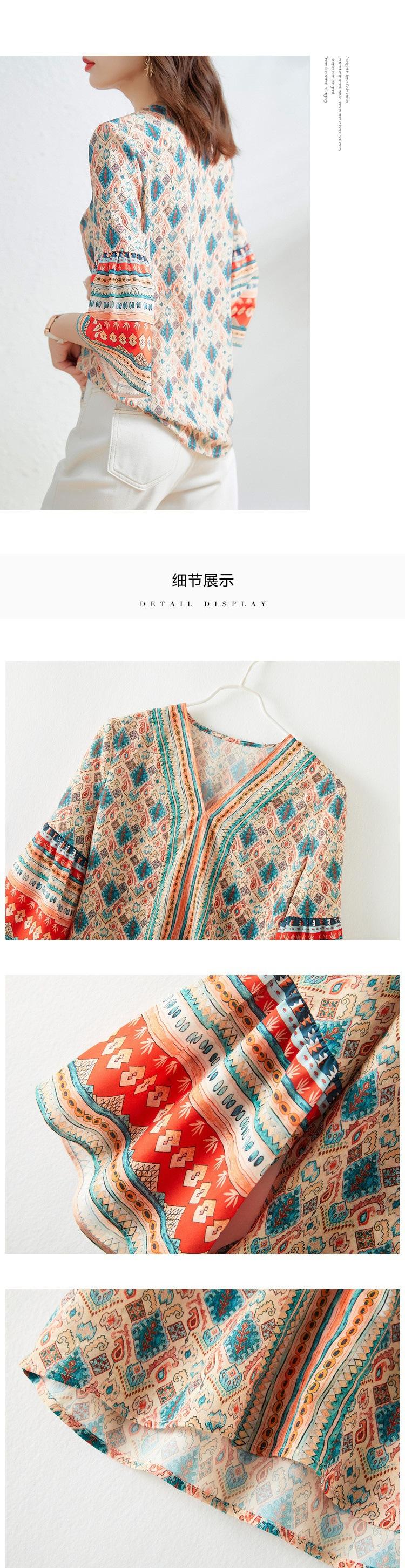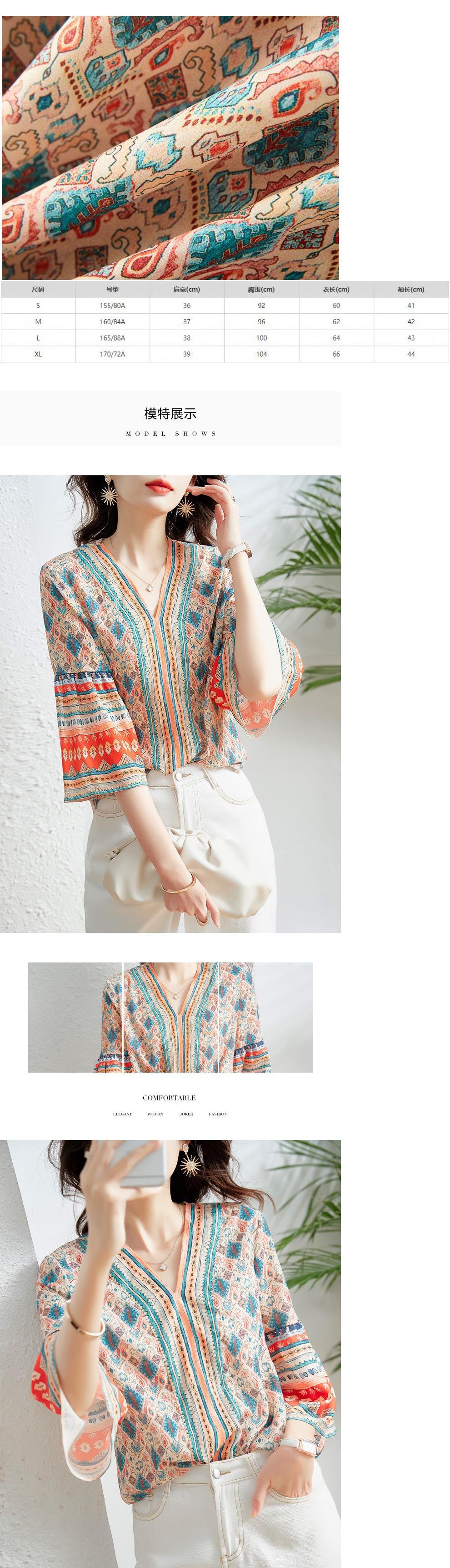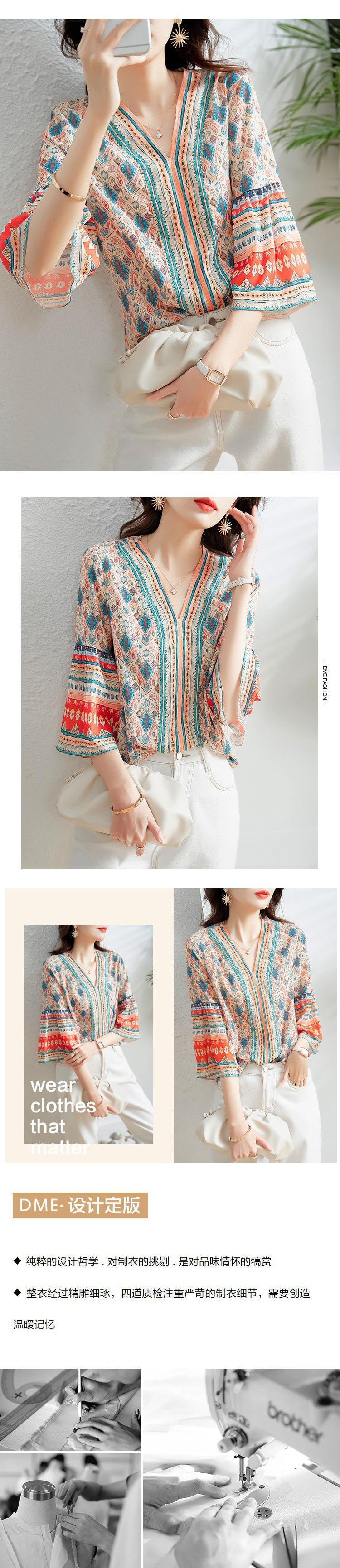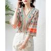Camisa de gasa de siete mangas con cuello en V de estilo étnico de verano para mujer, diseño elegante y fino.