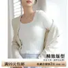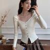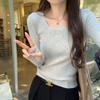 Suéter elegante de cuello cuadrado para mujer, otoño e invierno 2023, diseño de combinación de colores, camisa de punto, manga larga, top corto ajustado de alta gama