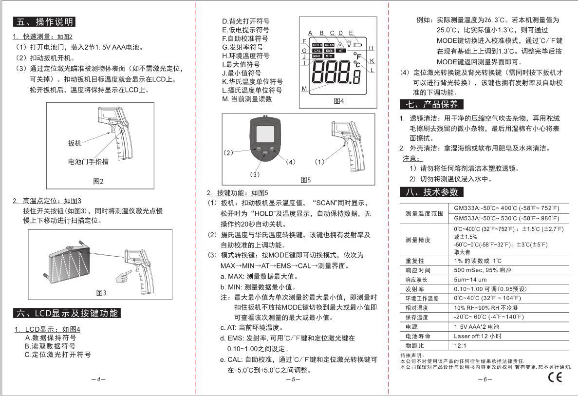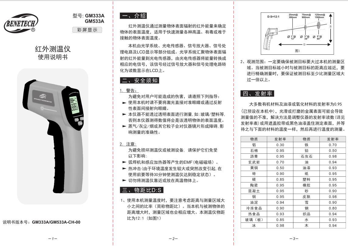 GM333A: Versión con pantalla a color; rango de medición -50℃~400℃, relación distancia al objeto 12:1, función de pantalla a color, función de autocalibración, emisividad ajustable, funciones de medición grande, pequeña, promedio y diferencia de temperatura, ajuste de alarma de temperatura alta y baja