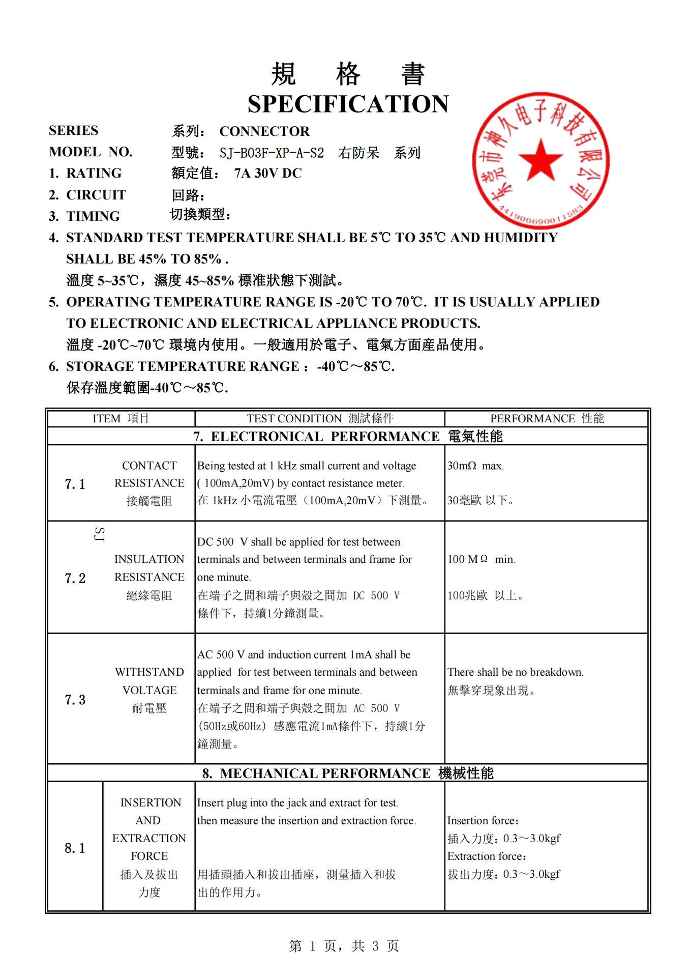 **Especificaciones de la prueba de impedancia de contacto de confiabilidad: Prueba Ri≤20mΩ: sin dañar la película vaporizada en la superficie del terminal, la prueba se combina con el valor de resistencia de contacto entre los dos terminales para evaluar la estabilidad de transmisión de señal del terminal del conector. calificado.