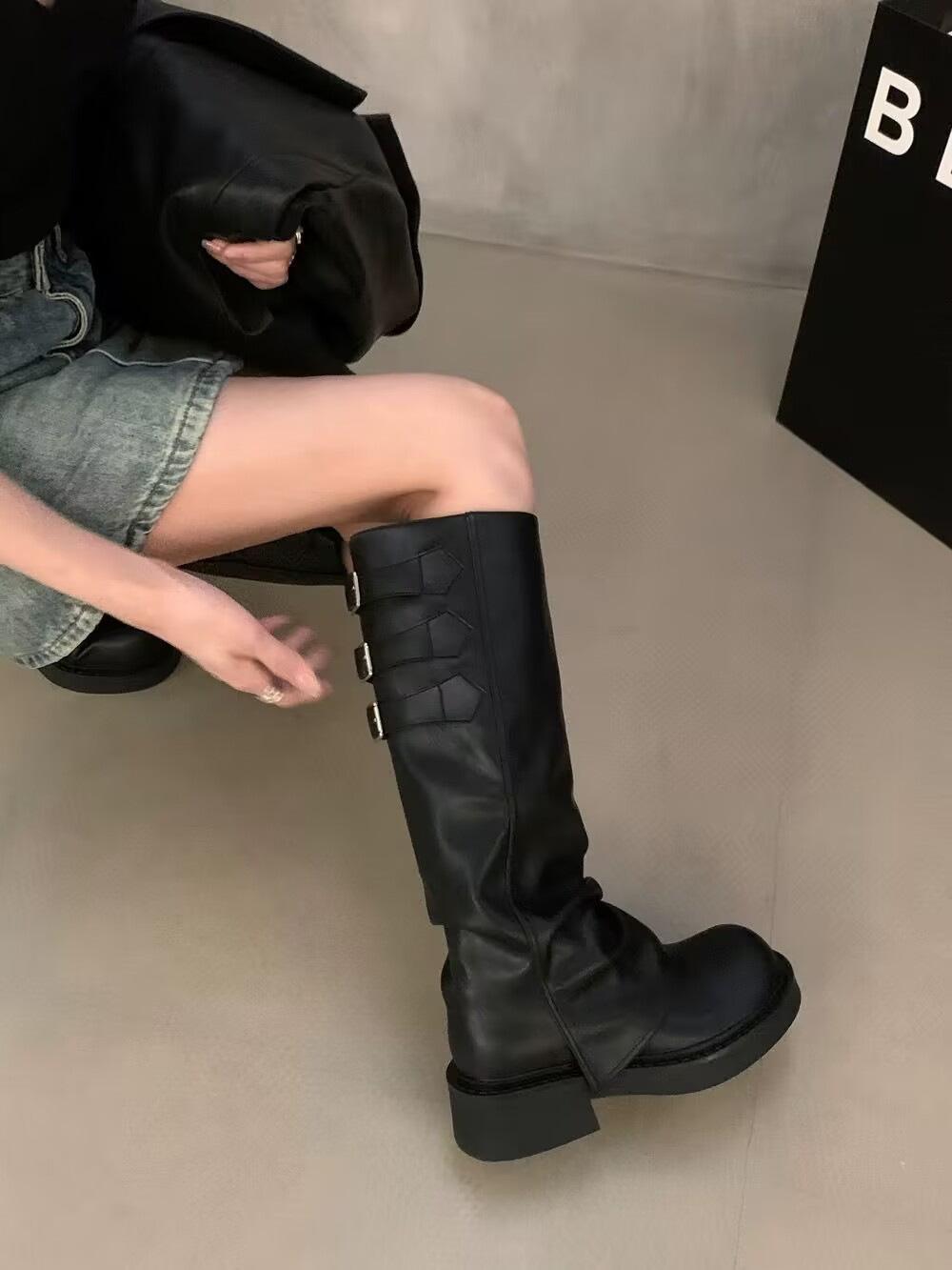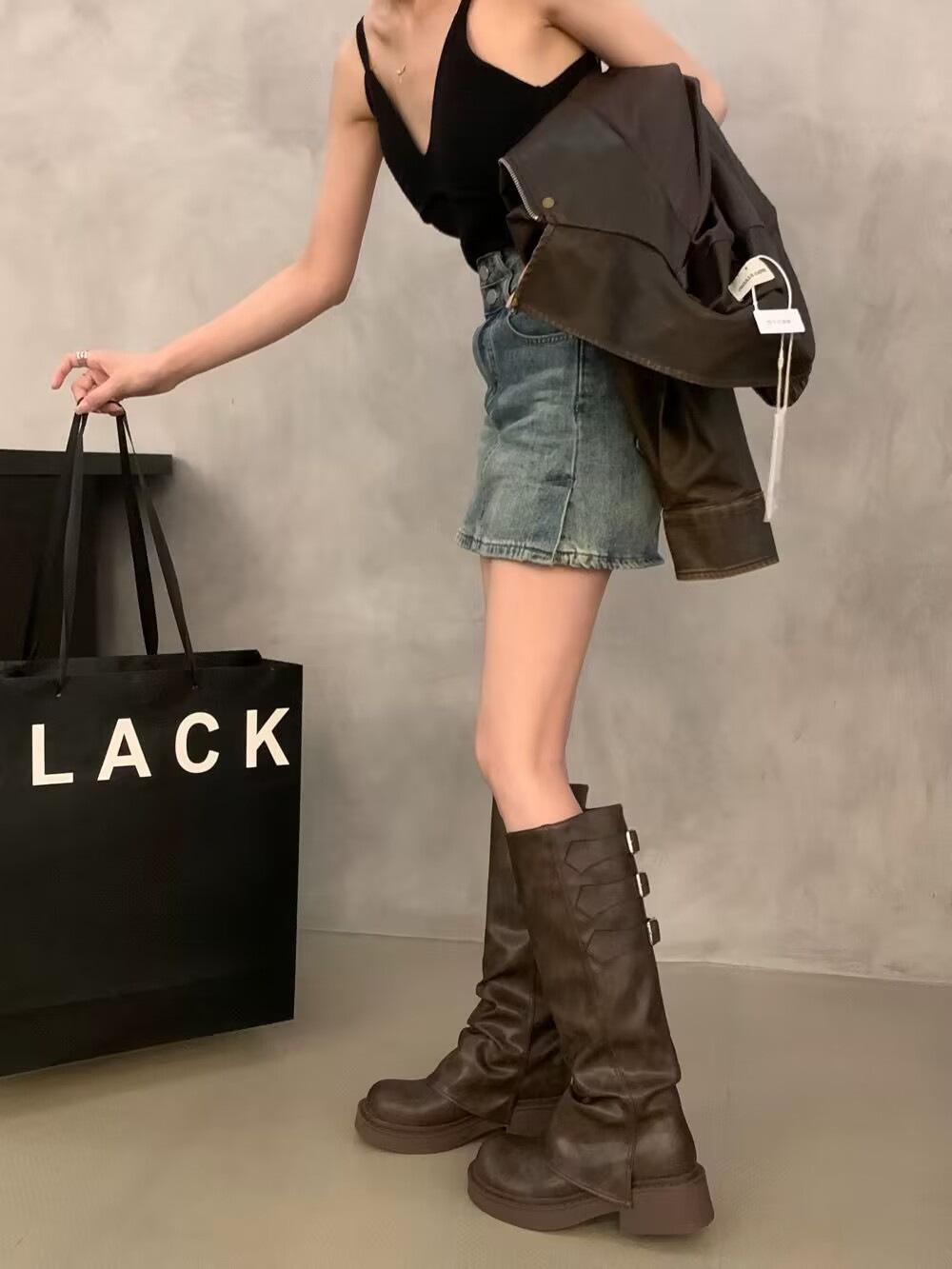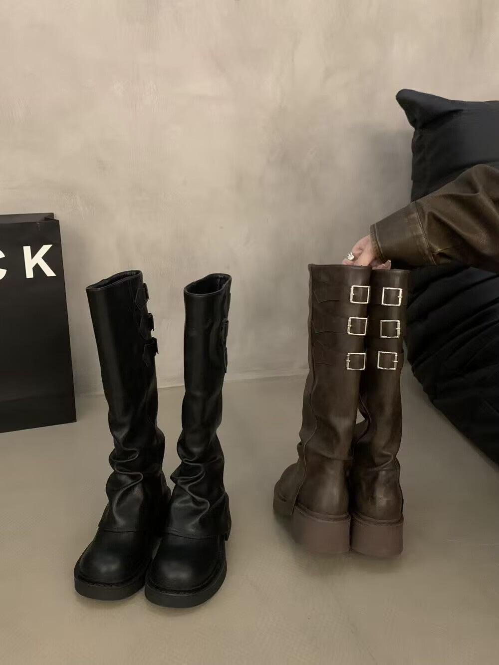 Botas altas marrones para mujer, recién llegadas en 2024, con pantalones, botas de suela gruesa, botas occidentales retro, botas altas casuales elegantes.