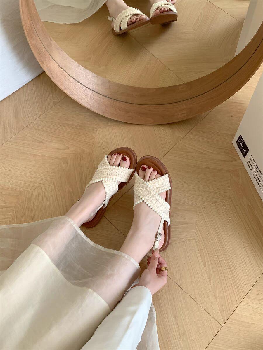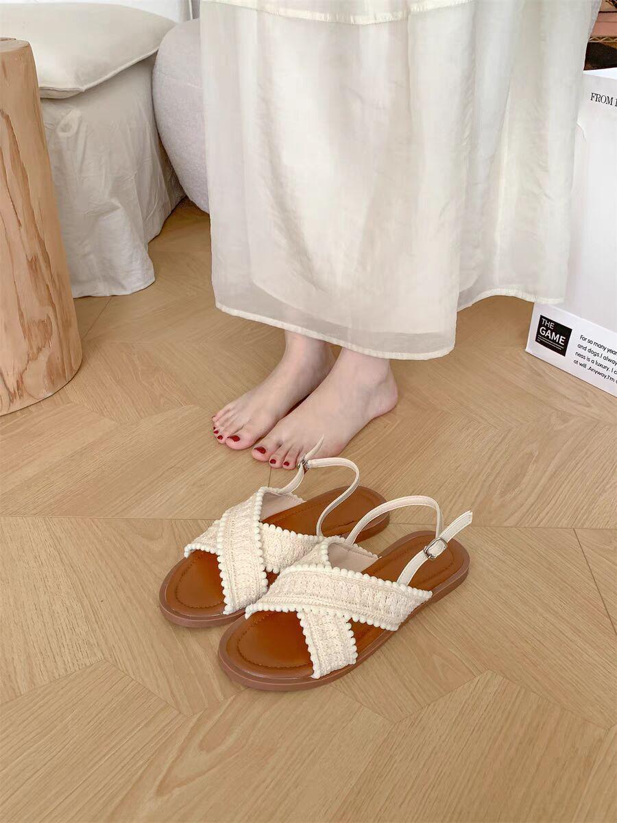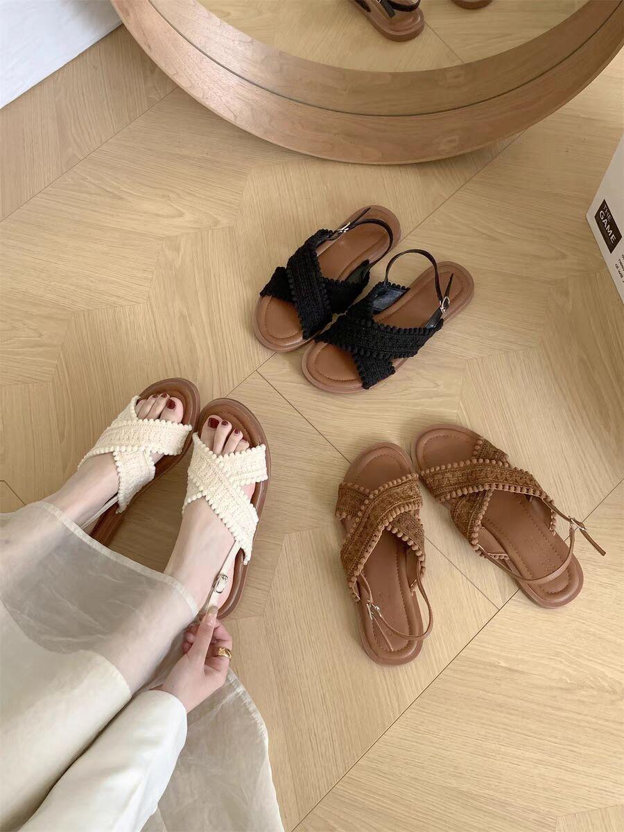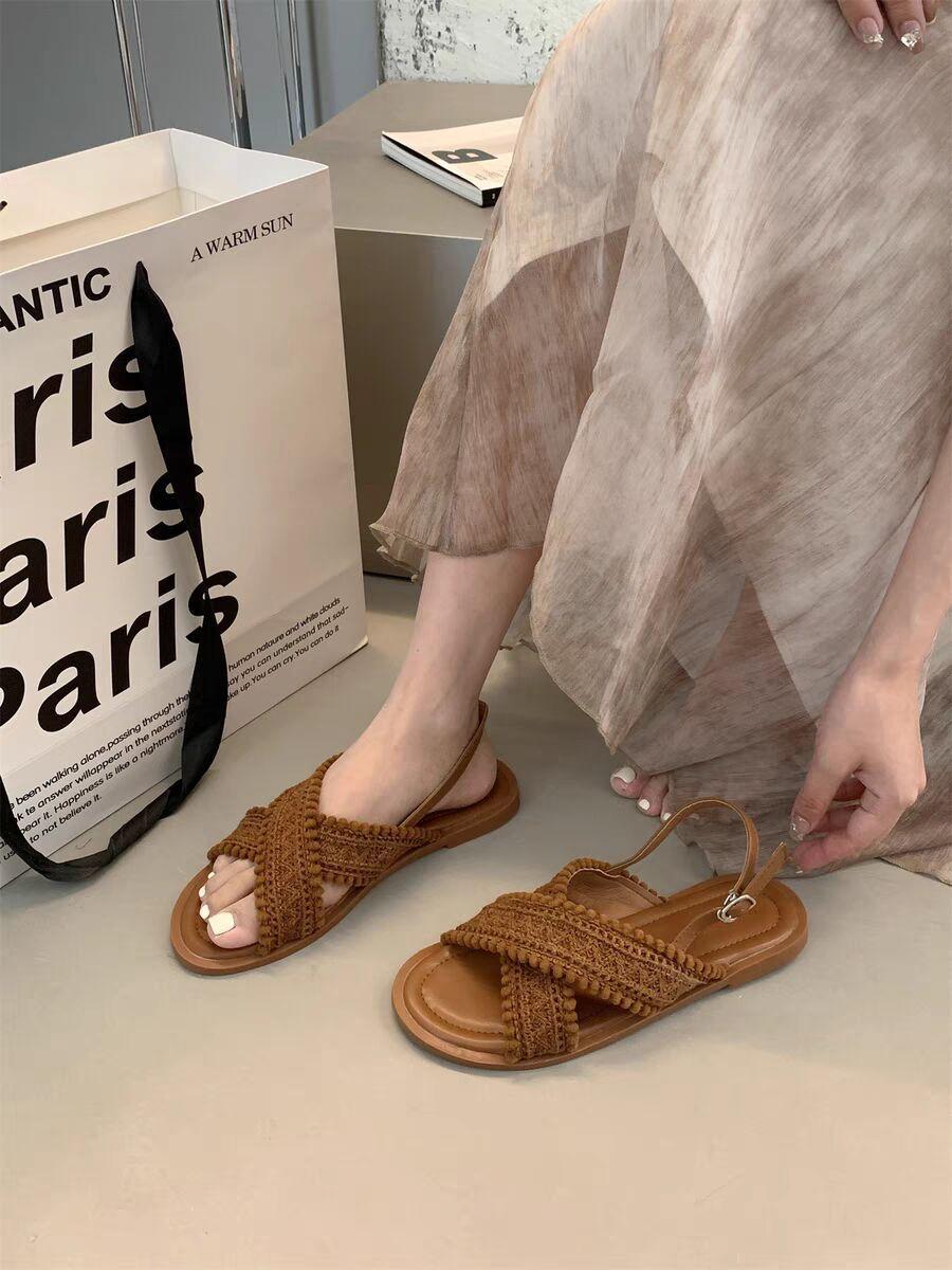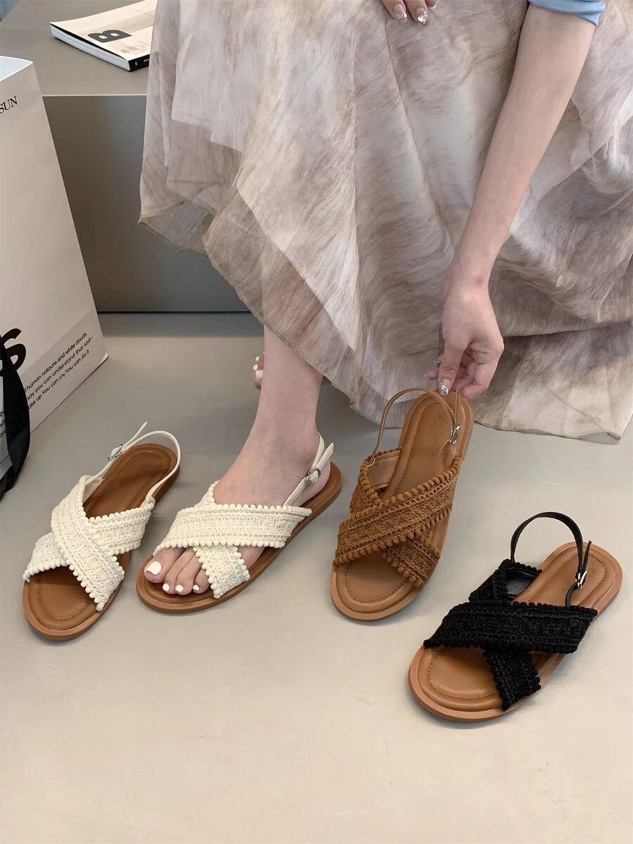 Sandalias planas retro tejidas pequeñas para mujer, zapatos de verano, ropa exterior, sandalias de playa de verano 2024