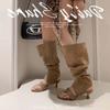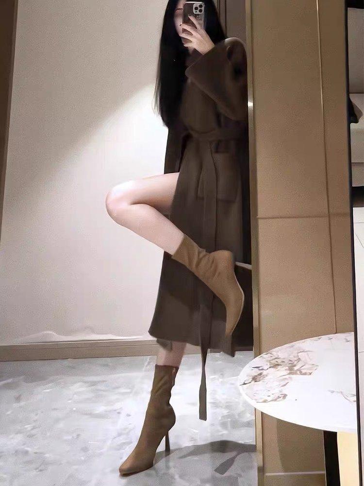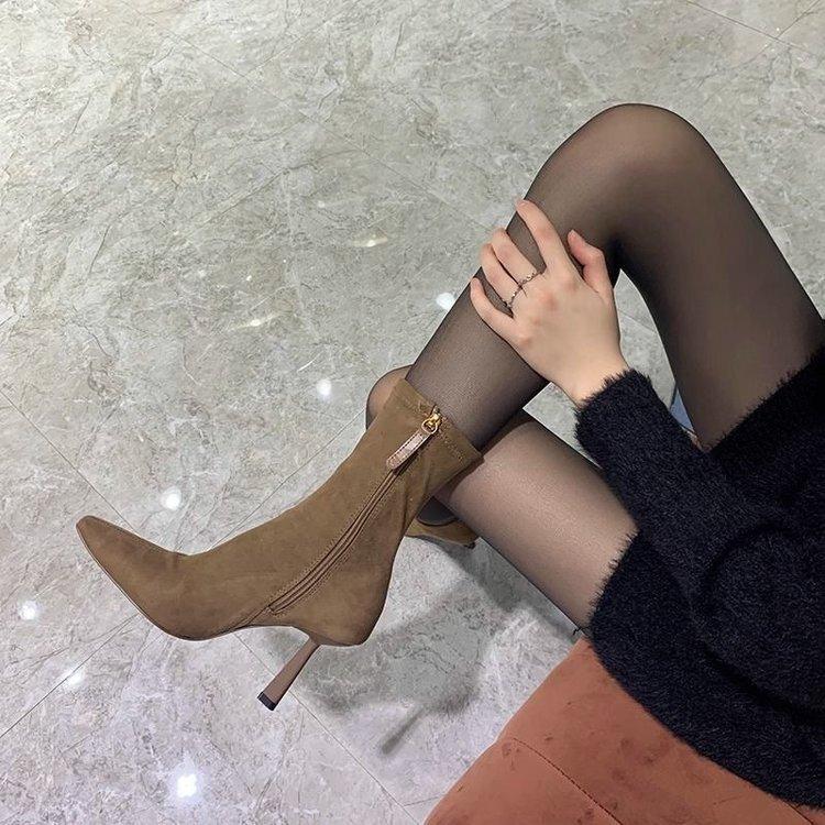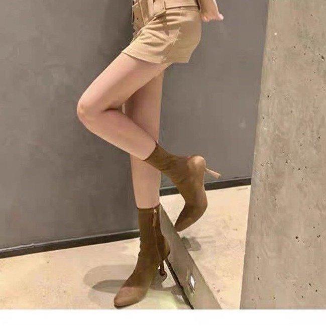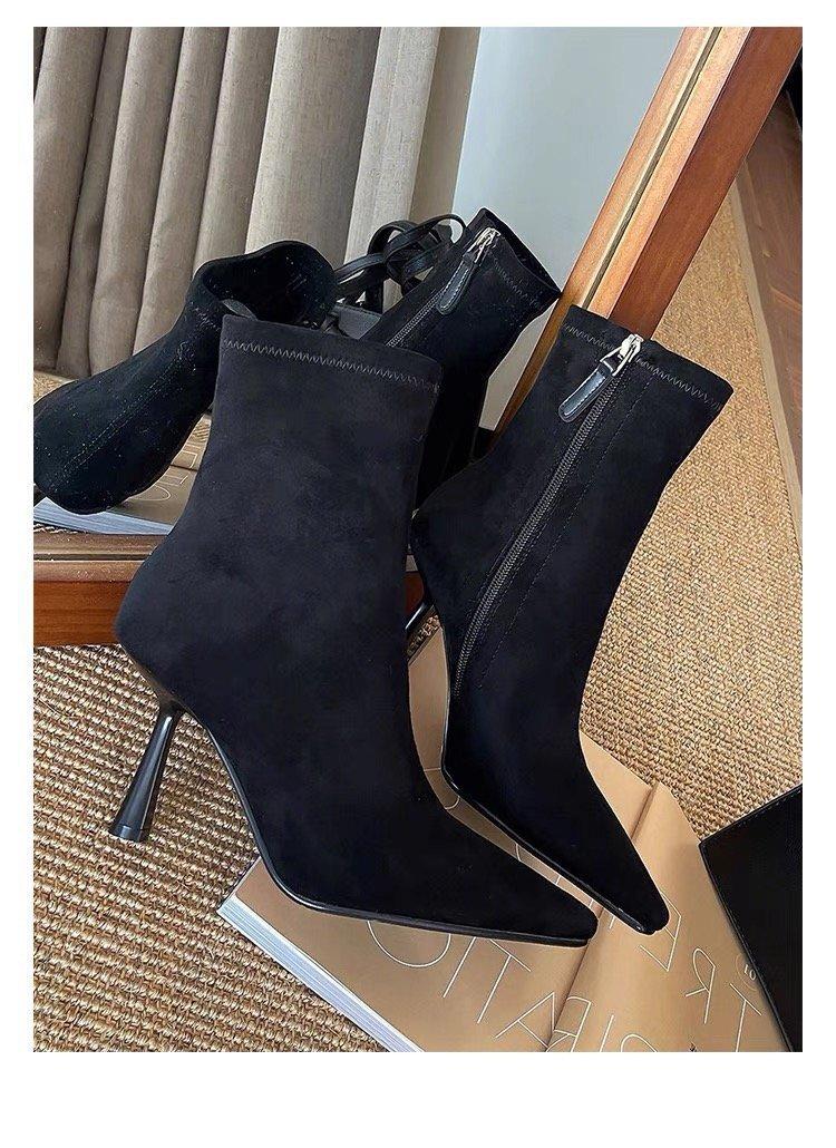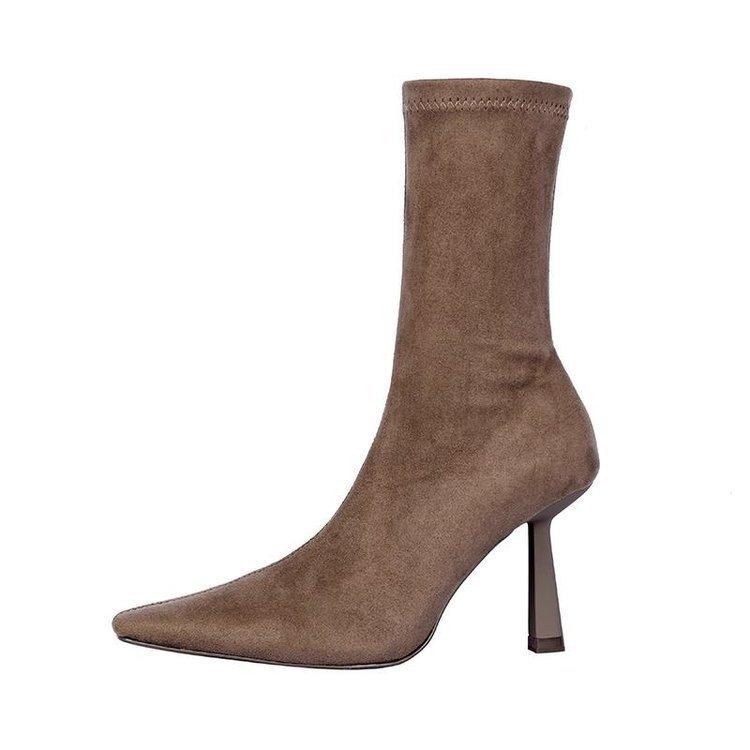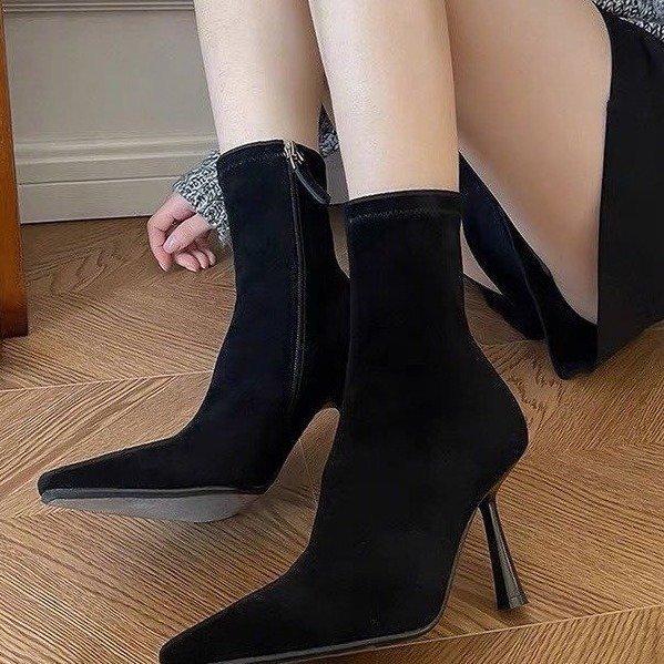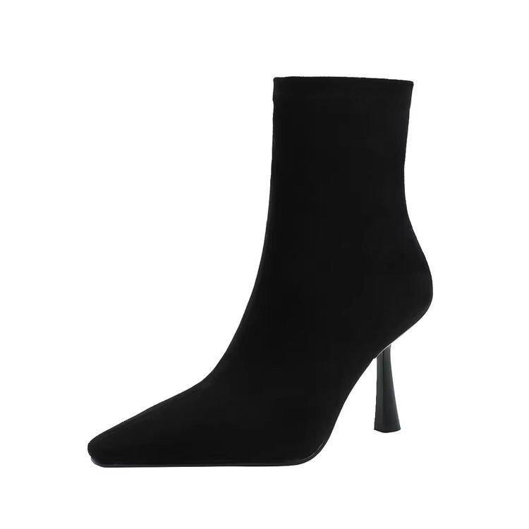 Botines de Tacón Alto para Mujer Otoño 2024 Nuevos Botines de Caña Media de Tacón Fino Botas Ajustadas de Punta Cuadrada Pequeña Adelgazantes Elegantes de Ante Elástico