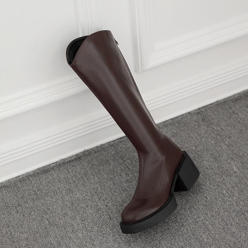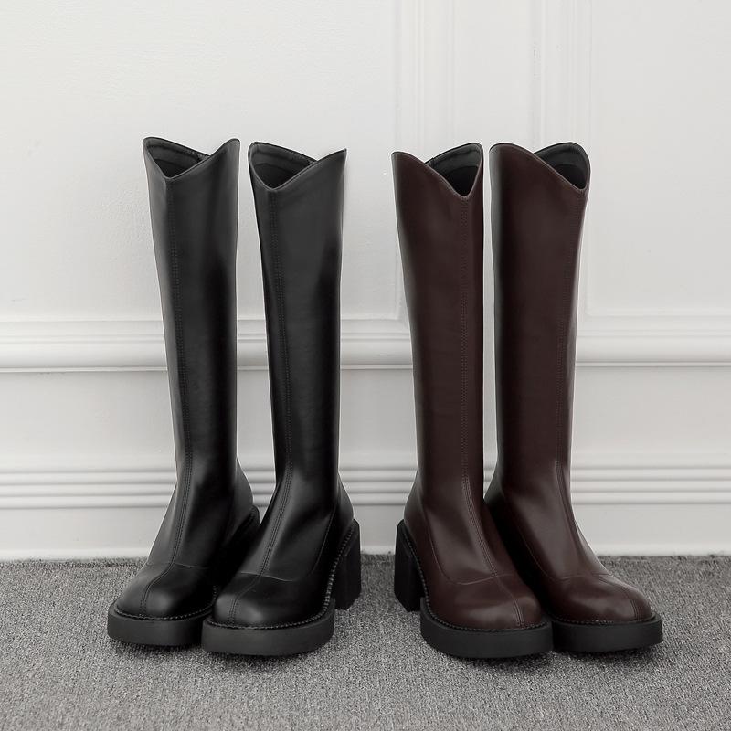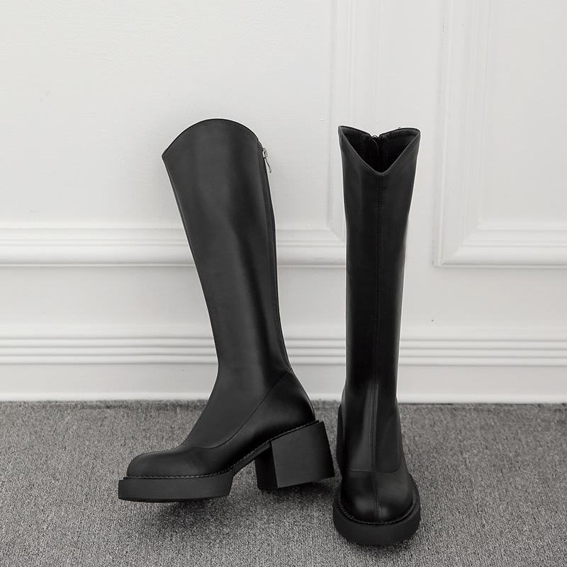 Versión coreana de botas de caballero de tacón grueso y suela gruesa con cremallera trasera, nuevo otoño 2024, Joker pero botas de caballero hasta la rodilla para mujer al por mayor
