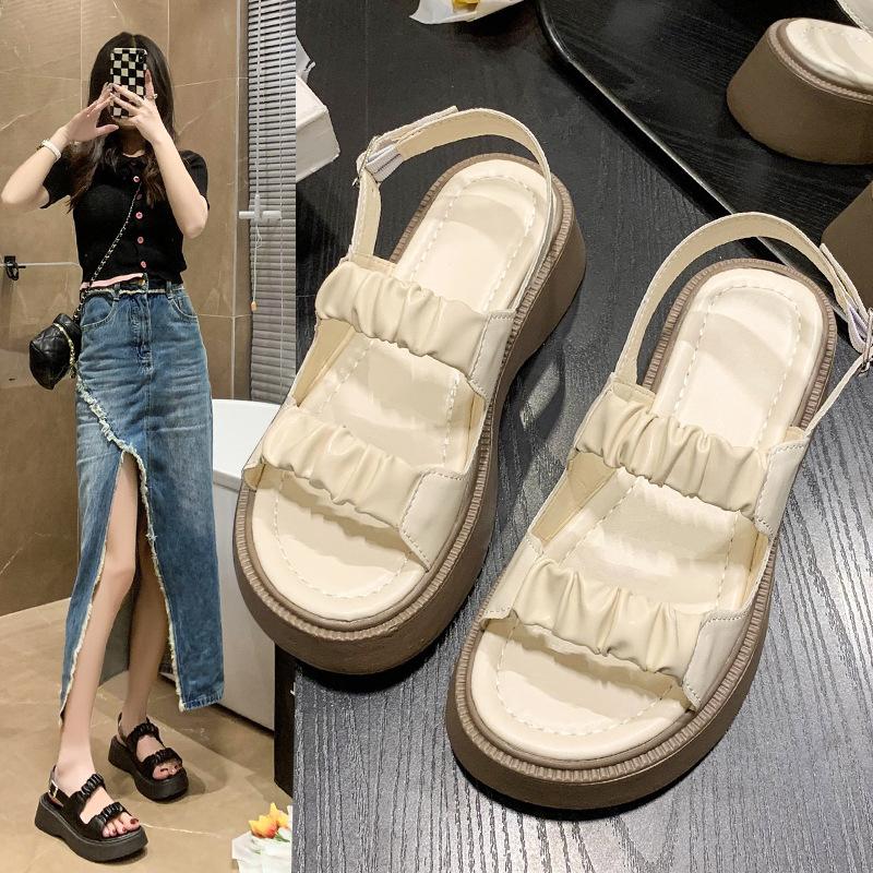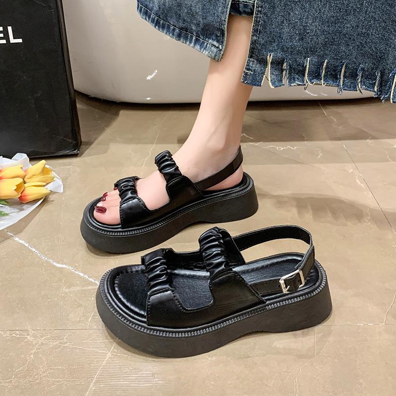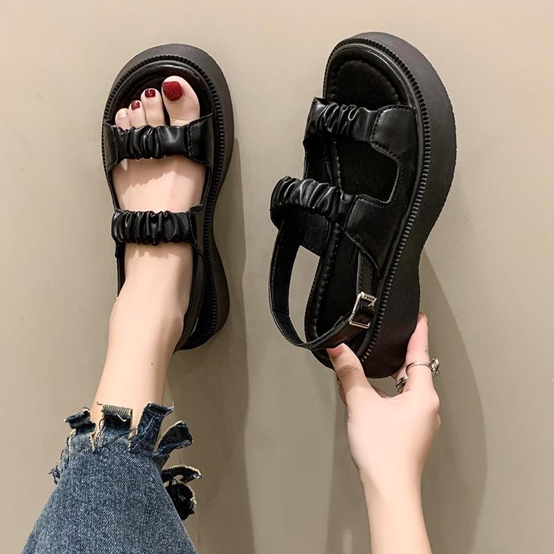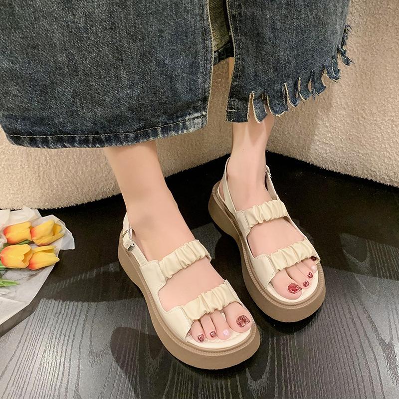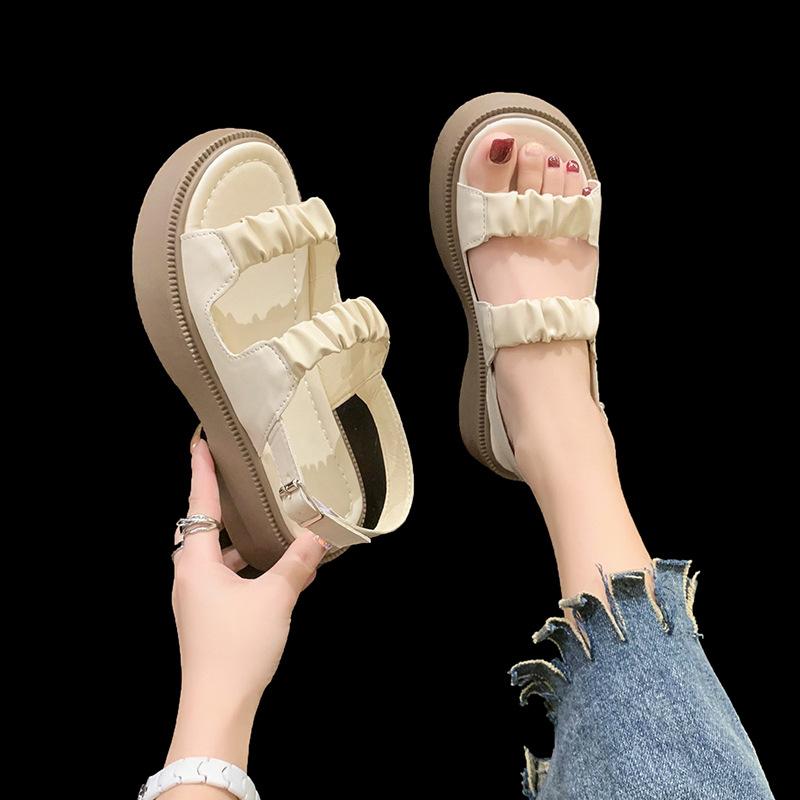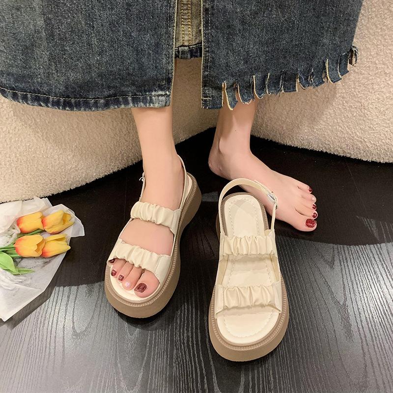 Sandalias gruesas de moda para estudiantes para mujer 2025 Nuevo tacón medio estilo coreano de una línea plisadas con hebilla zapatos romanos de playa para mujer
