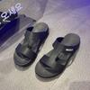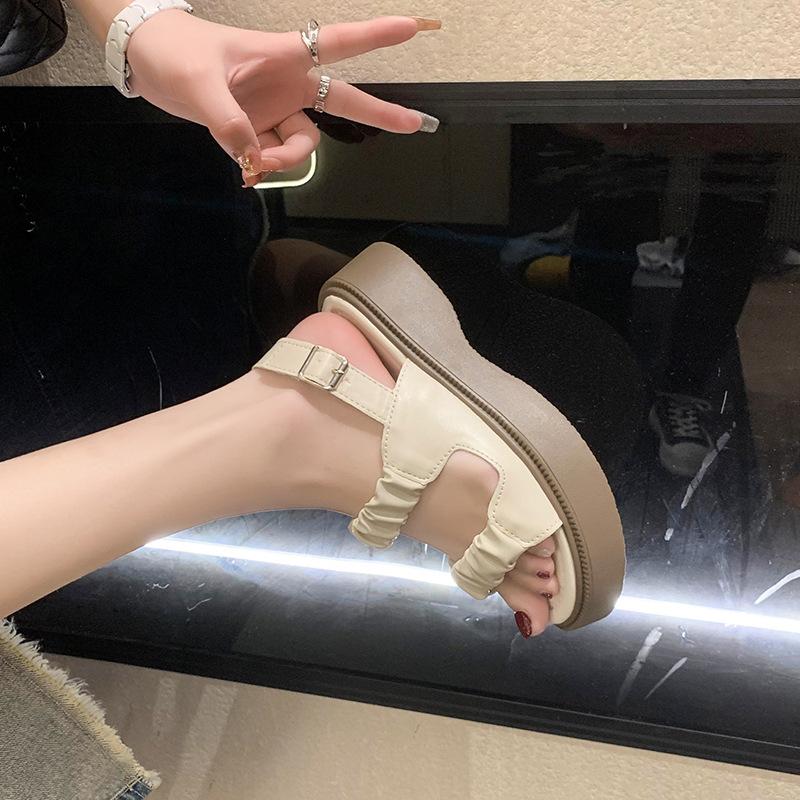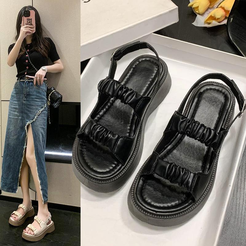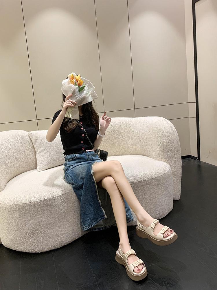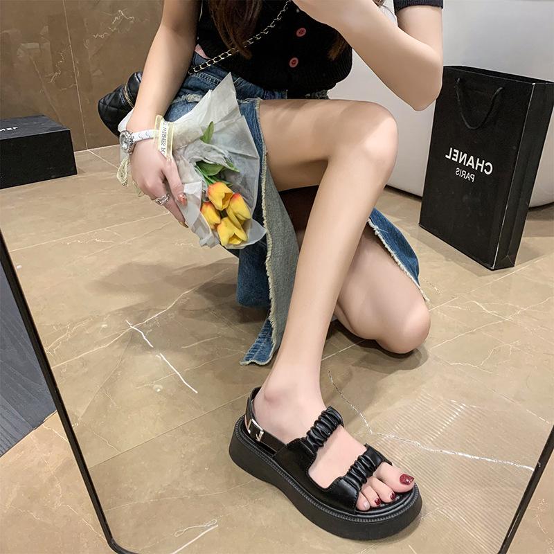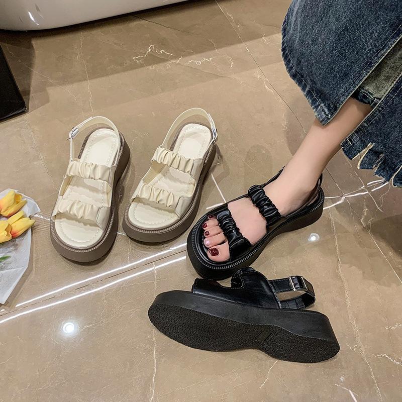 Sandalias gruesas de moda para estudiantes para mujer 2025 Nuevo tacón medio estilo coreano de una línea plisadas con hebilla zapatos romanos de playa para mujer