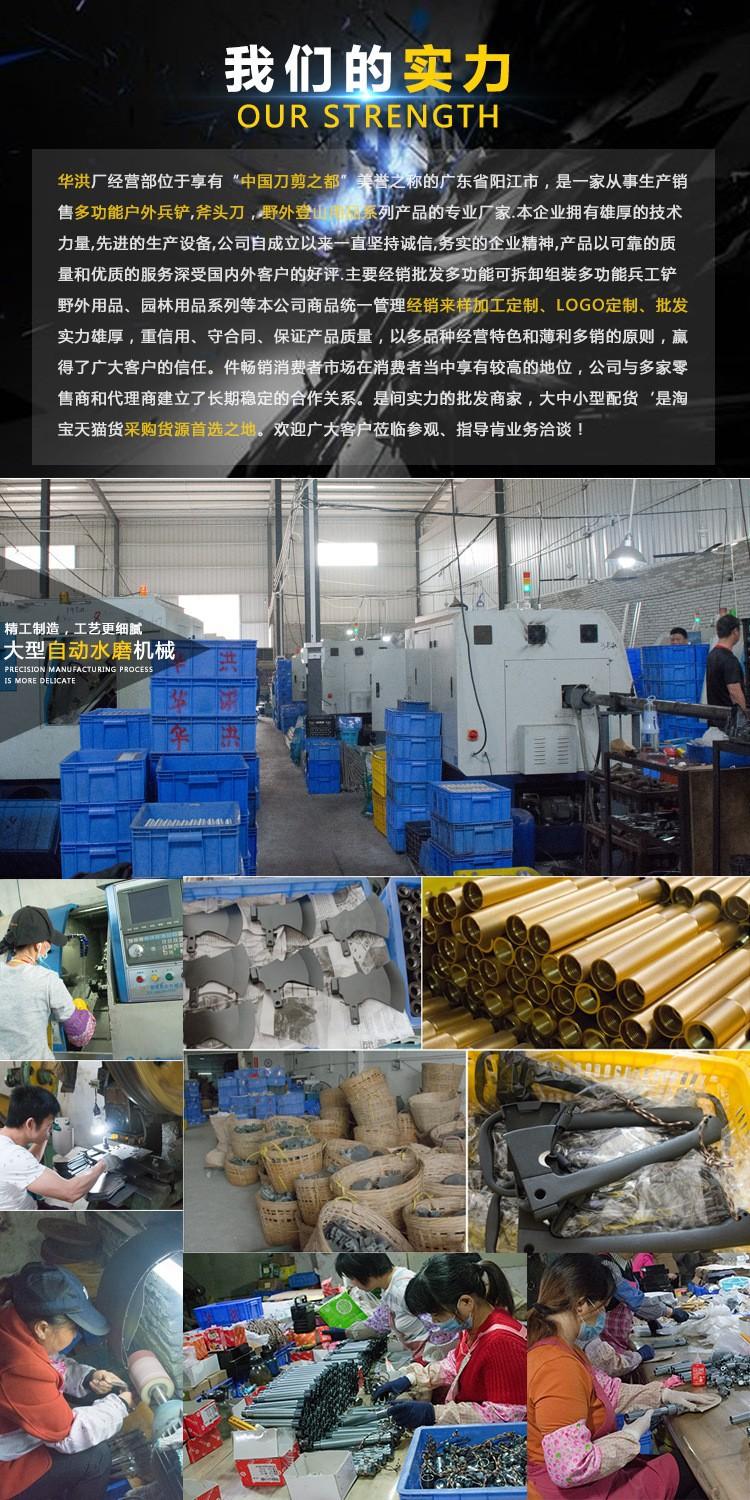 El Departamento Comercial de la Fábrica Huahong se encuentra en la ciudad de Yangjiang, provincia de Guangdong, conocida como la "Capital China de los Cuchillos y las Tijeras". Es un fabricante profesional dedicado a la producción y venta de palas multifuncionales, palas para exteriores, hachas y otros productos. La empresa cuenta con una sólida capacidad técnica y equipos de producción avanzados. Desde su fundación, se ha mantenido fiel a la integridad y el pragmatismo. Sus productos gozan de una excelente aceptación entre clientes nacionales e internacionales por su calidad confiable y un servicio de alta calidad. Distribuye y vende principalmente palas plegables multifuncionales para exteriores, palas de supervivencia para acampar y otros suministros para actividades al aire libre, centralizando todos los productos pequeños de Yangjiang para una gestión, distribución y venta al por mayor unificadas. Gracias a su sólida trayectoria, solvencia, cumplimiento de contratos y garantía de calidad, se ha ganado la confianza de los clientes gracias a su amplia gama de productos y al principio de bajos beneficios y rápida rotación. Sus productos se venden con éxito en el mercado de consumo y gozan de gran prestigio. La empresa ha establecido relaciones de cooperación duraderas y estables con numerosos minoristas y agentes. Es la opción preferida por mayoristas nacionales, supermercados grandes, medianos y pequeños, Taobao y Tmall para comprar productos.