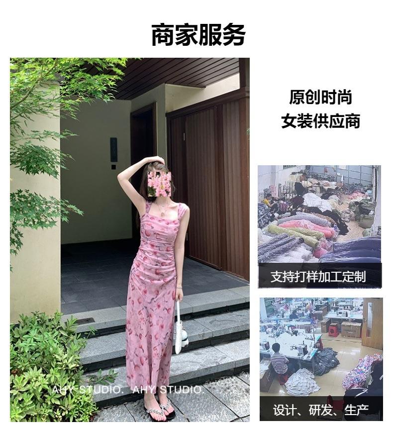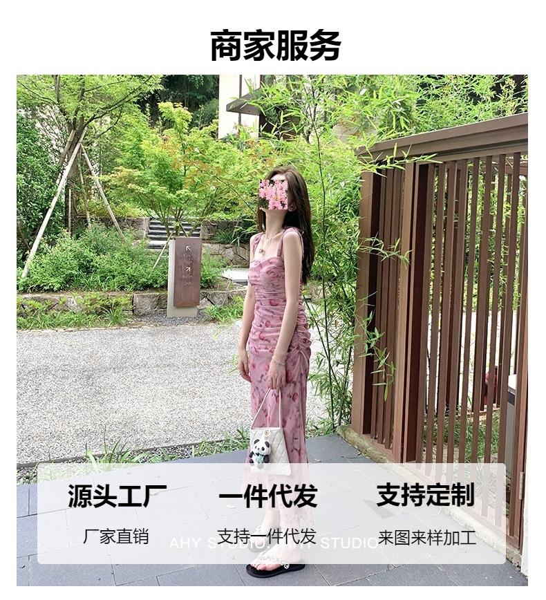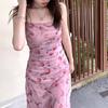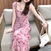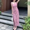 Vestido de Tirantes Floral Rosa Vacaciones en la Playa para Mujer 2025 Verano Nuevo Ajustado Sin Mangas Cintura Alta Falda Larga
