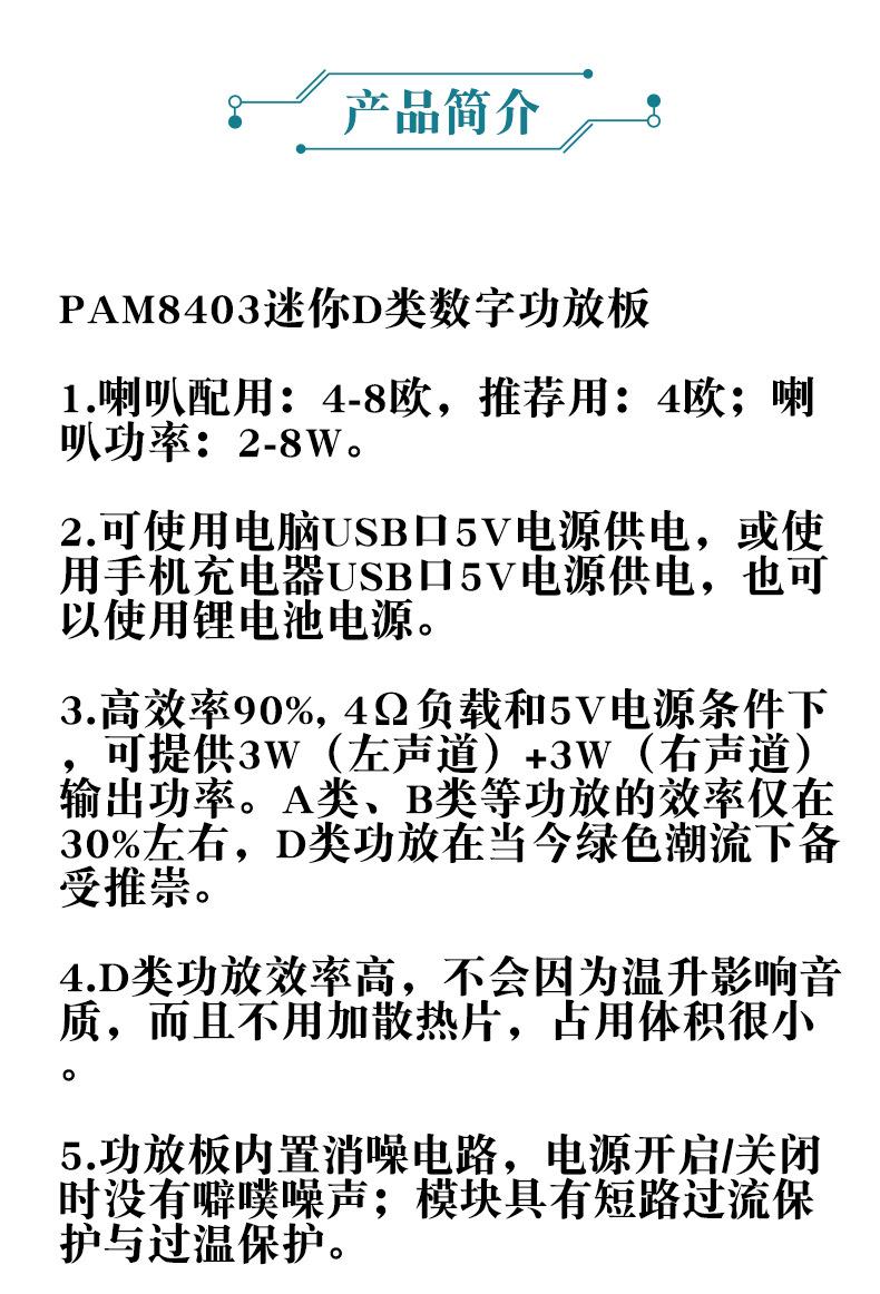 Placa amplificadora de potencia Green Board PAM8403, clase D, 2 x 3 W, ultramicro, digital, fuente de alimentación USB de 2,5 a 5 V.