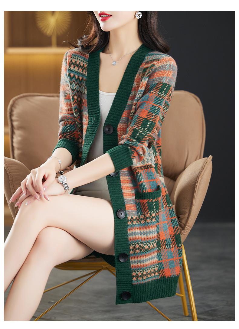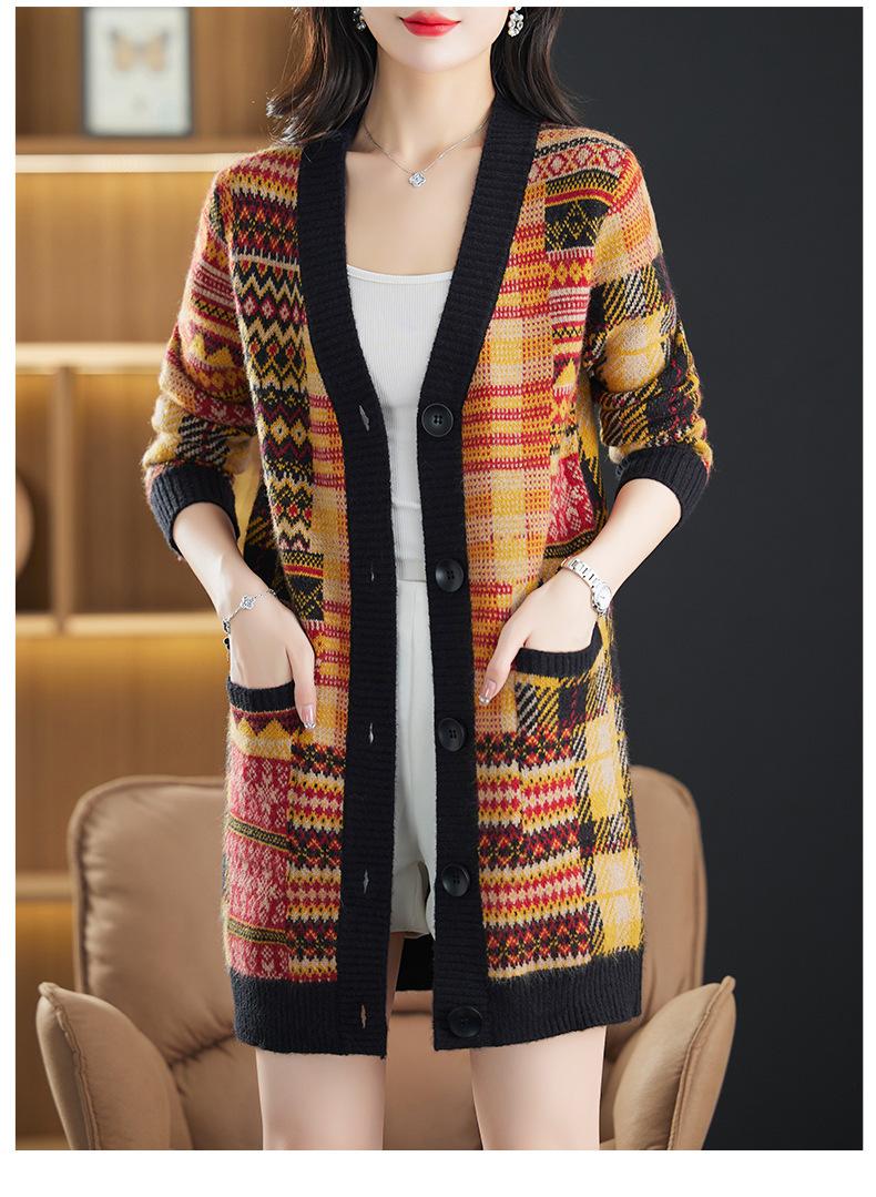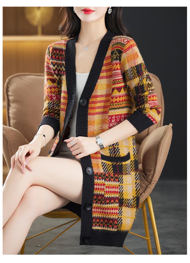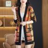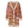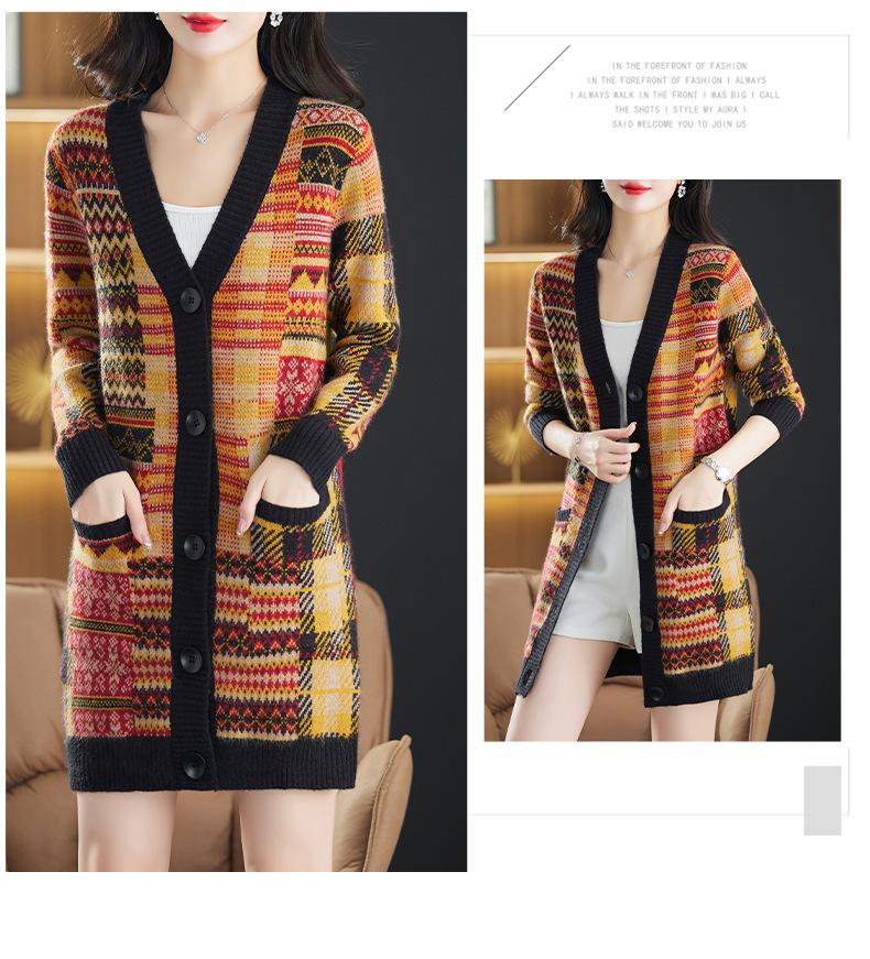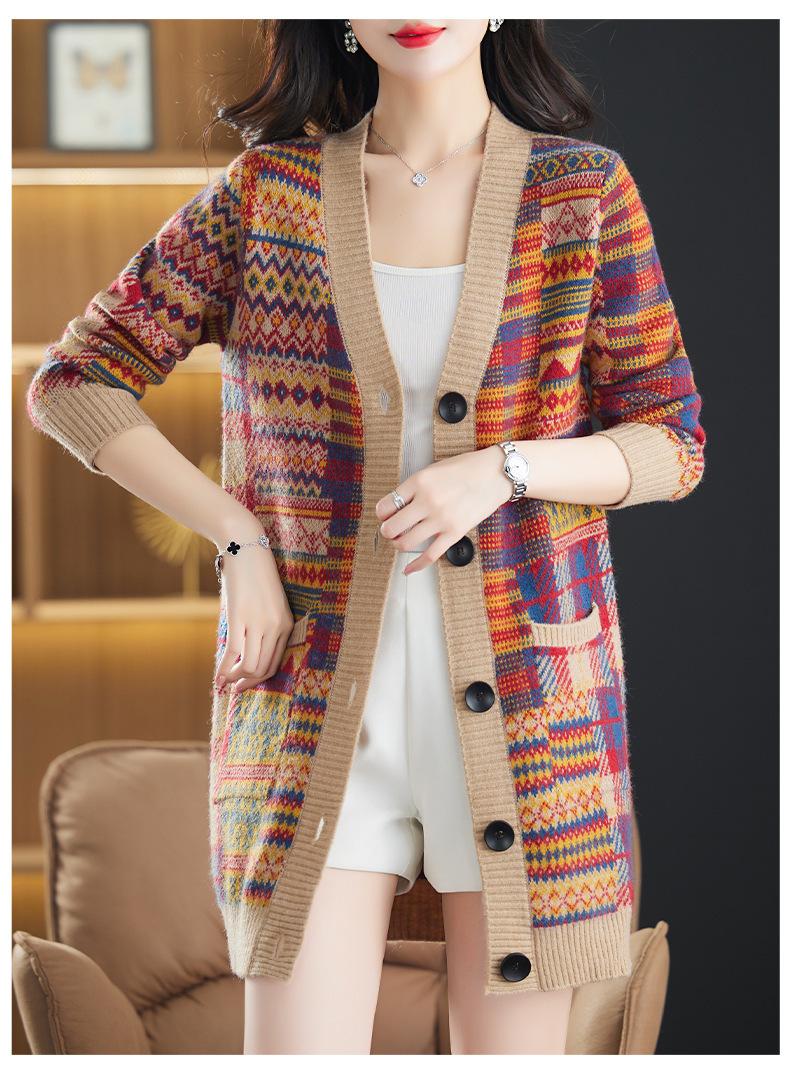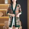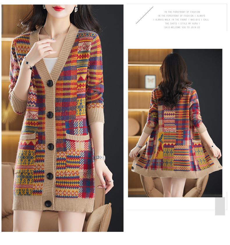 Cárdigan de punto holgado e informal de longitud media con contraste de color para mujer, suéter exterior de manga larga en jacquard, otoño 2023