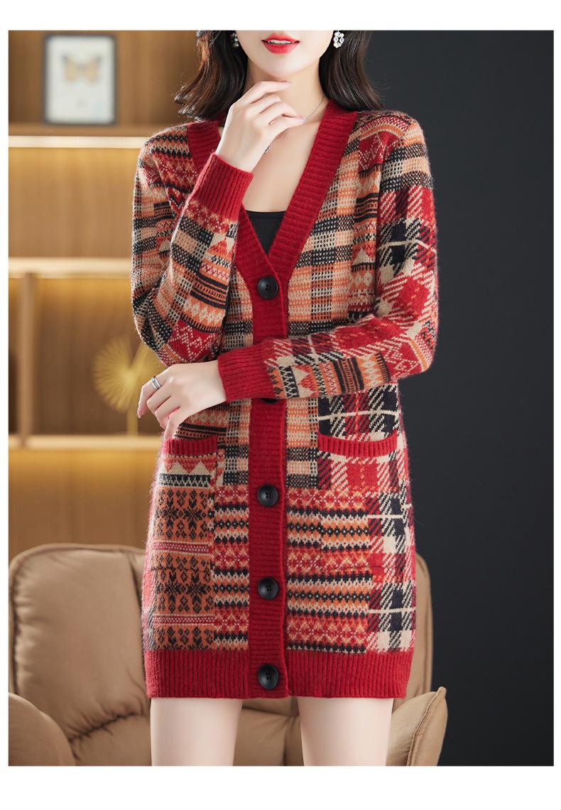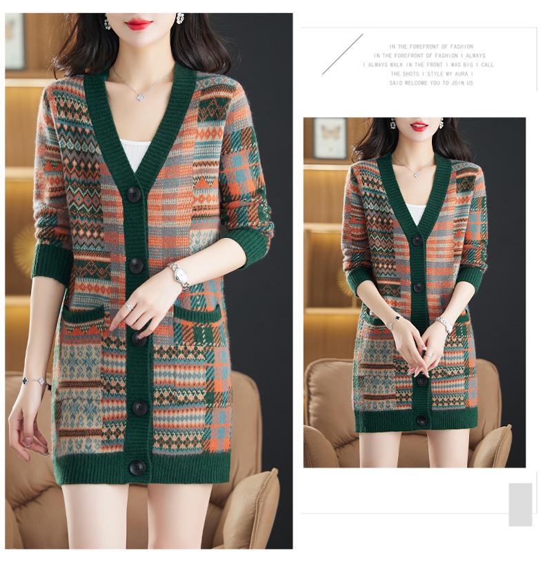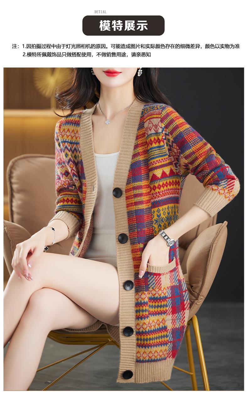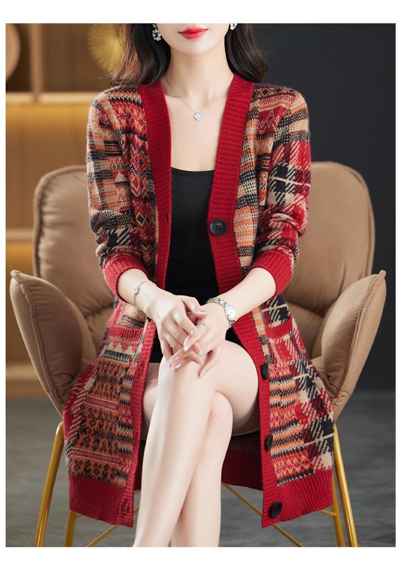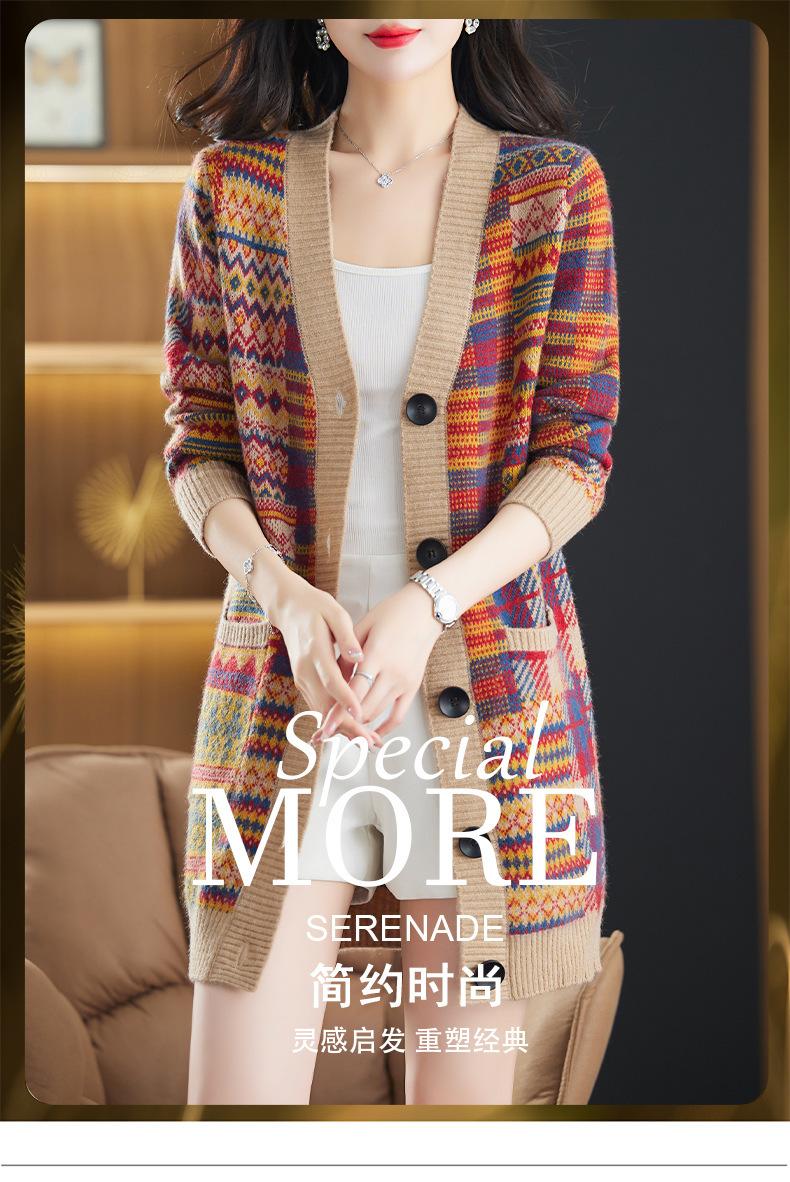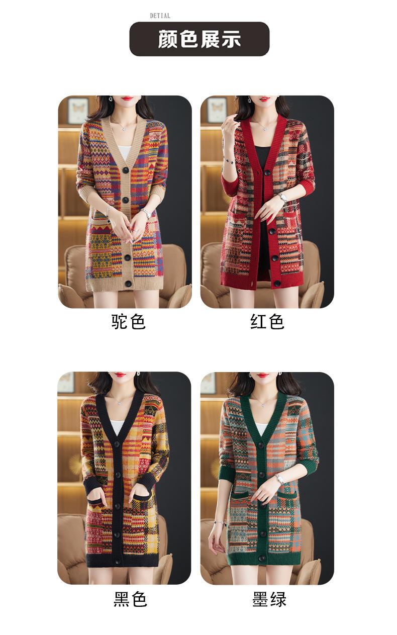 Cárdigan de punto holgado e informal de longitud media con contraste de color para mujer, suéter exterior de manga larga en jacquard, otoño 2023