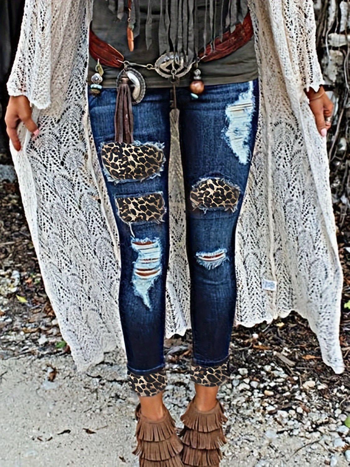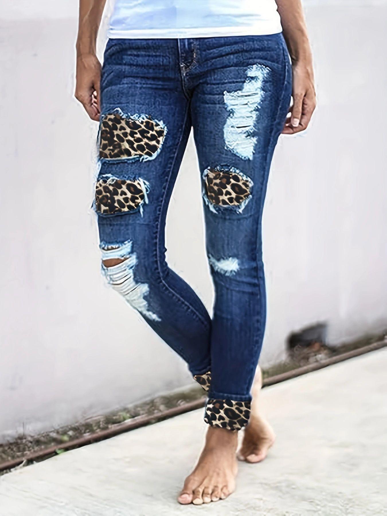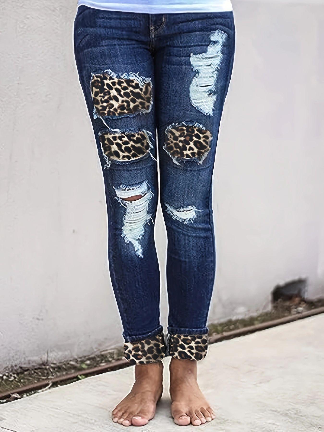 Pantalones vaqueros ajustados, rotos y con parches de leopardo para mujer, de estilo europeo y americano.