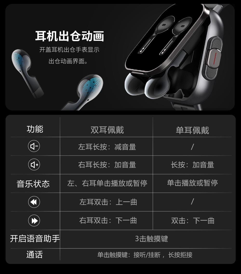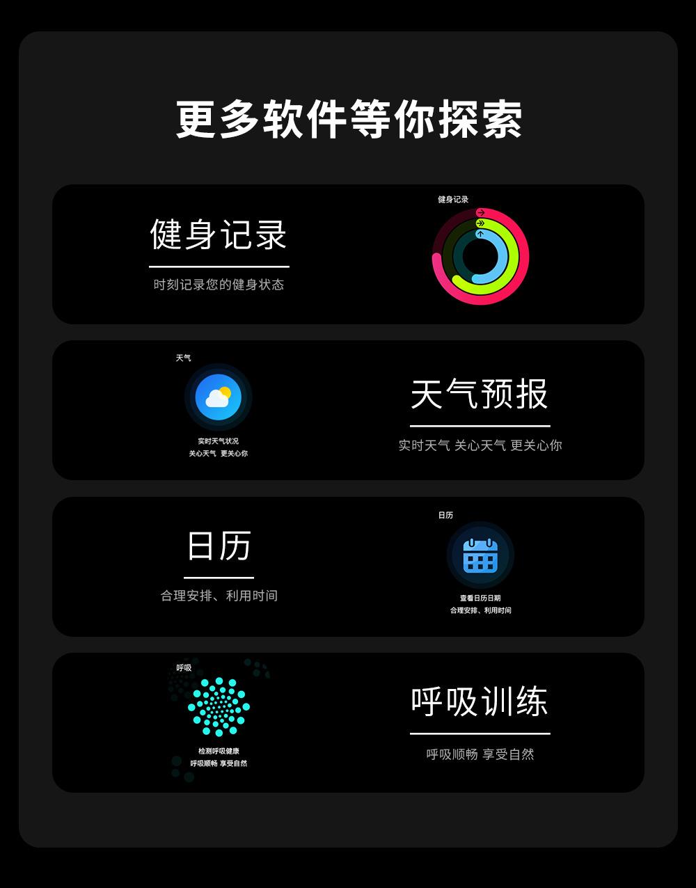 Recordatorios (información, sedentarismo, agua potable, despertador), clima, deportes de WeChat, entrenamiento de respiración, toma de fotografías a distancia, cronómetro, buscar teléfono, levantar la muñeca para iluminar la pantalla, contactos comunes, pantalla dividida (barra lateral)