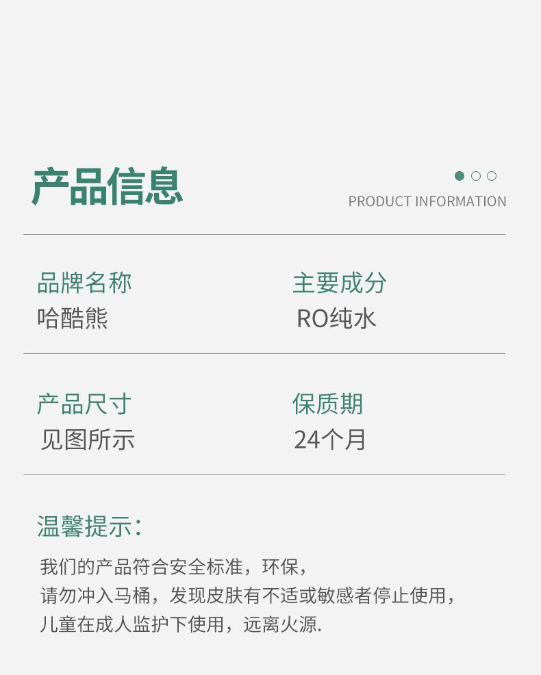 Ingredientes principales: agua pura RO, tela no tejida spunlace de alta calidad