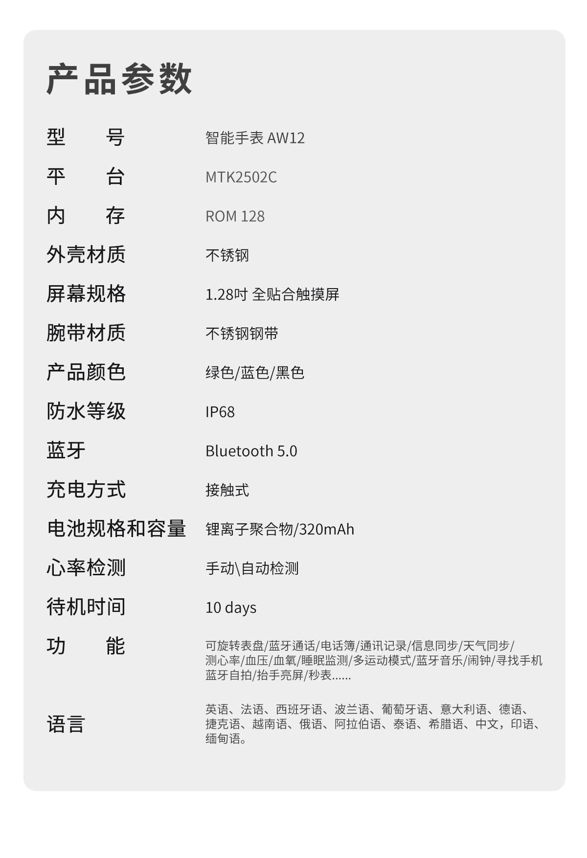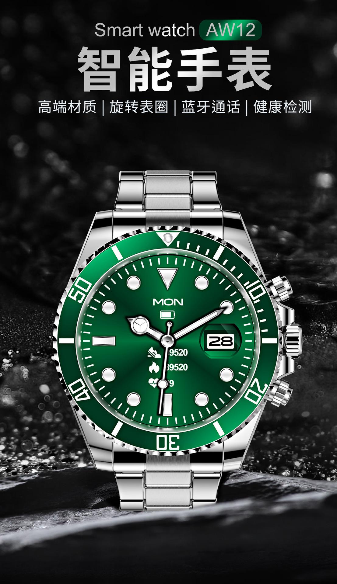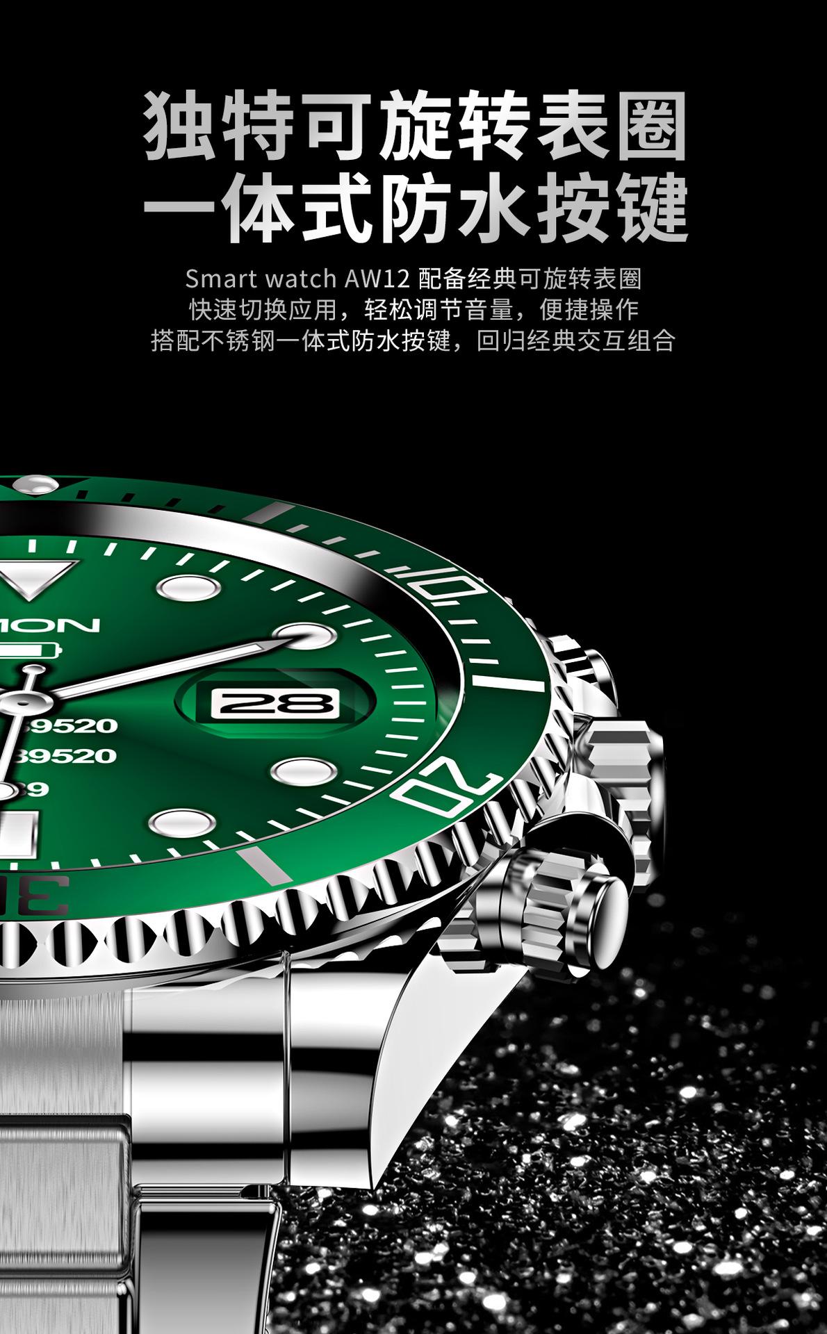 Reloj inteligente transfronterizo AW12 con Bluetooth, llamadas, bisel giratorio, música, detección de frecuencia cardíaca y presión arterial para hombre