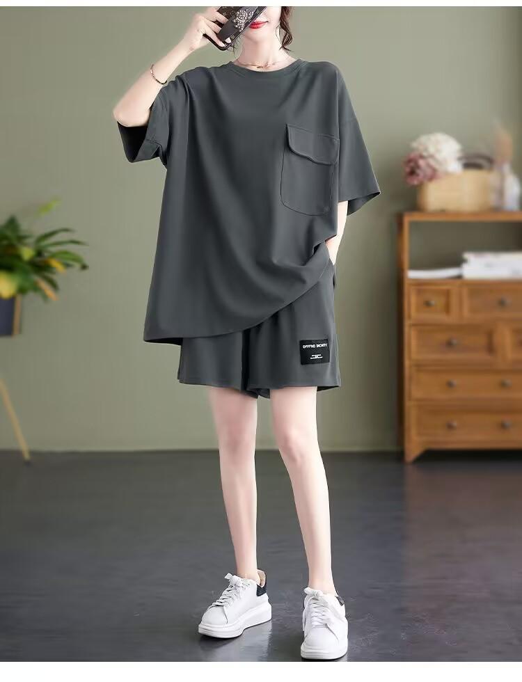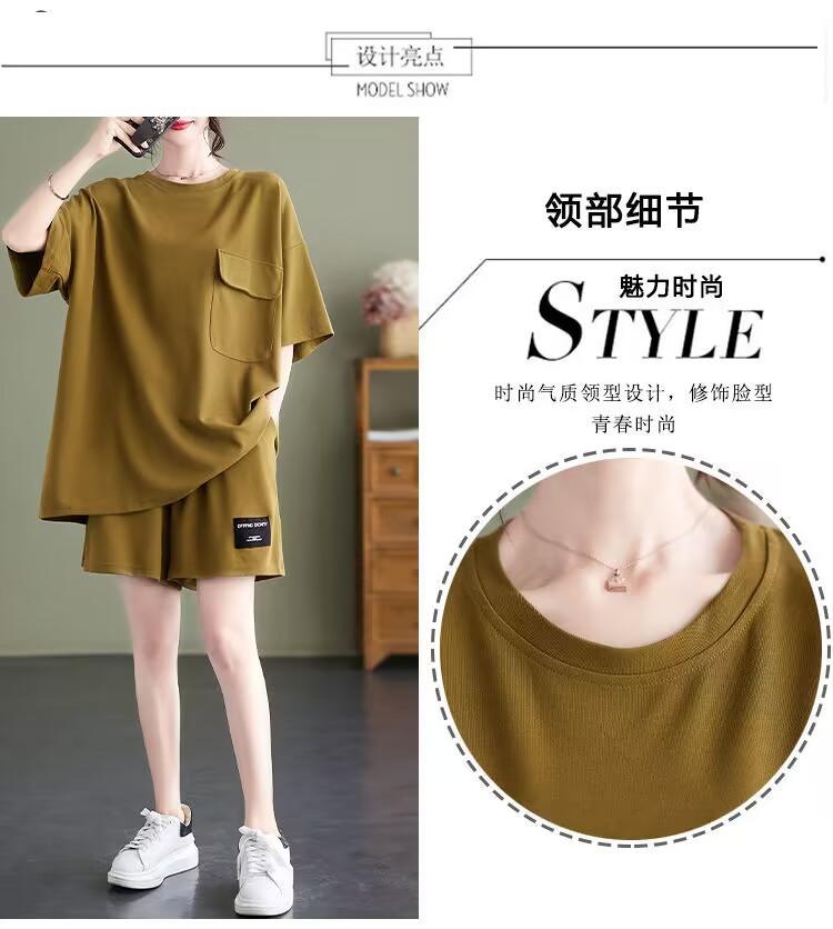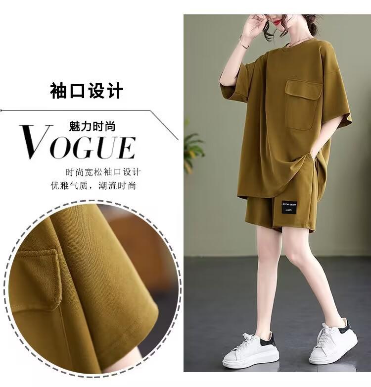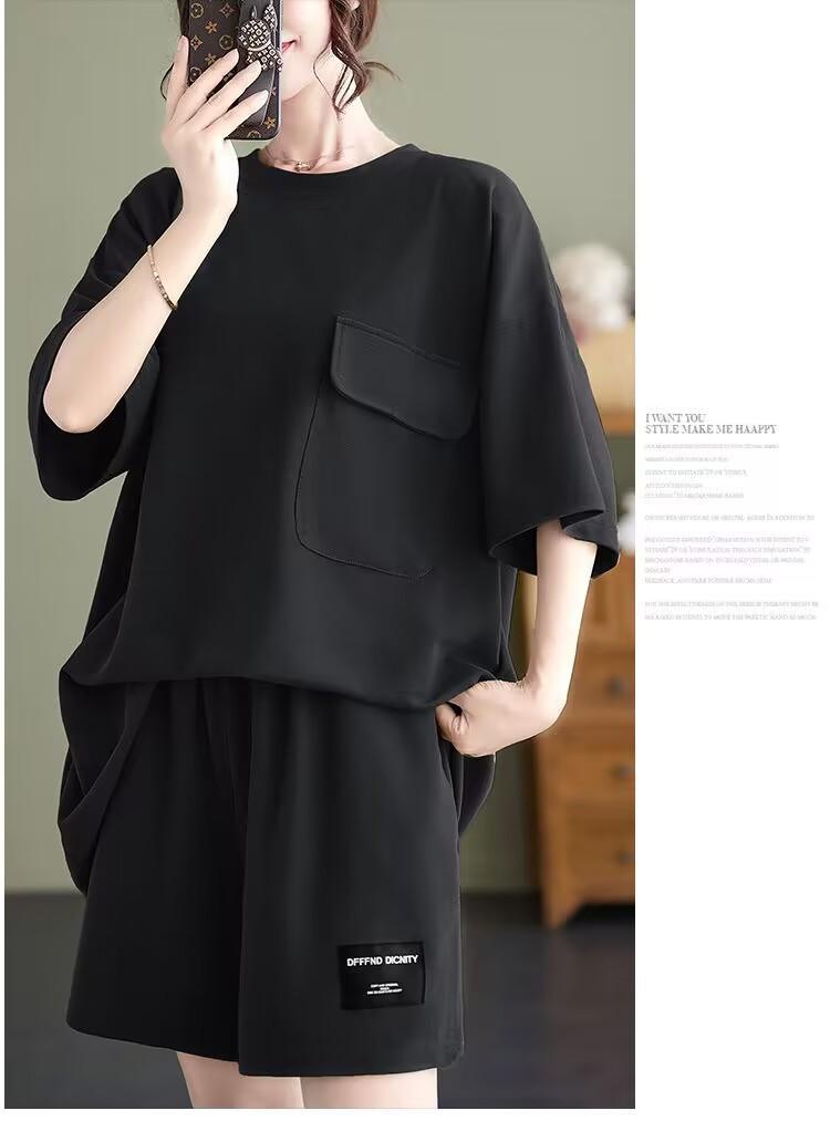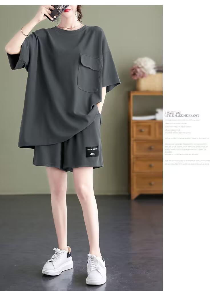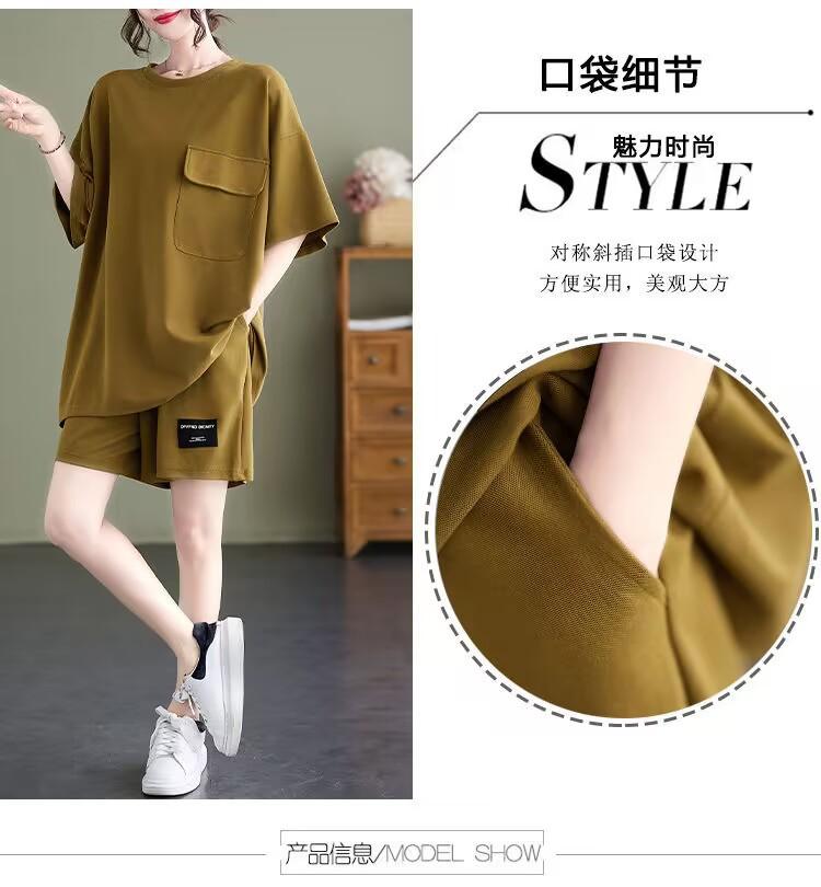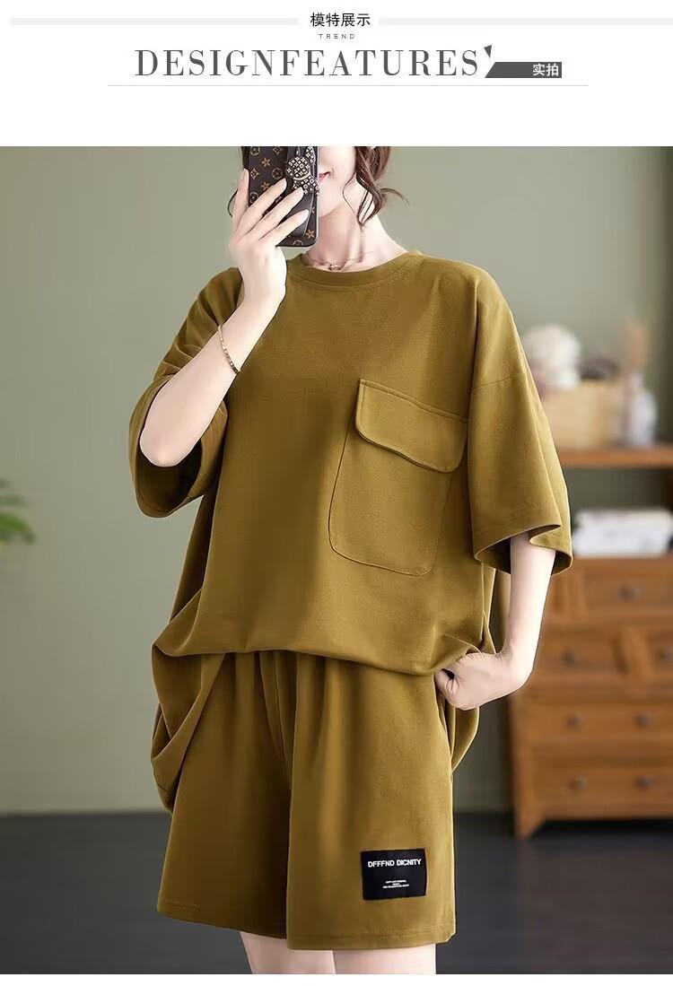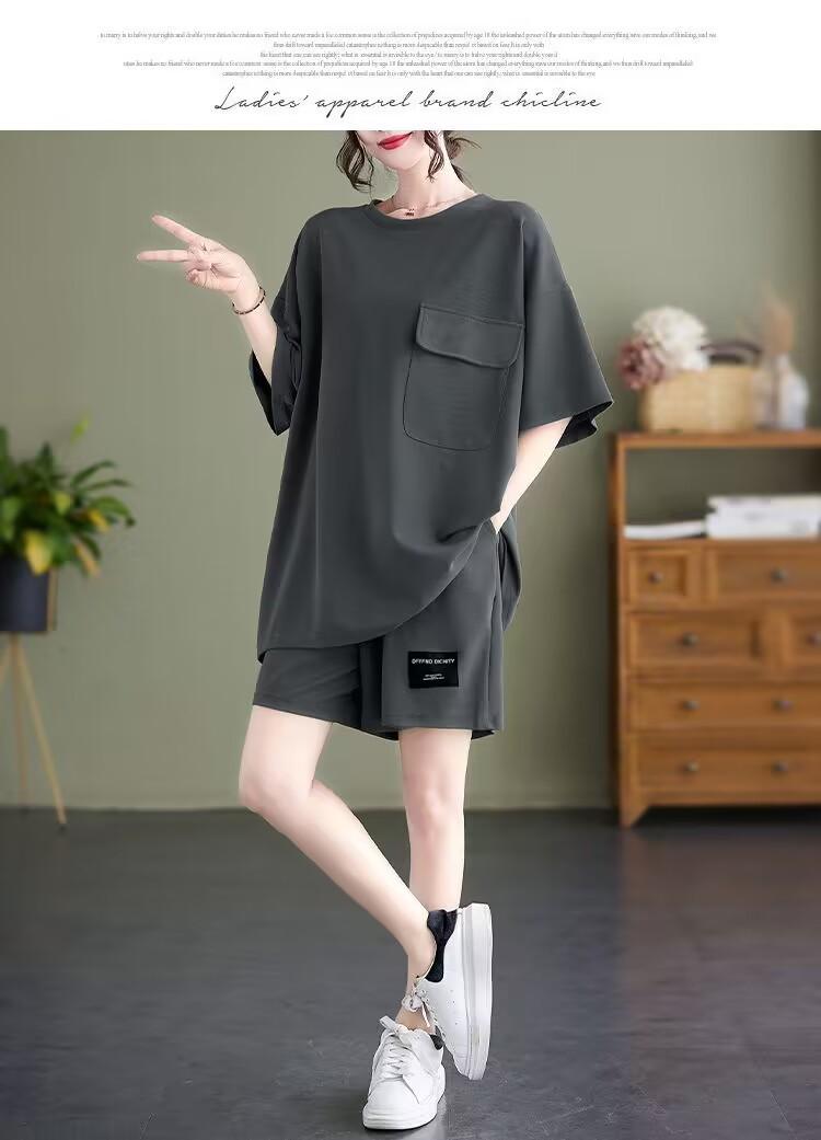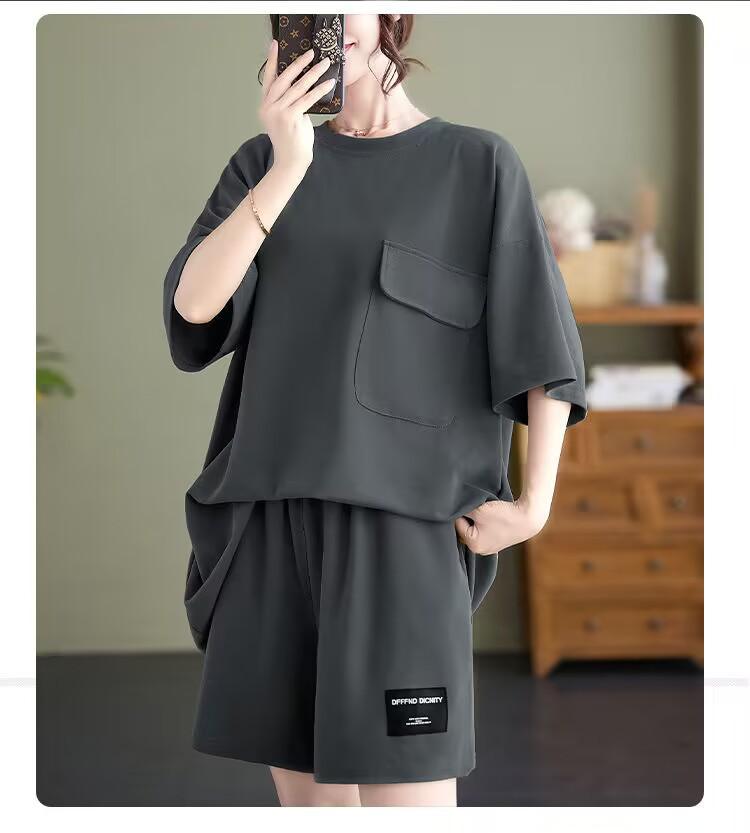 Conjunto de moda para mujer, verano 2024, nuevo diseño de bolsillo, pantalones cortos casuales sueltos de manga corta, conjunto de dos piezas para mujer para comercio exterior
