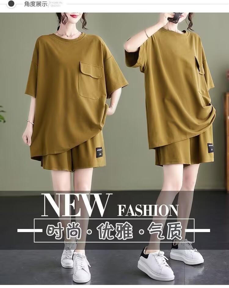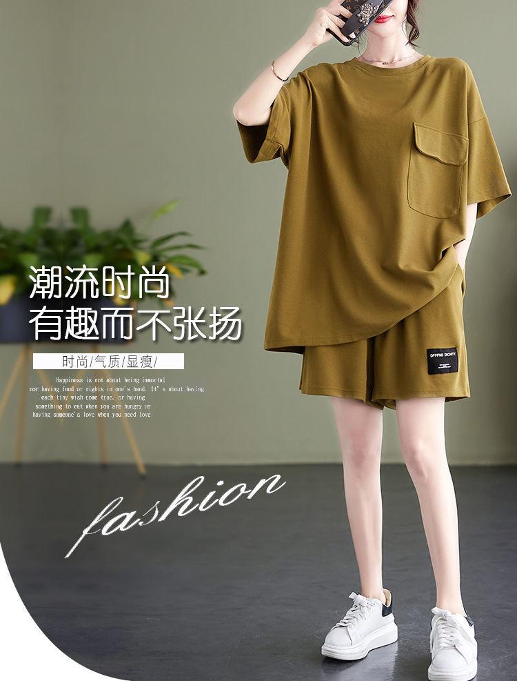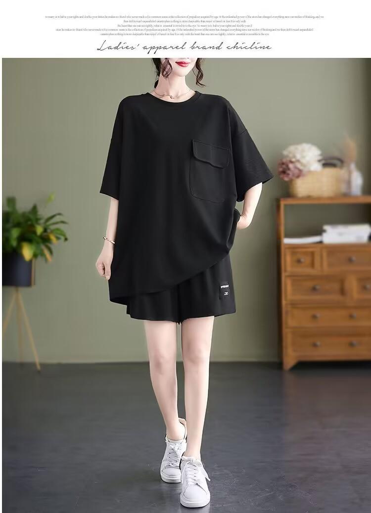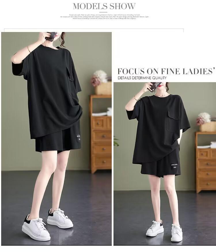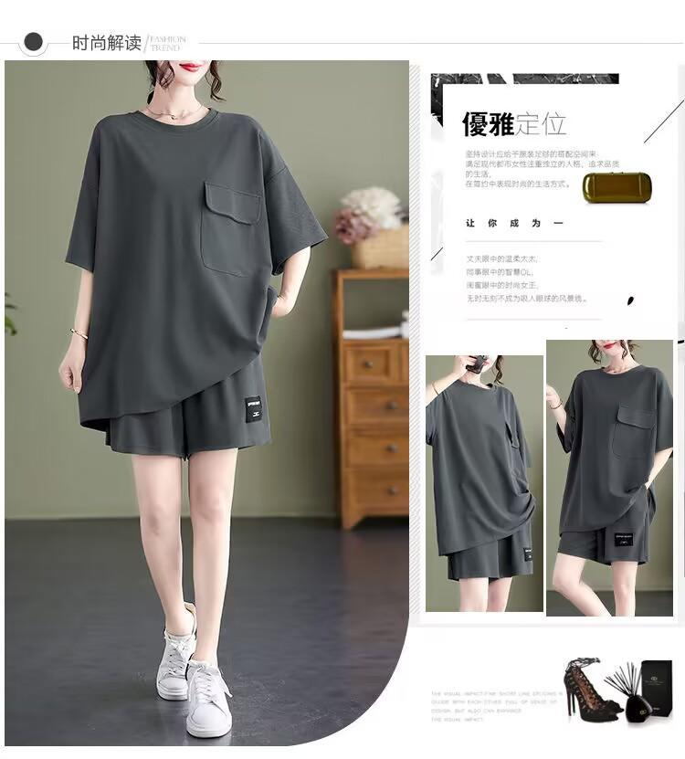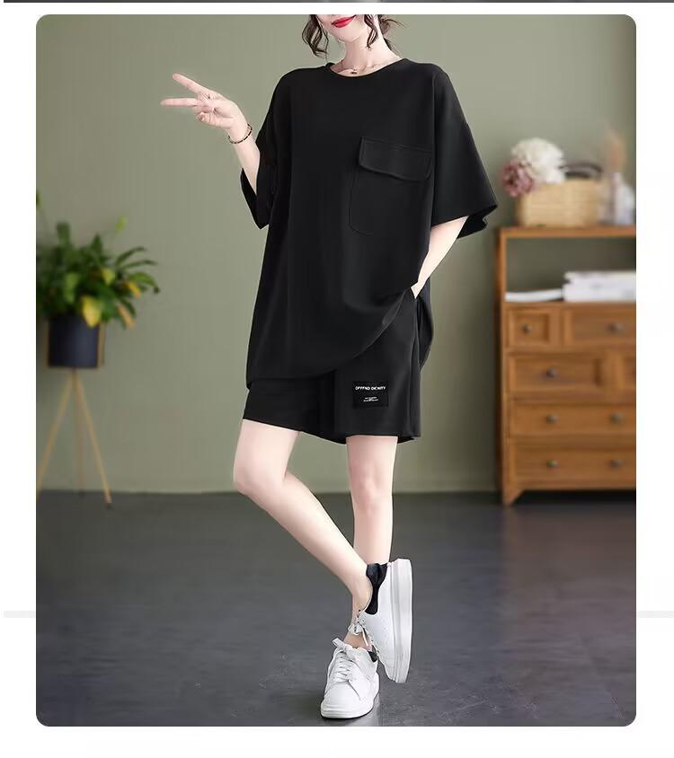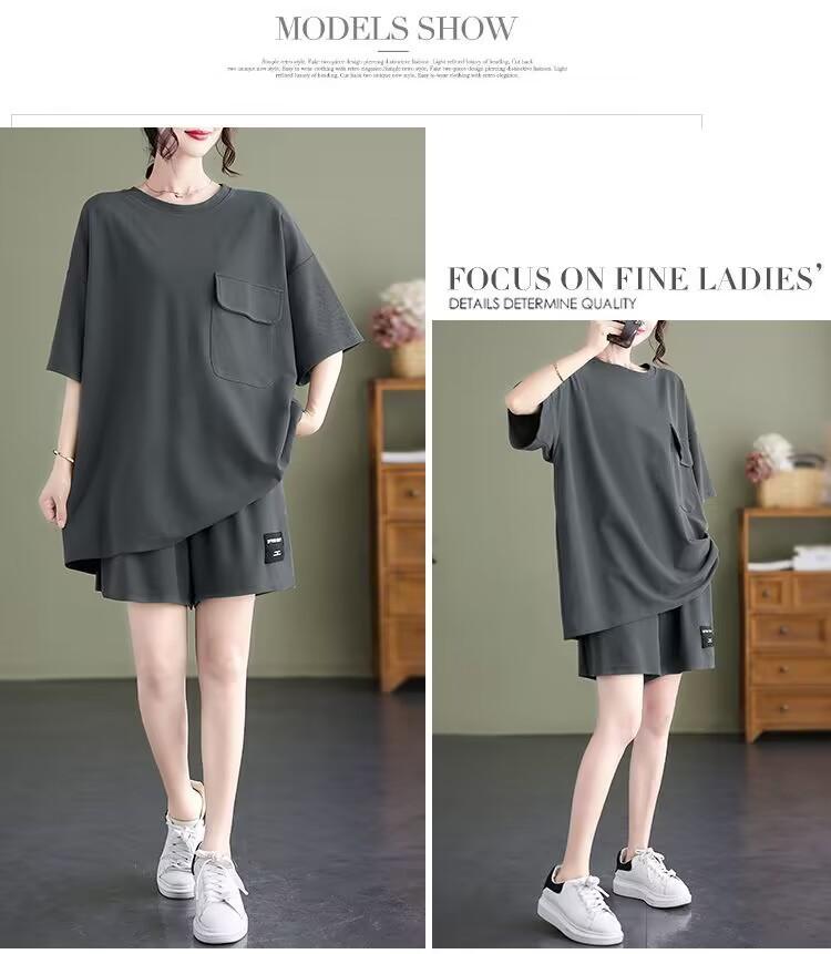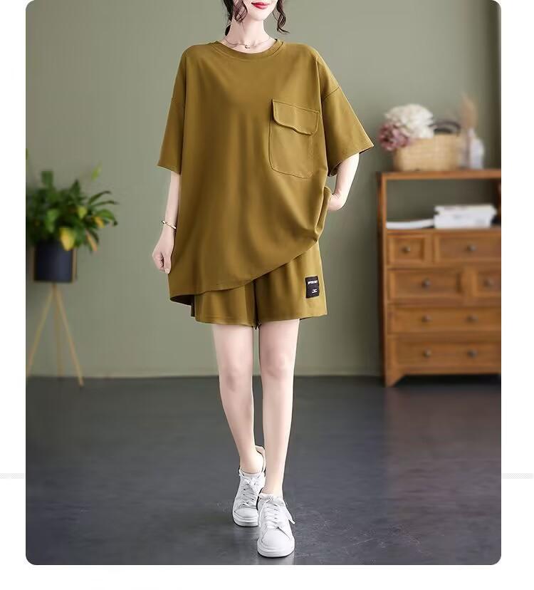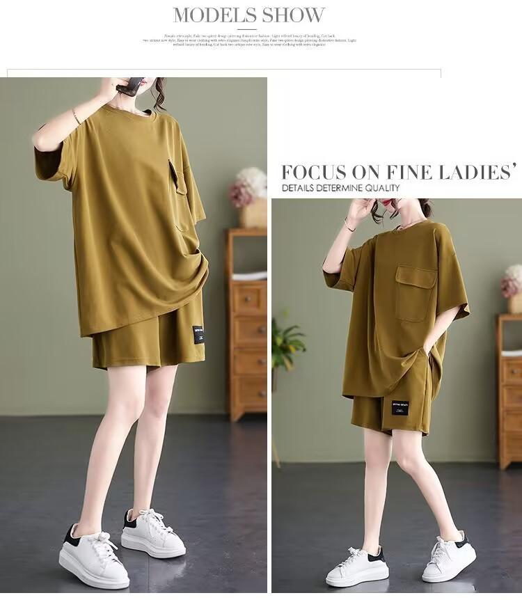 Conjunto de moda para mujer, verano 2024, nuevo diseño de bolsillo, pantalones cortos casuales sueltos de manga corta, conjunto de dos piezas para mujer para comercio exterior