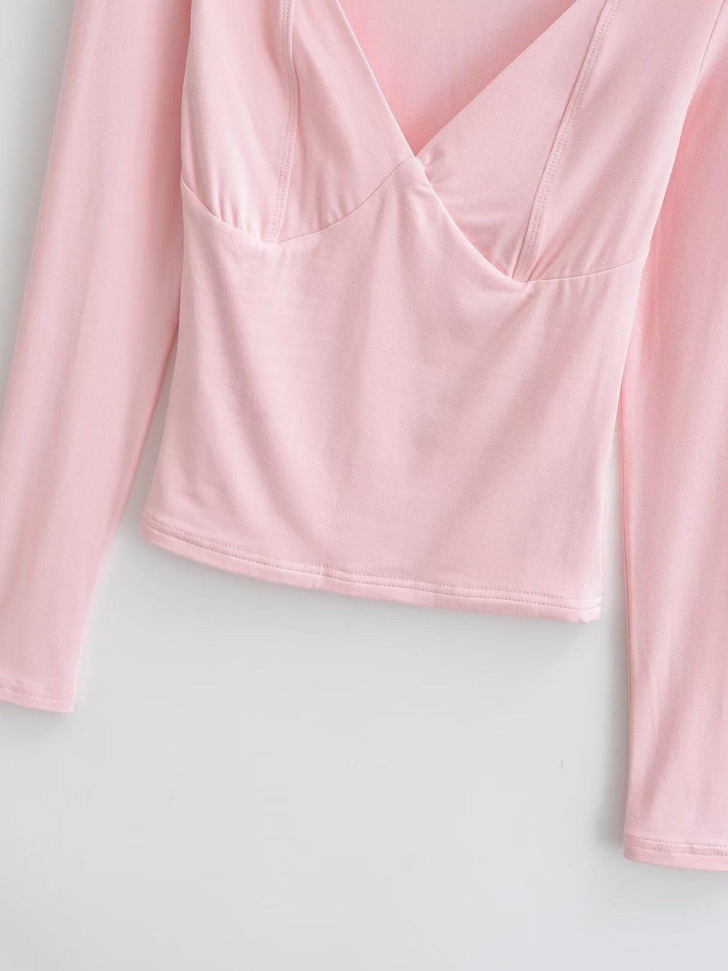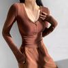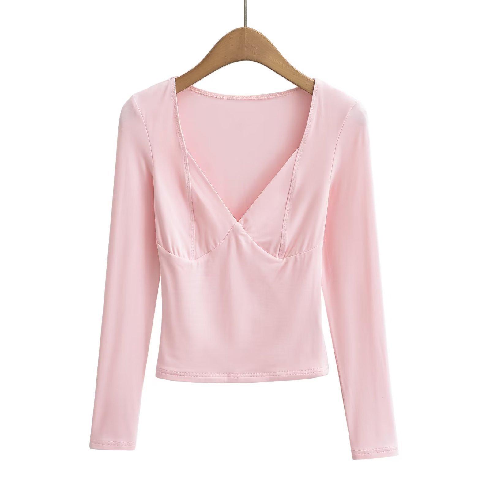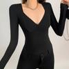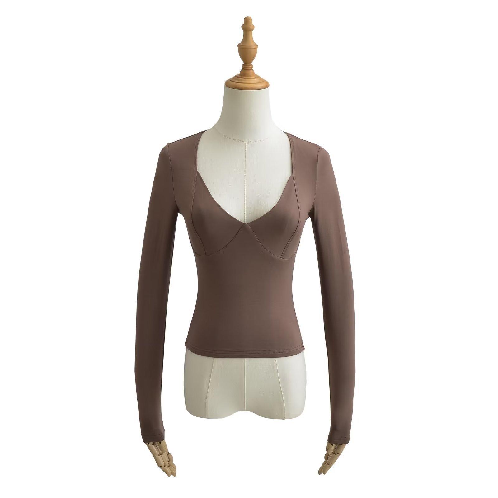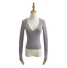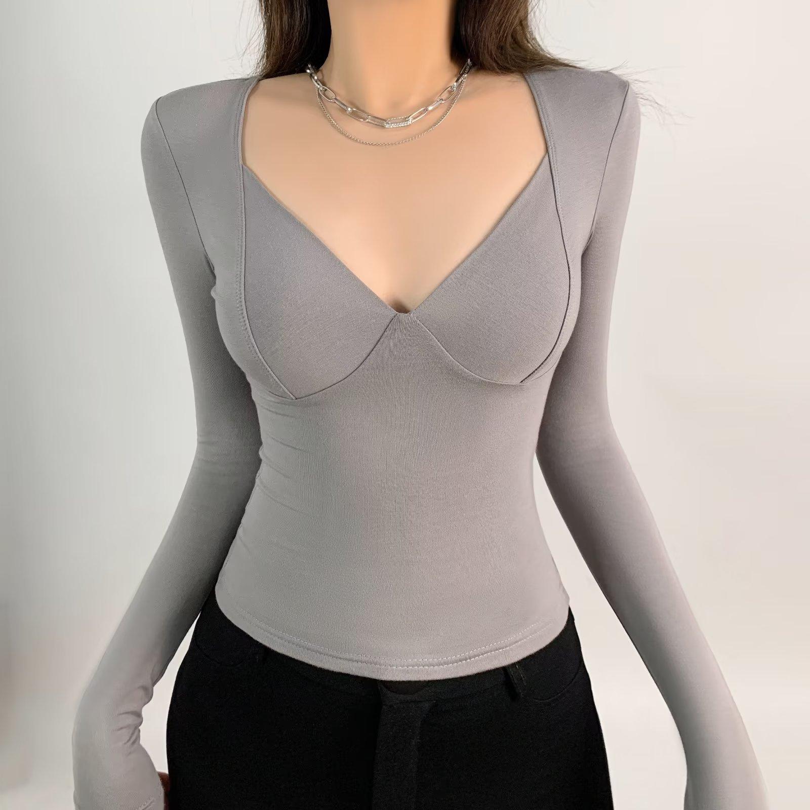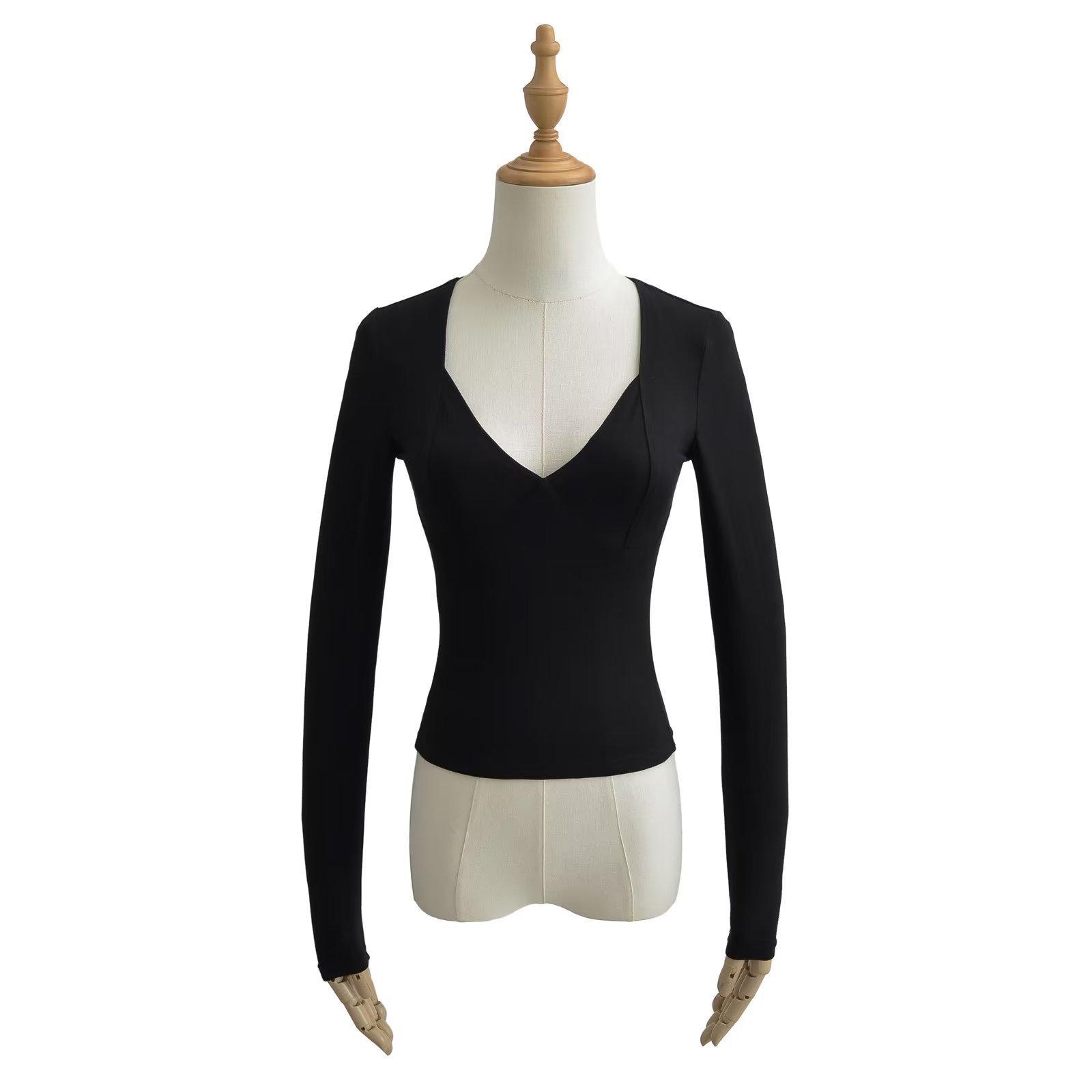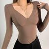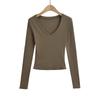 Otoño e invierno 2023 Nueva camiseta básica sexy de manga larga ajustada de color sólido con cuello en V profundo para mujer europea y americana