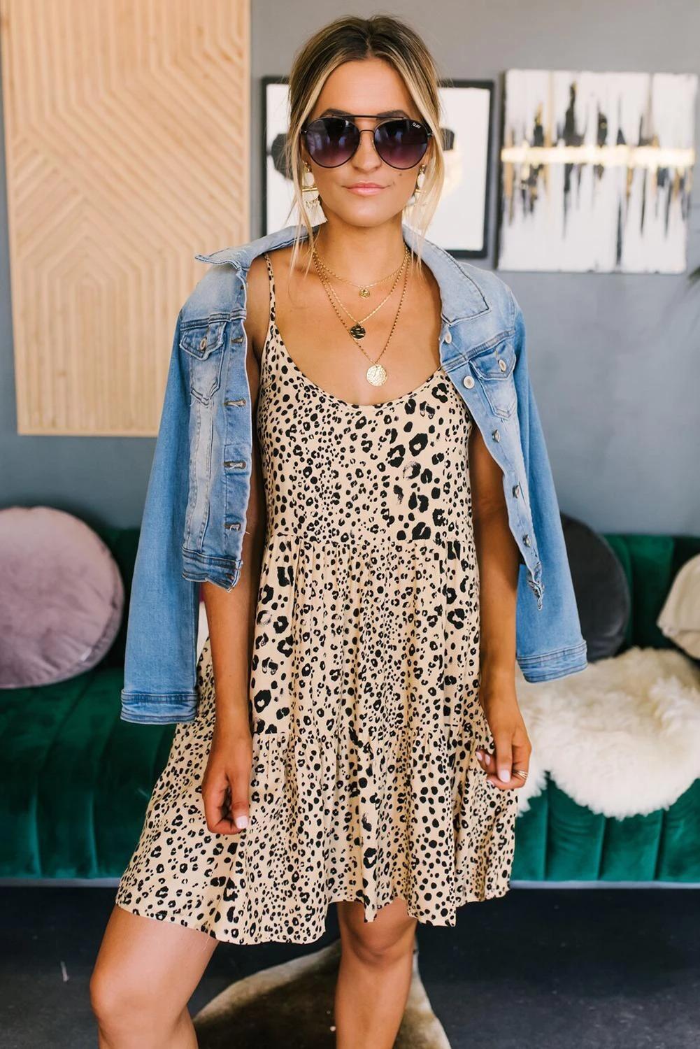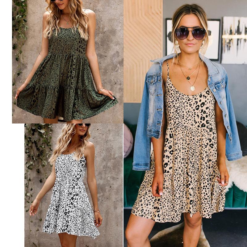 Nuevo vestido sexy de mujer de comercio exterior europeo y americano con estampado de leopardo, tirantes delgados, falda línea A, suministro directo de fábrica