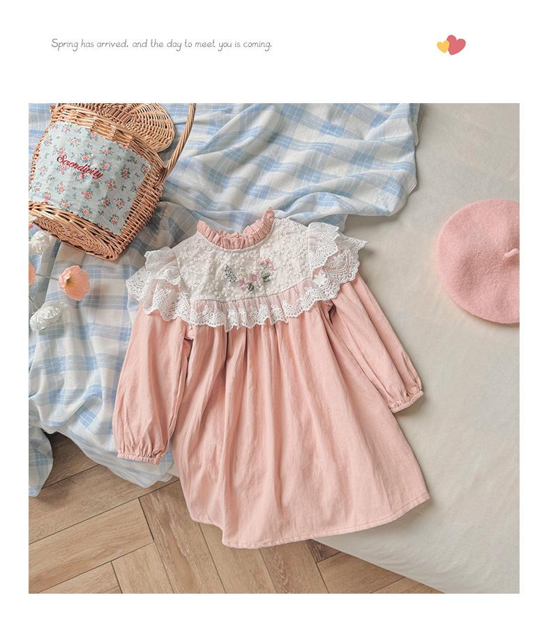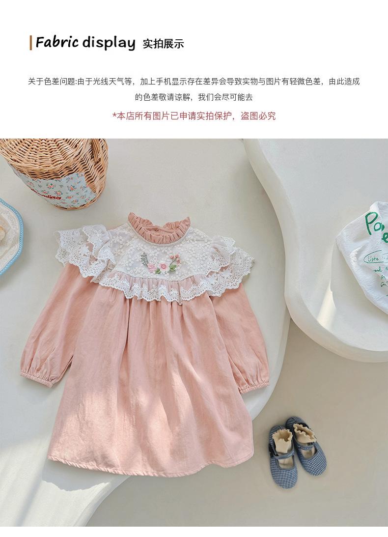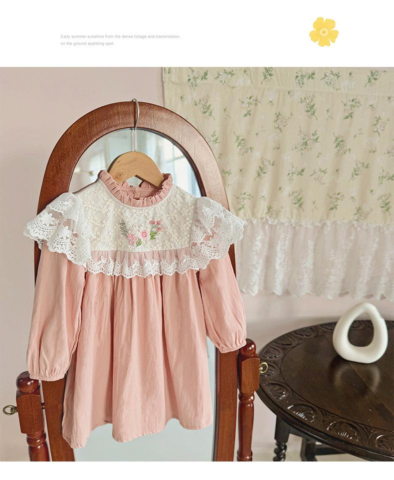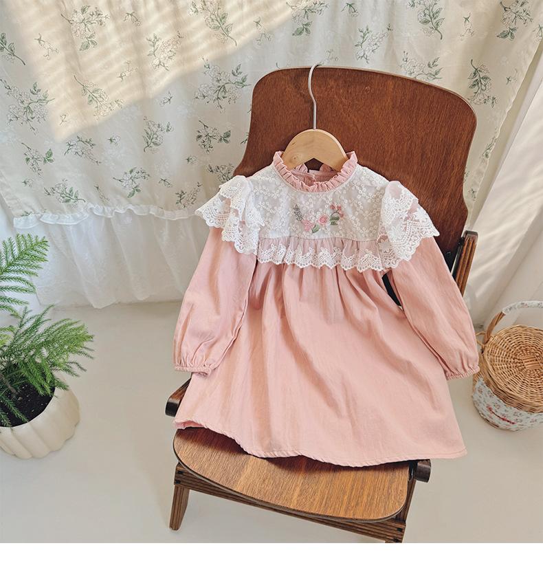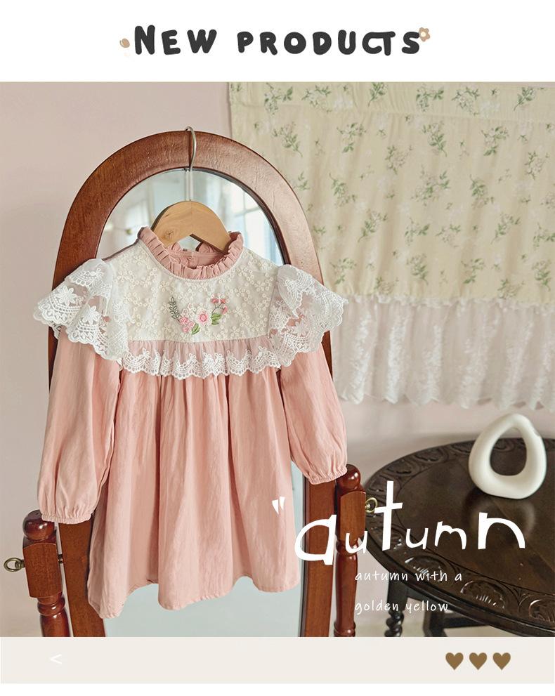 Vestido de niña con bordado de flores para niña, ropa coreana para niña, otoño 2024, cuello alto, manga larga, encaje, dulce princesa