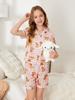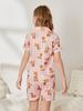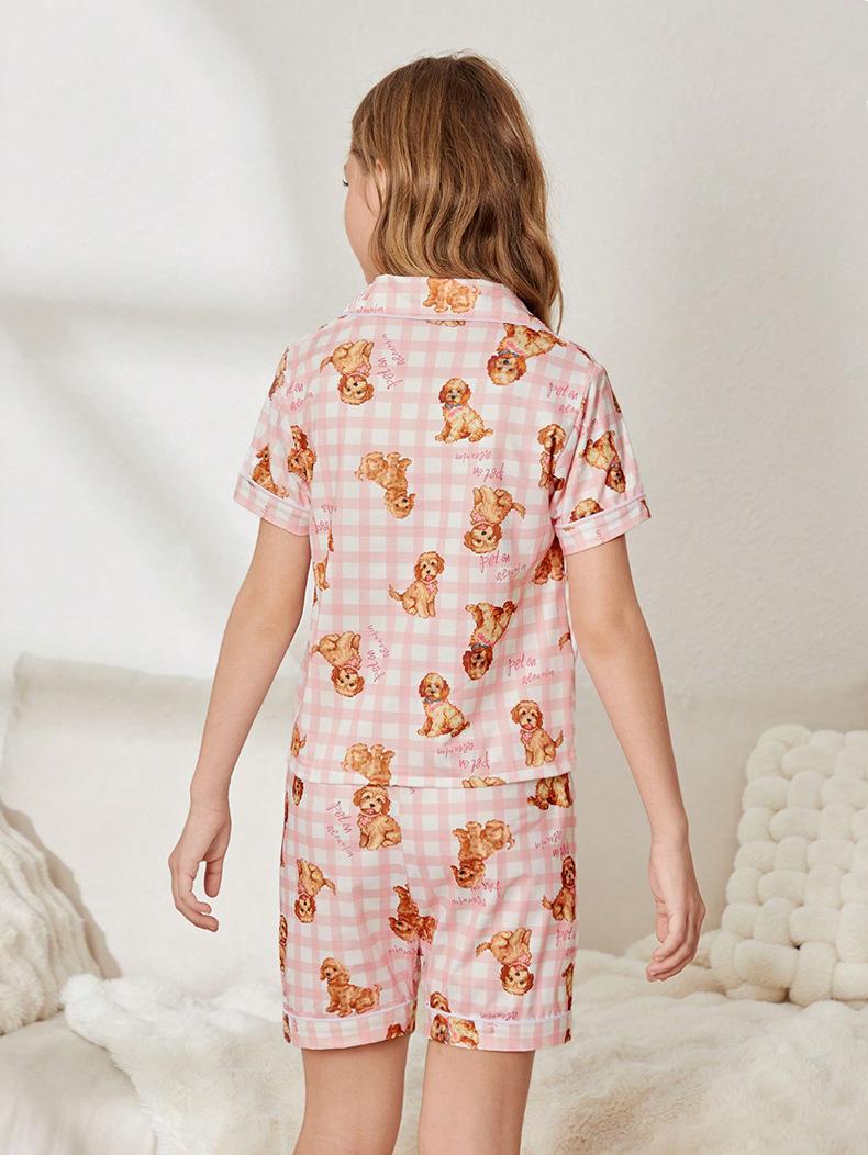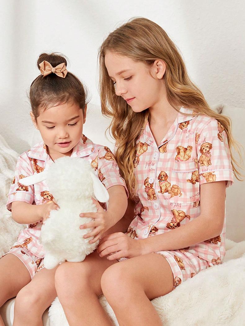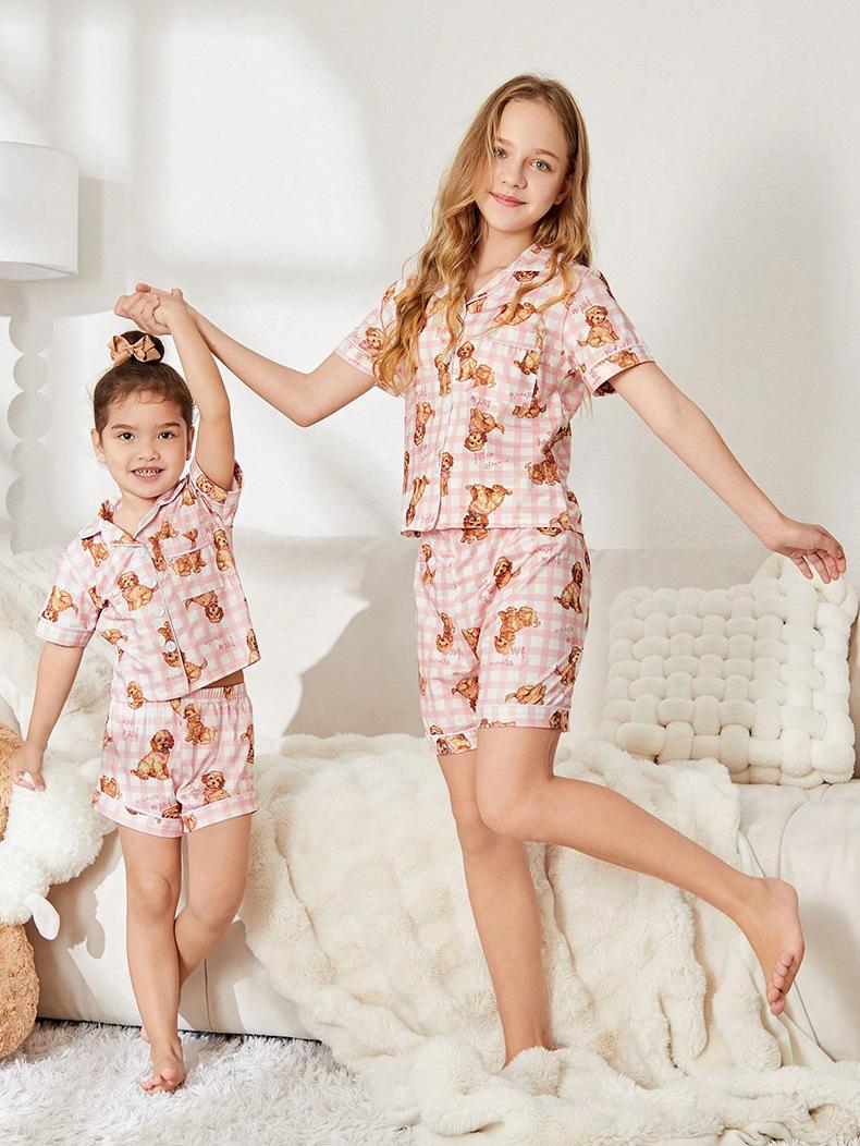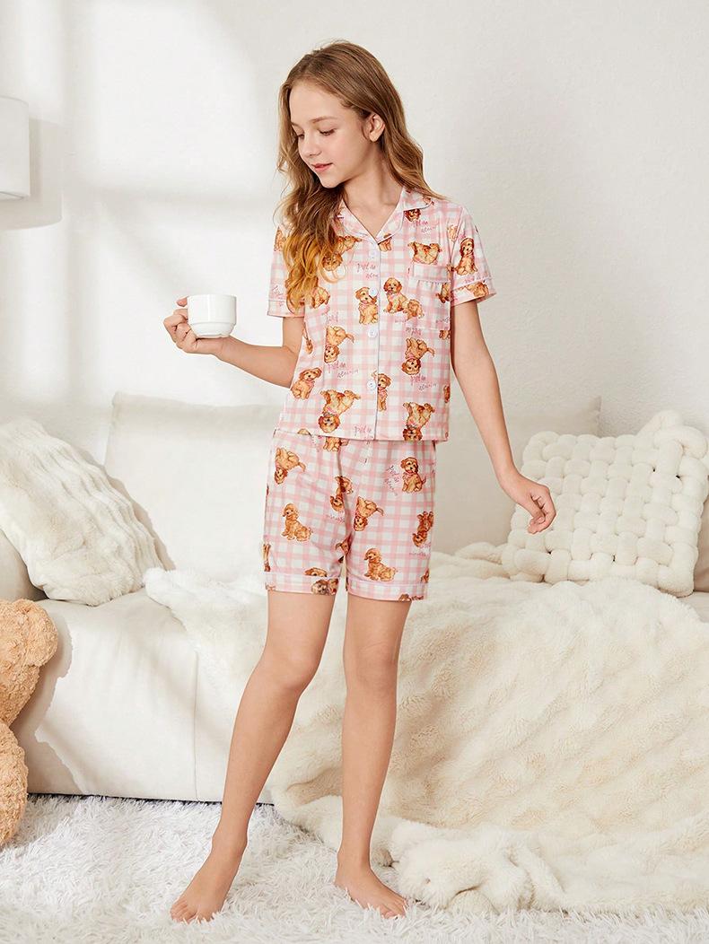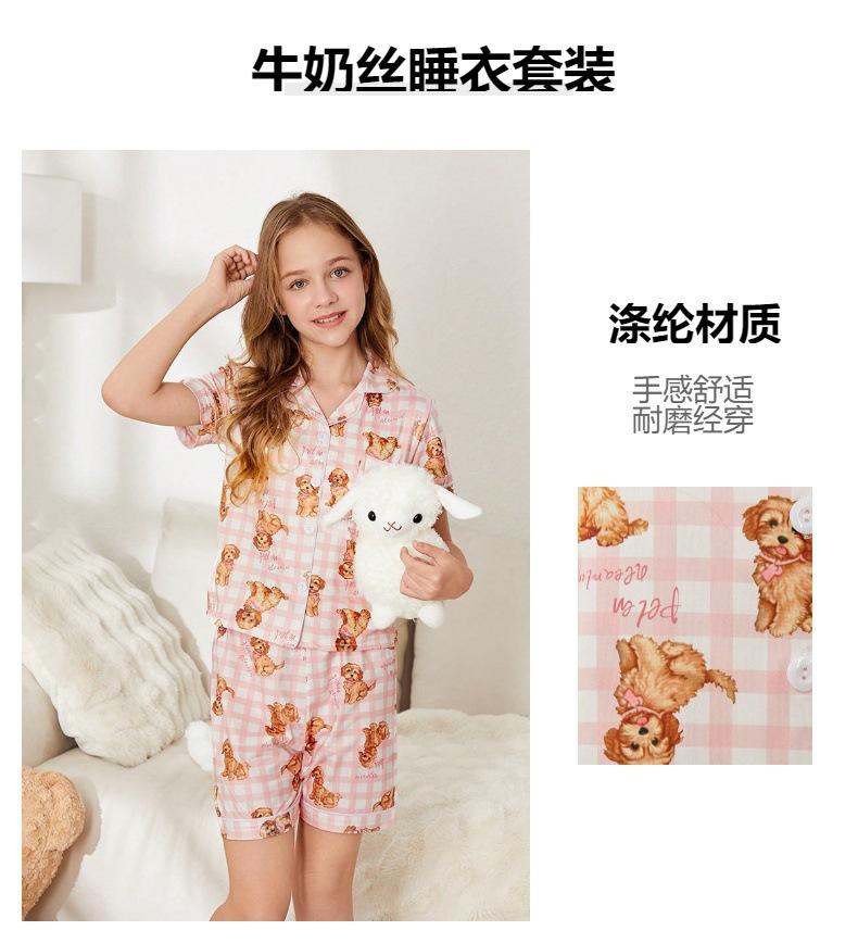 Pijama de seda de leche para niñas, cárdigan con estampado de oso de dibujos animados, solapa, manga corta, ropa de casa para niños, novedad de verano