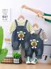 Traje de otoño para bebé 2024 nuevo estilo niños primavera y otoño rayas manga larga peto de mezclilla dos piezas moderno