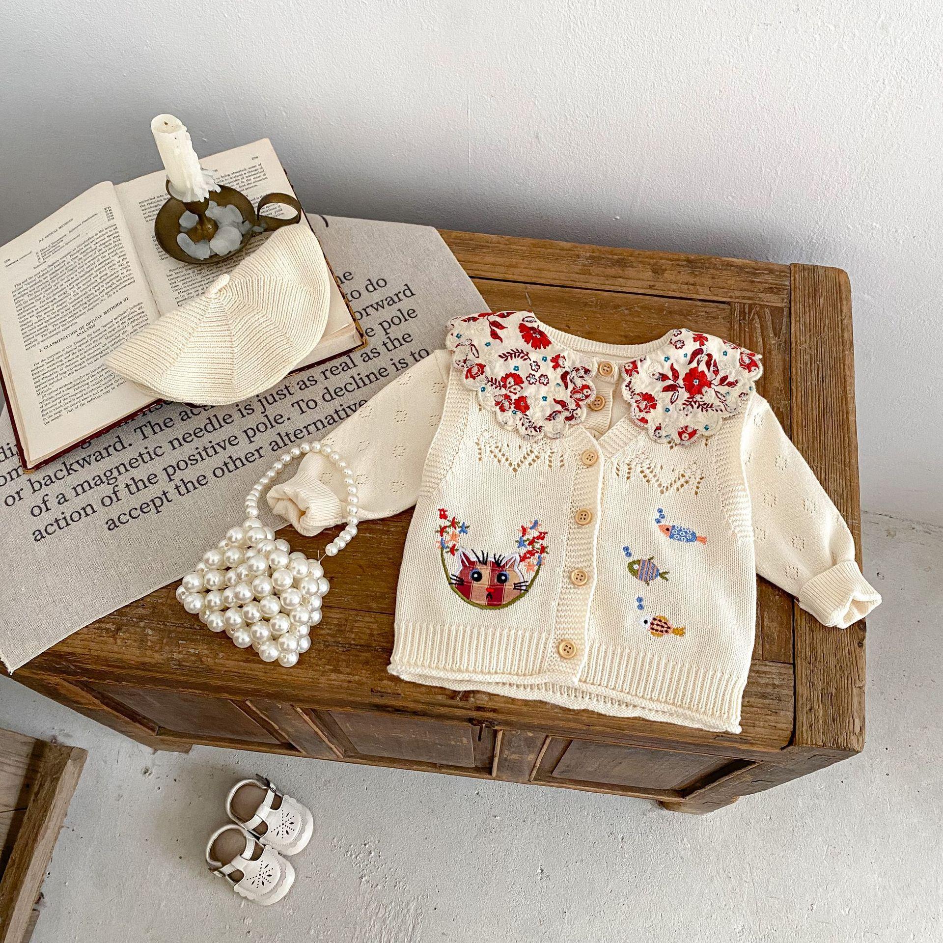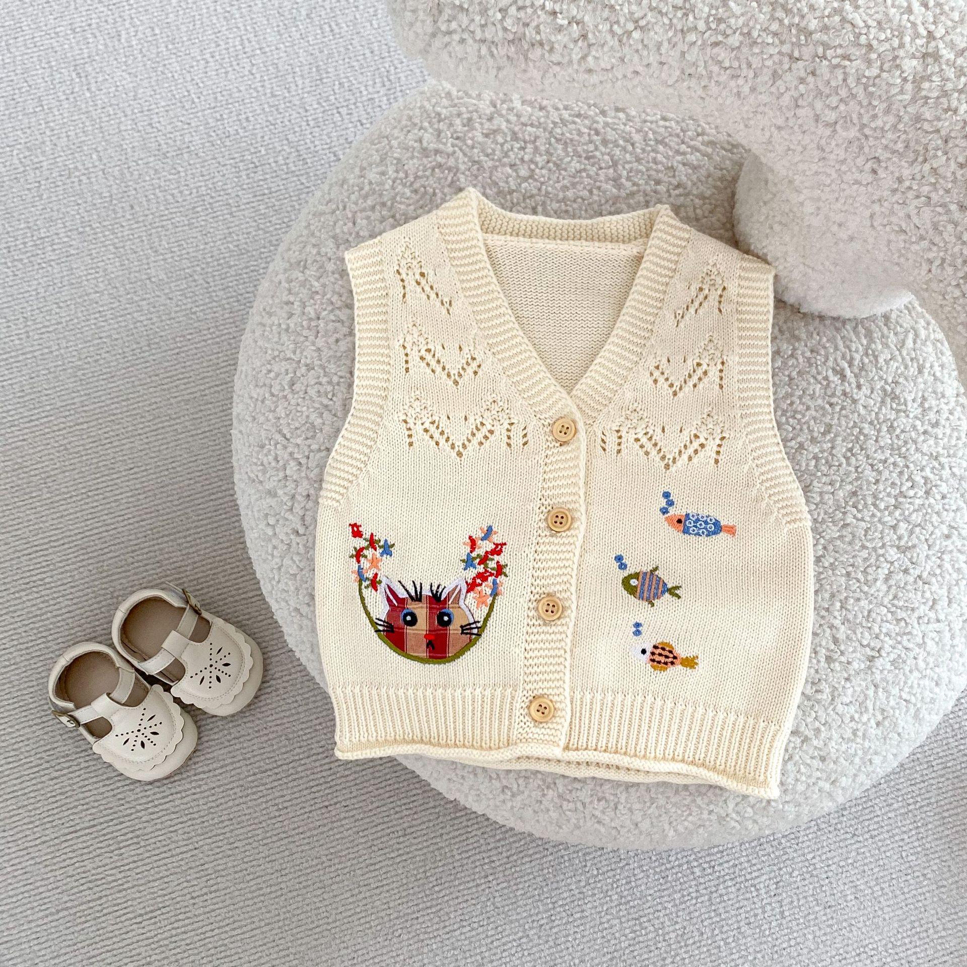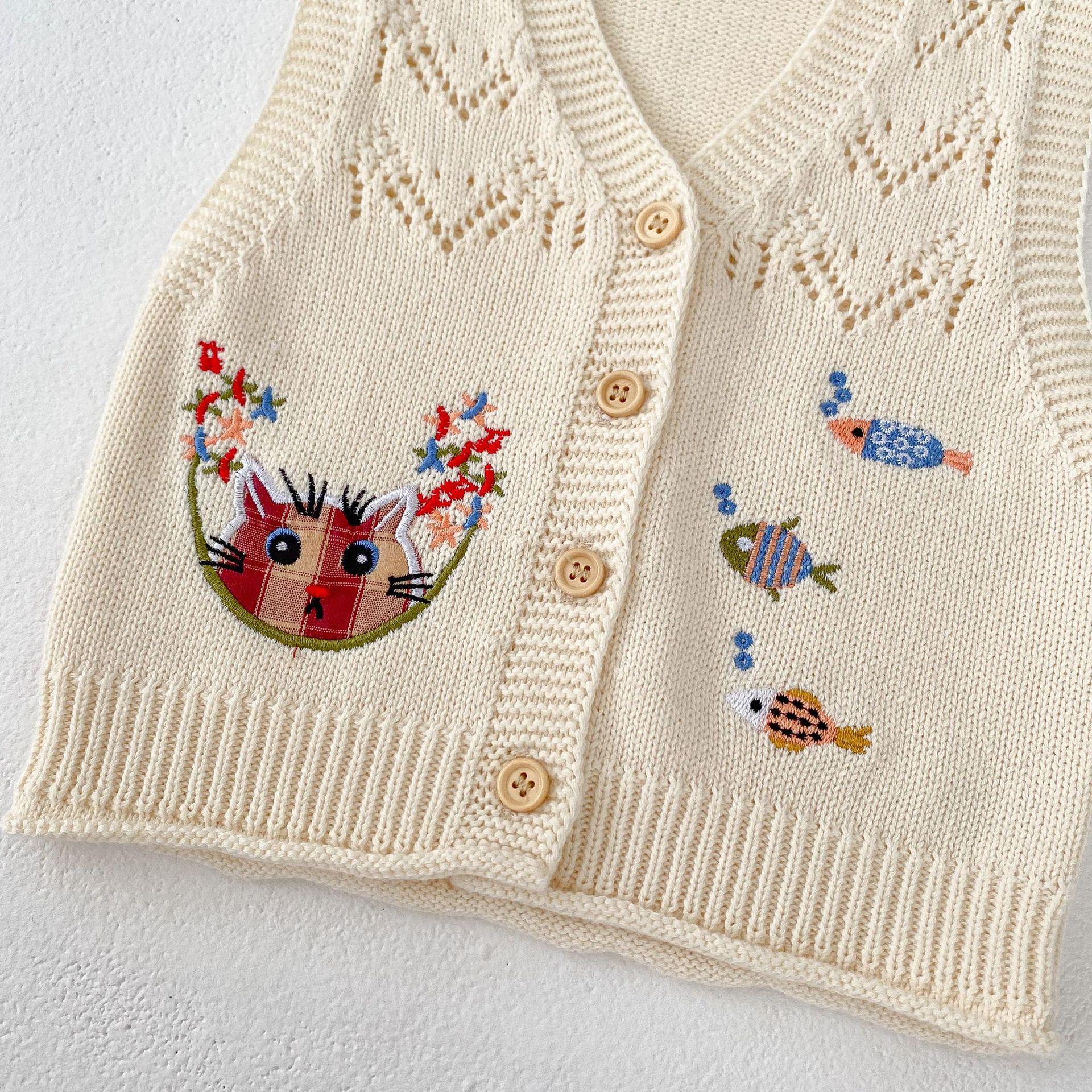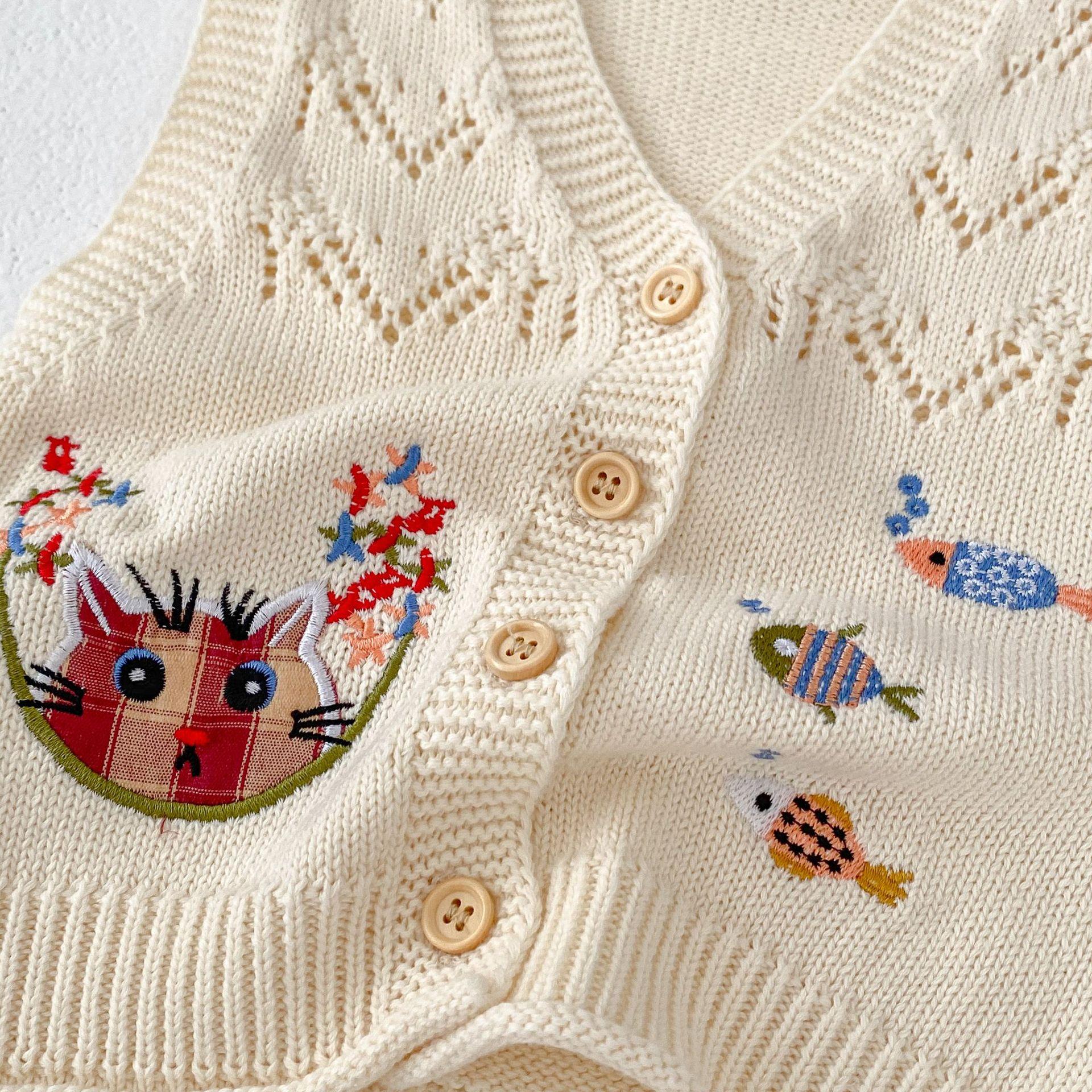 Ropa para Niños 2025 Bebé Niña Otoño Algodón Gasa Cárdigan Cuello en V Chaleco Tejido Bordado de Gato Suéter Infantil 0-3 Años