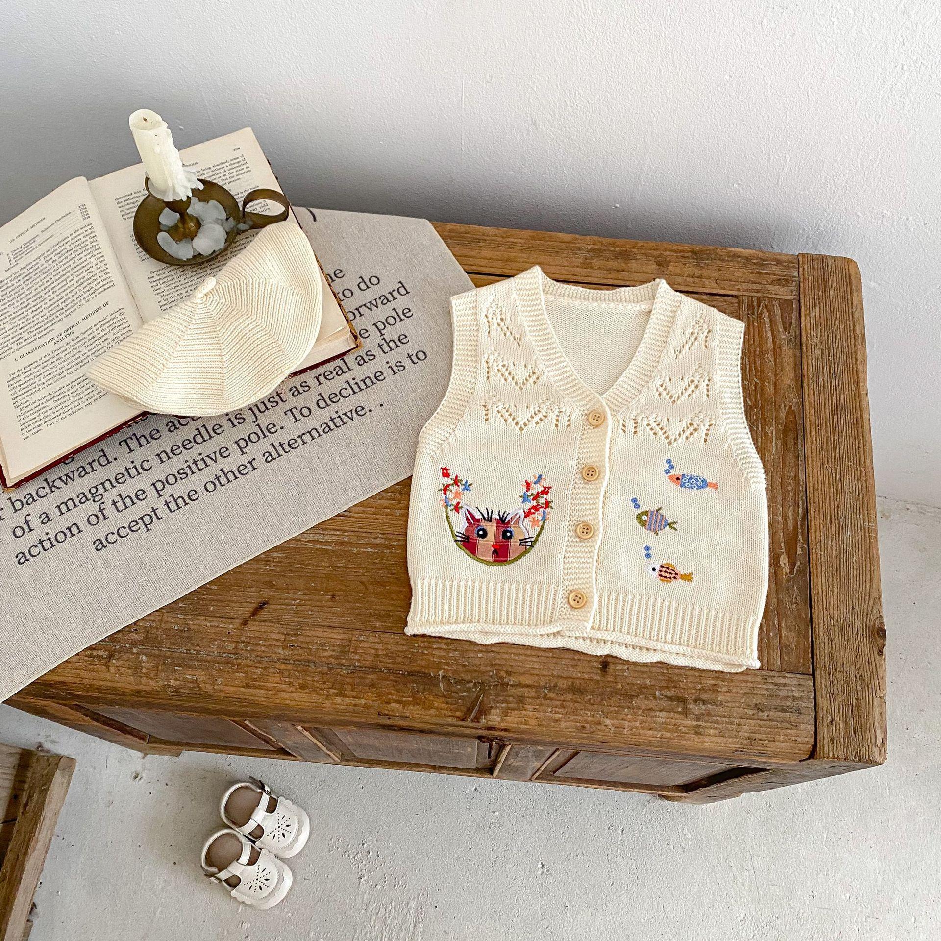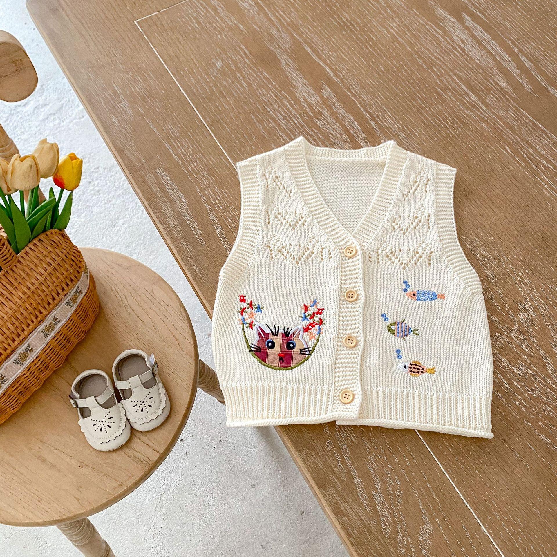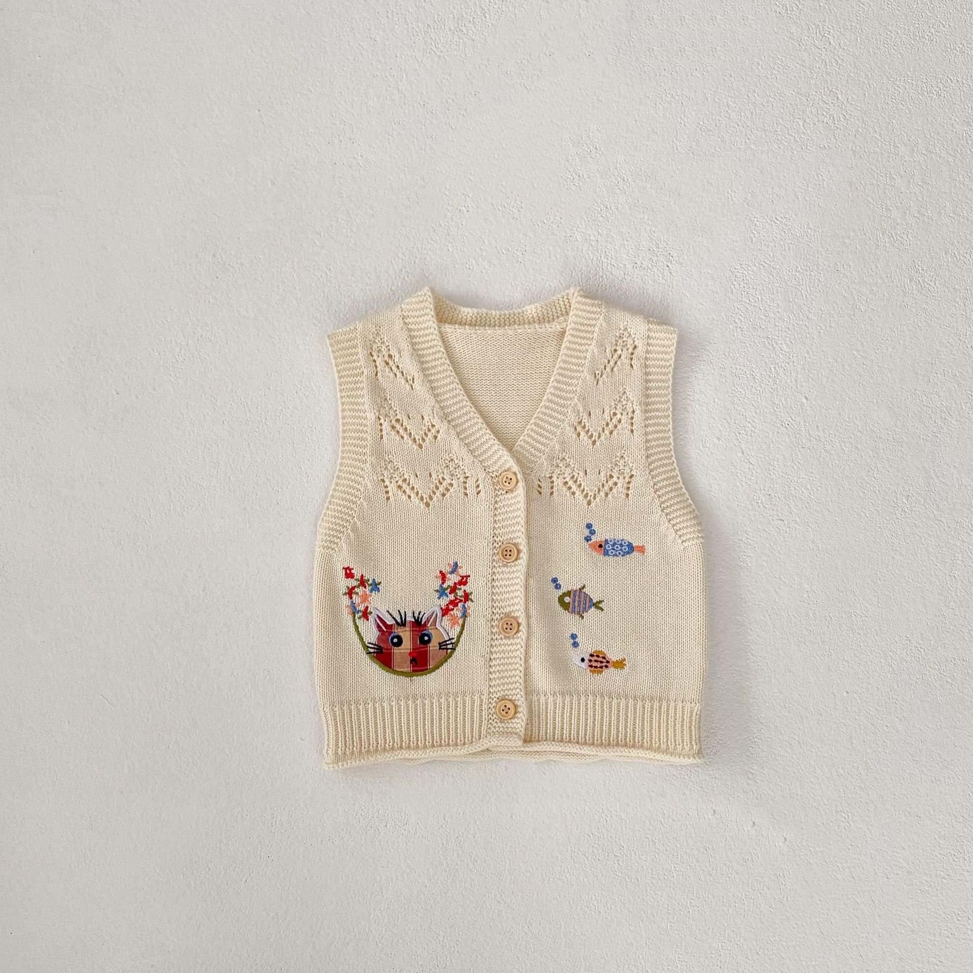 Ropa para Niños 2025 Bebé Niña Otoño Algodón Gasa Cárdigan Cuello en V Chaleco Tejido Bordado de Gato Suéter Infantil 0-3 Años