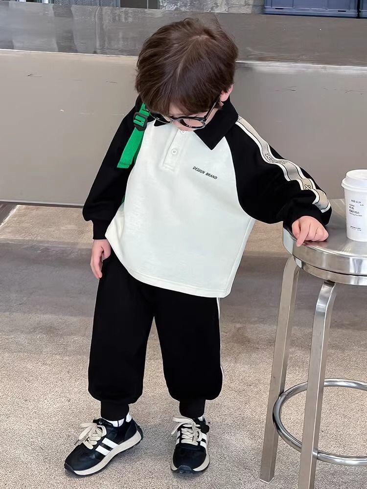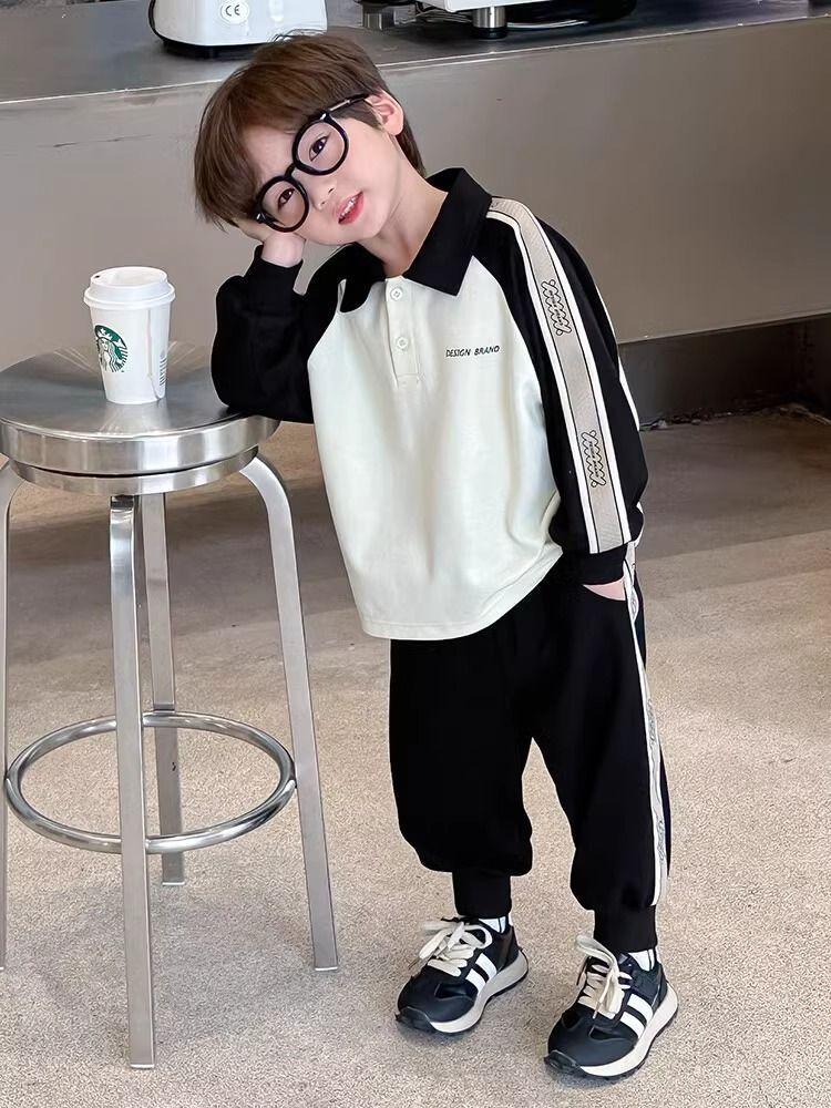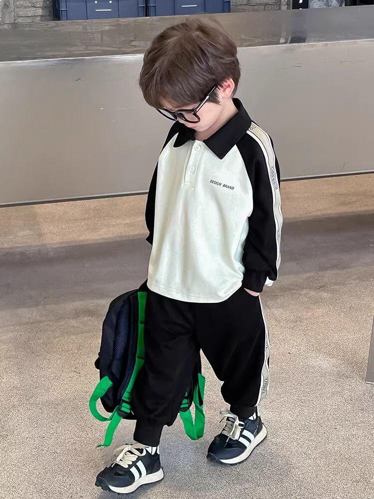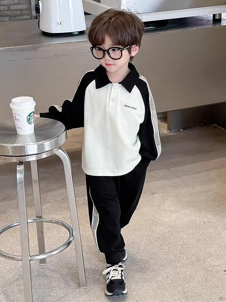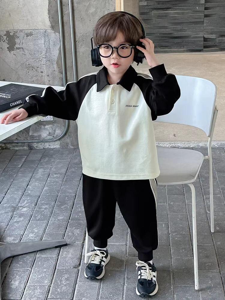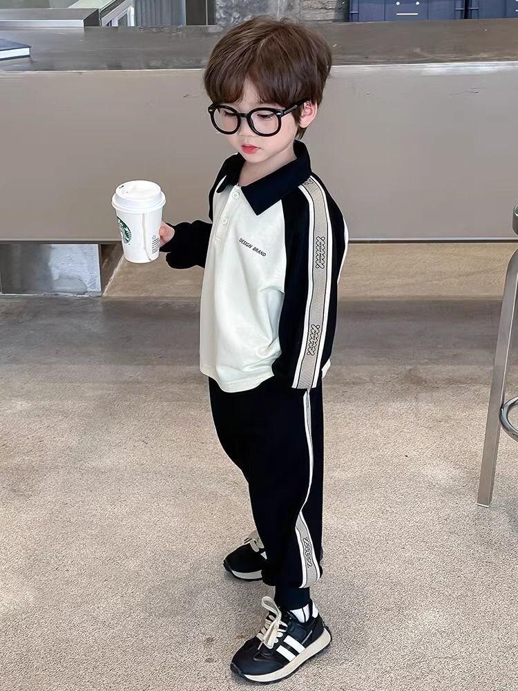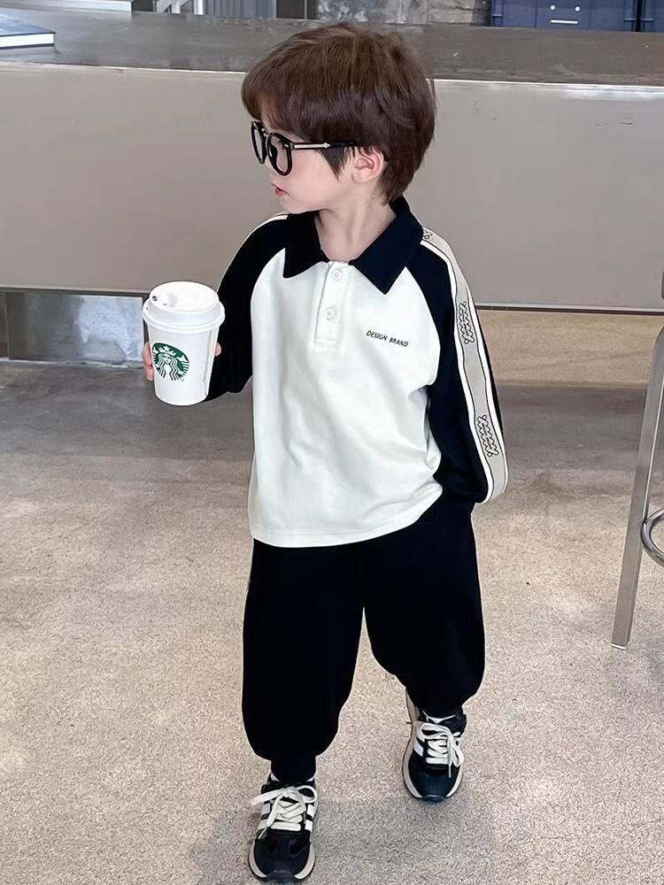 2024 nuevo traje de solapa de estilo occidental para niños primavera y otoño, conjunto de dos piezas de suéter y camisa POLO para bebé niño primavera y otoño