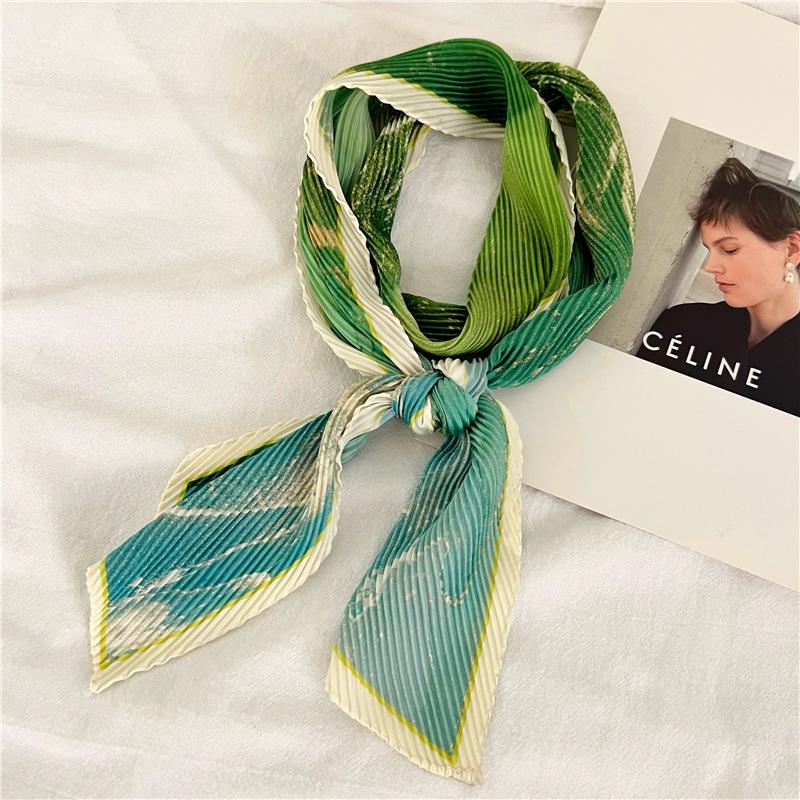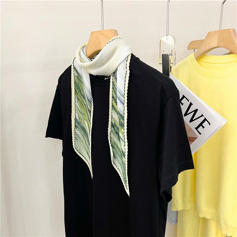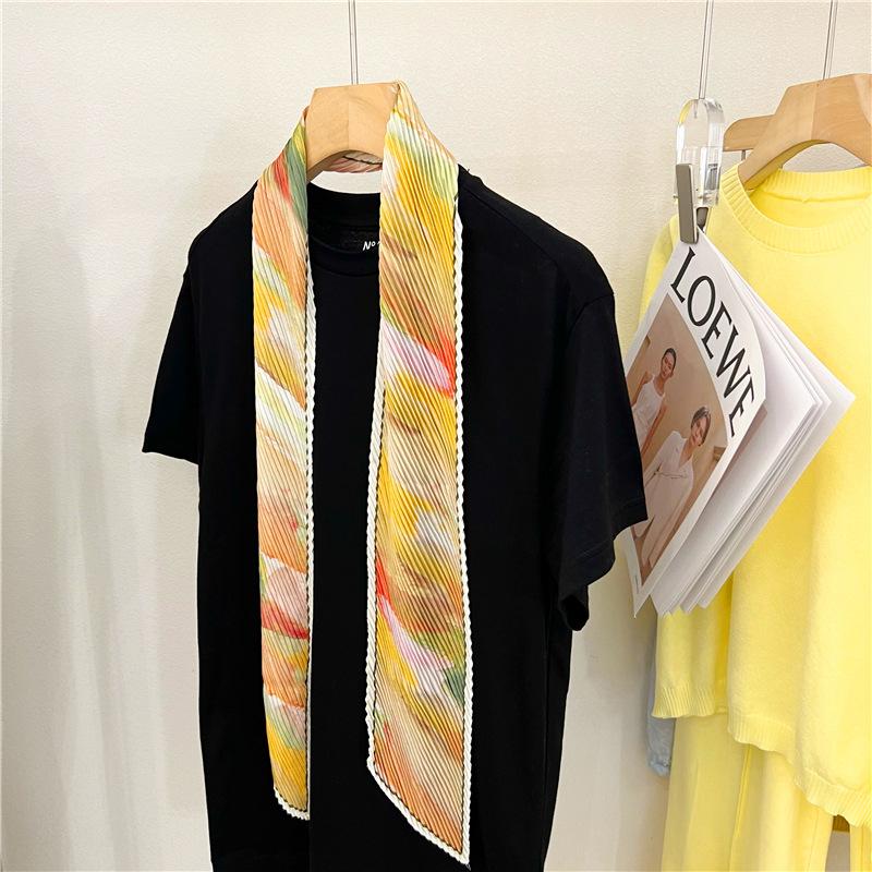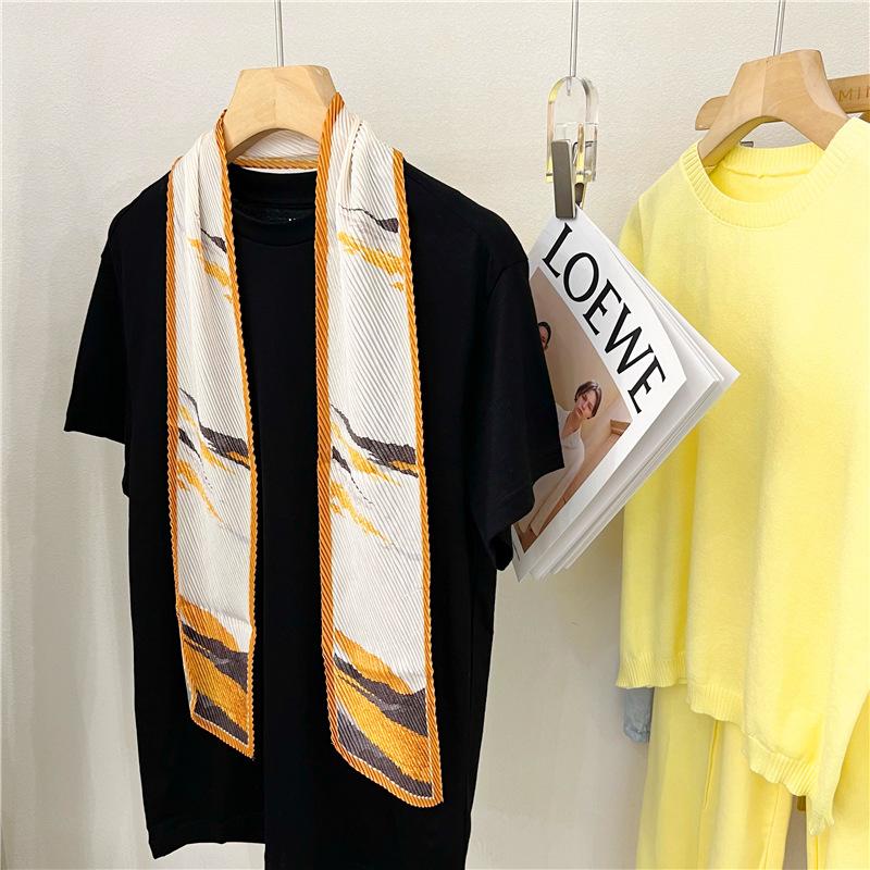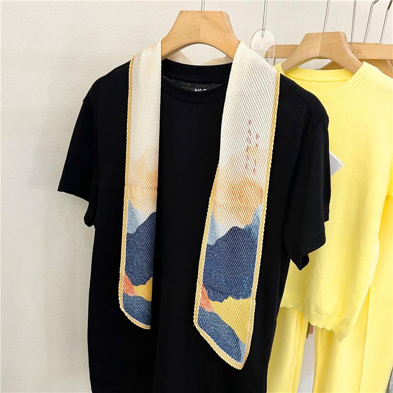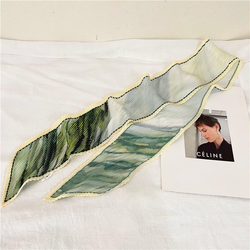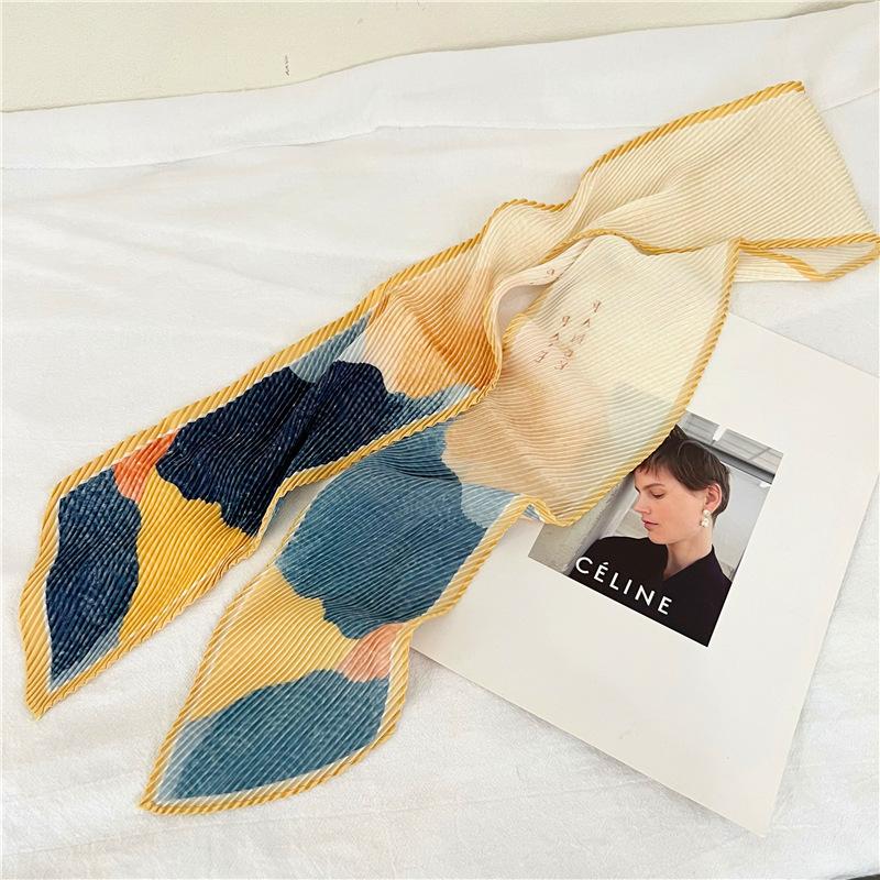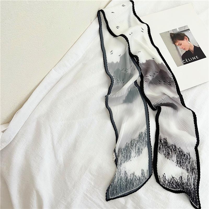 Bufanda larga de seda arrugada con pintura al óleo de paisaje de primavera y otoño para mujer, cinturón decorativo para el cabello, bufanda protectora para el cuello, bufanda pequeña, bolsa para atar