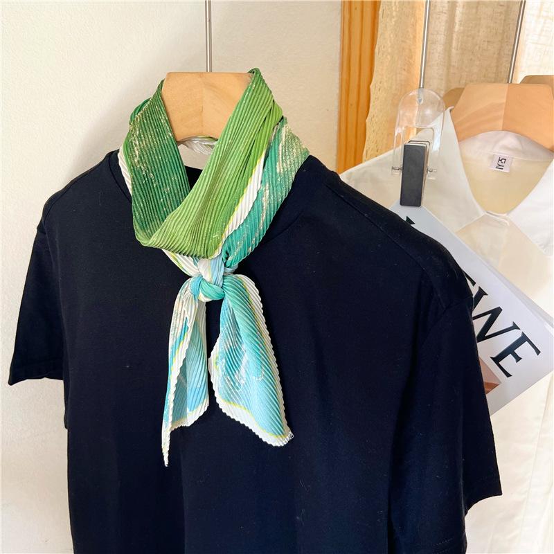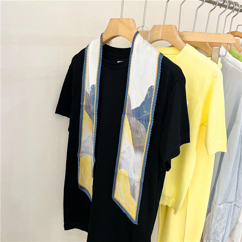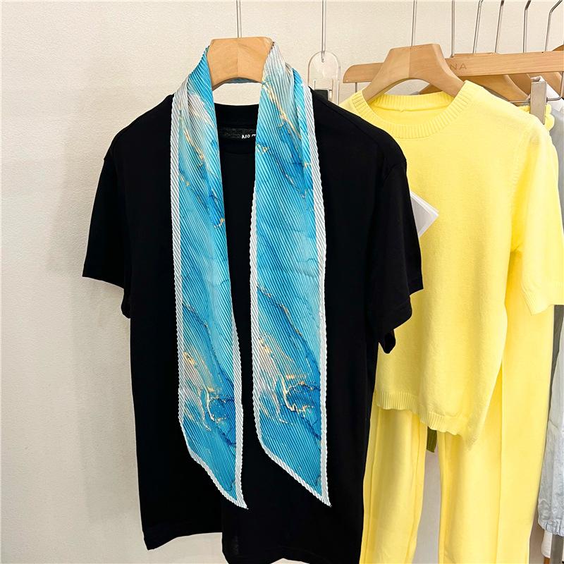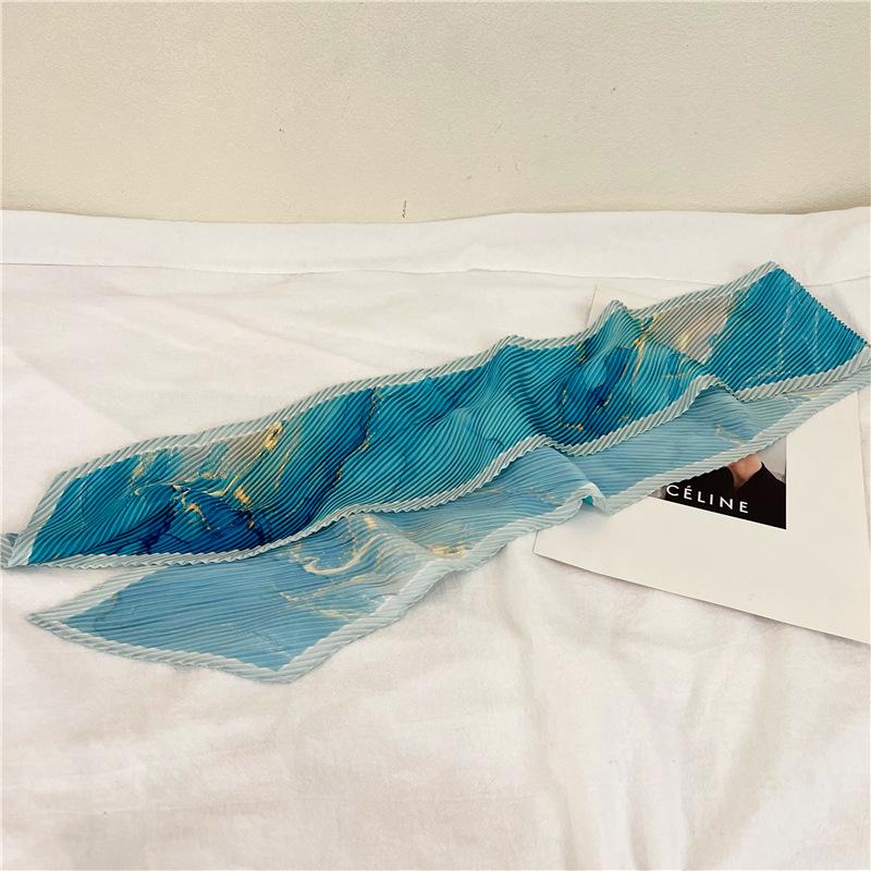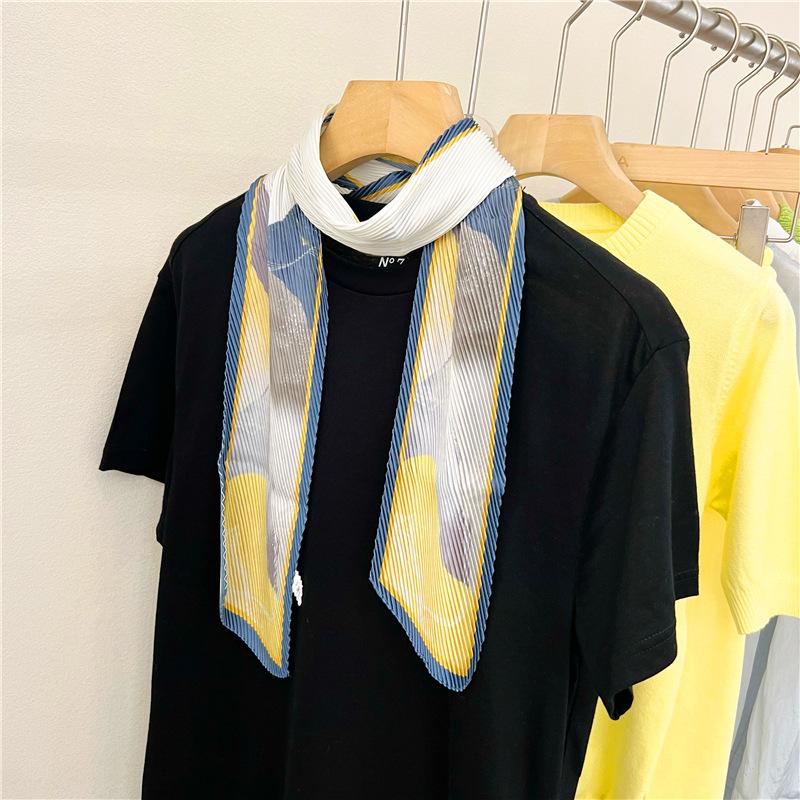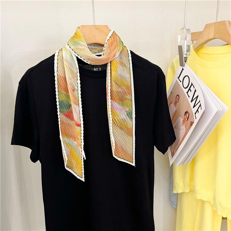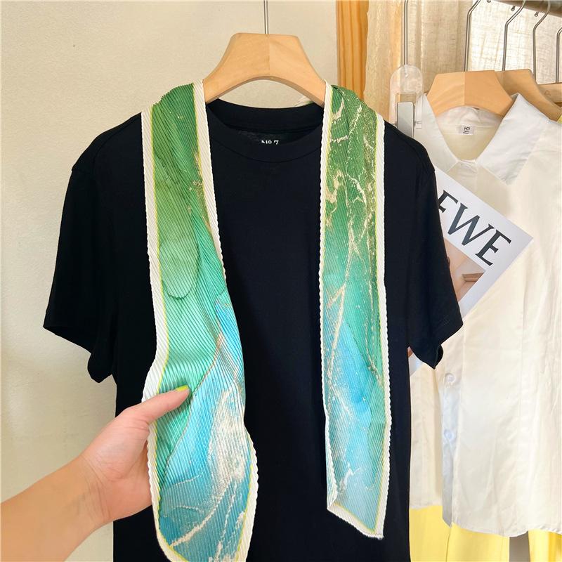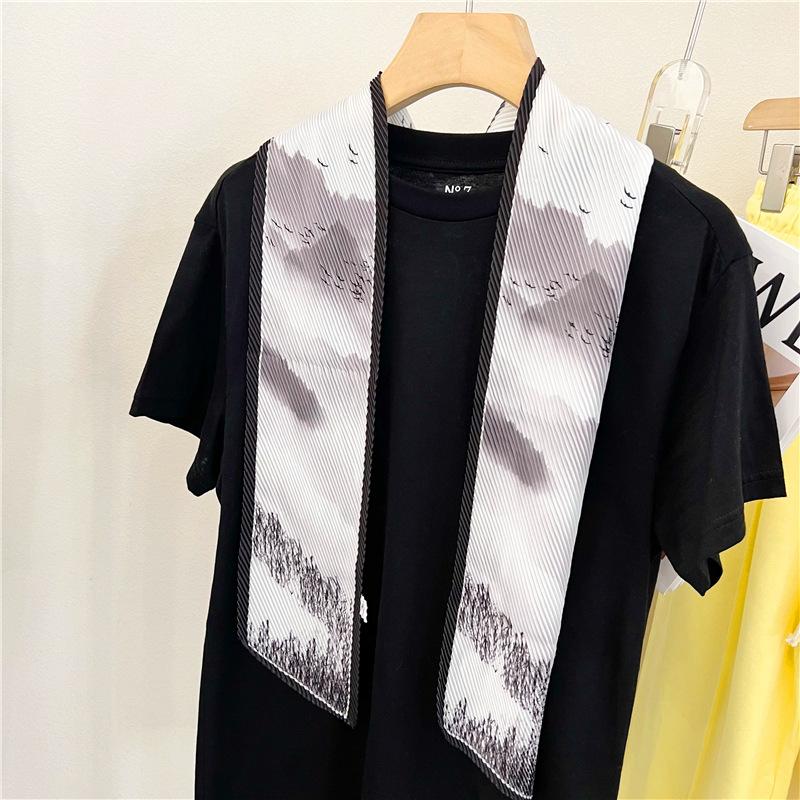 Bufanda larga de seda arrugada con pintura al óleo de paisaje de primavera y otoño para mujer, cinturón decorativo para el cabello, bufanda protectora para el cuello, bufanda pequeña, bolsa para atar