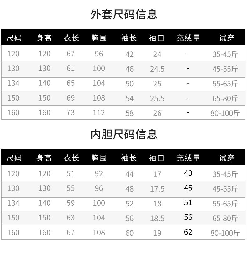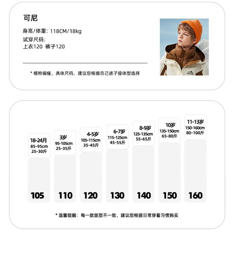 120cm 17.5-22.5kg, 130cm 22.5-27.5kg, 140cm 27.5-32.5kg, 150cm 32.5-40kg, 160cm 40-50kg