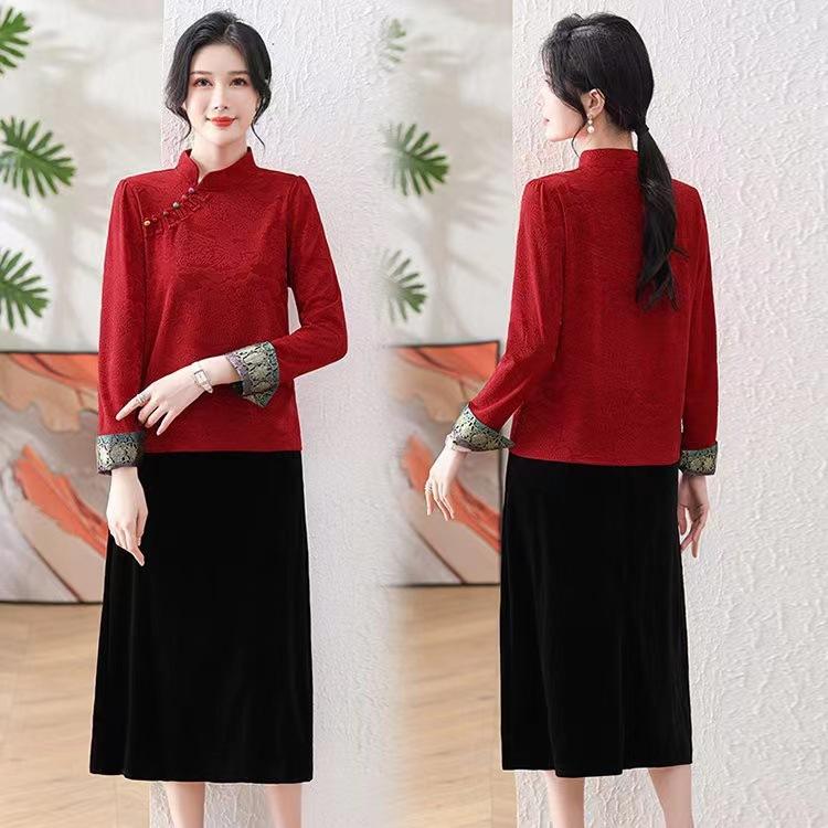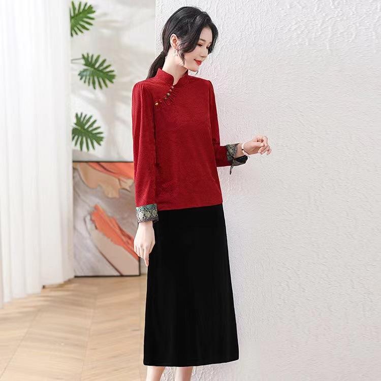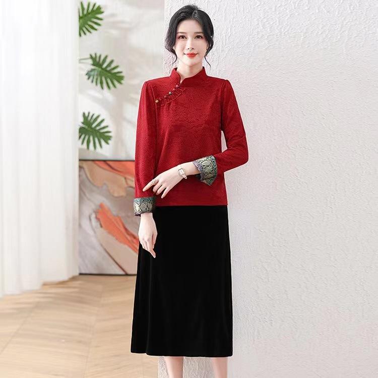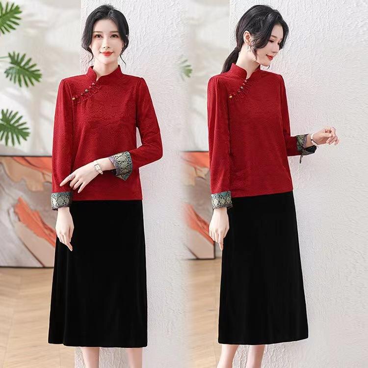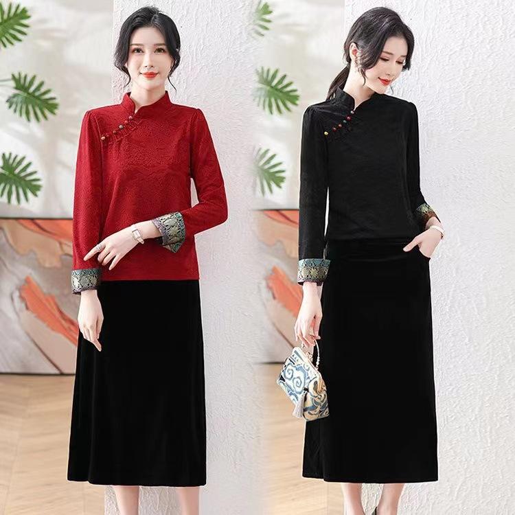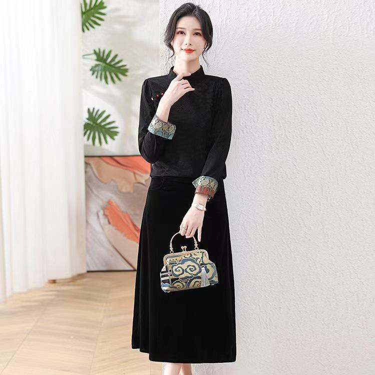 Traje de talla grande estilo étnico para mujer primavera nuevo camisa diagonal camisa de manga a color contrastante falda de terciopelo conjunto de 2 piezas