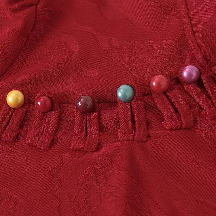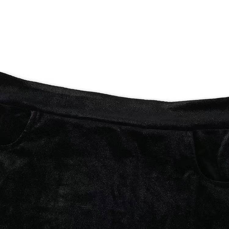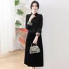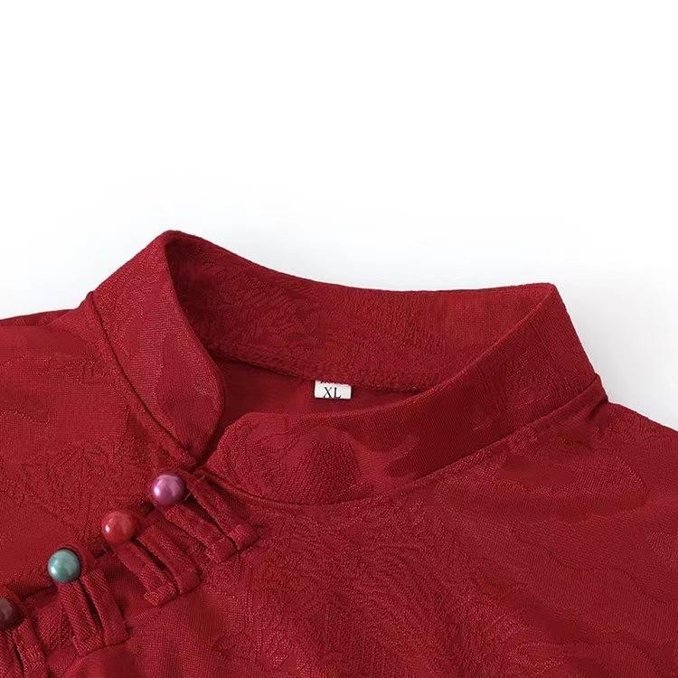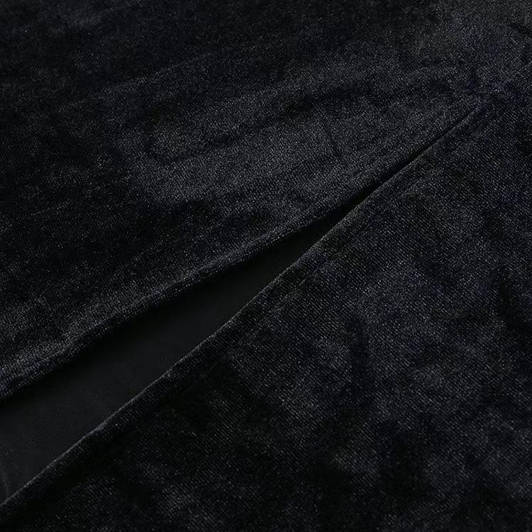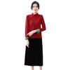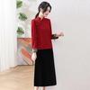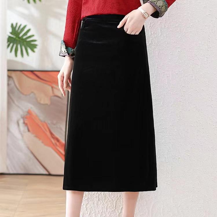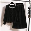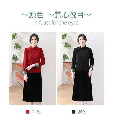 Traje de talla grande estilo étnico para mujer primavera nuevo camisa diagonal camisa de manga a color contrastante falda de terciopelo conjunto de 2 piezas