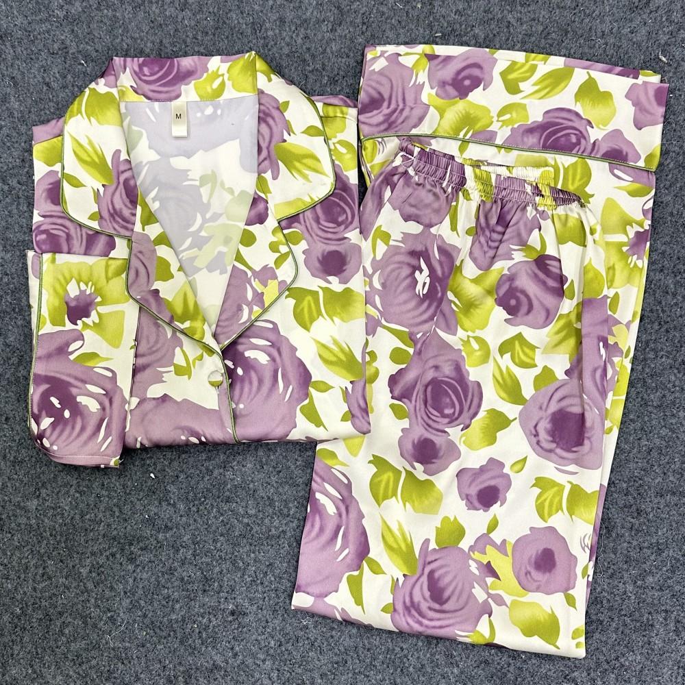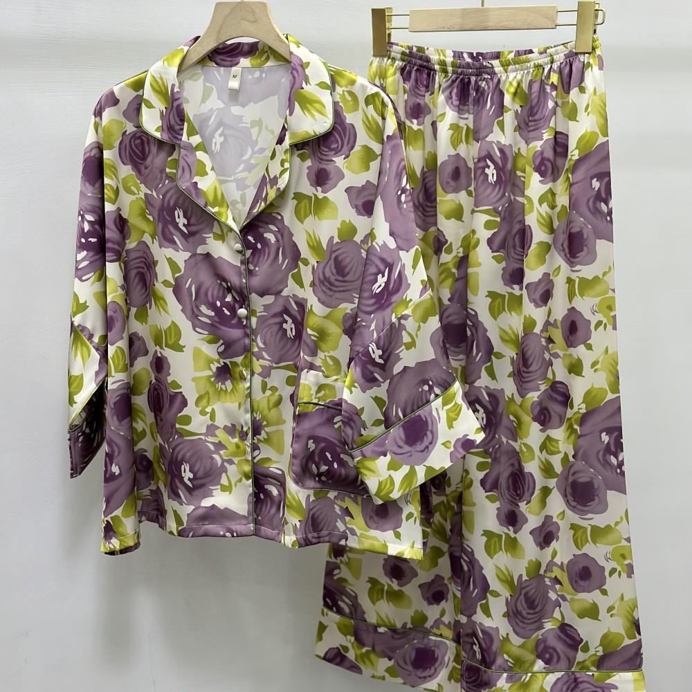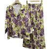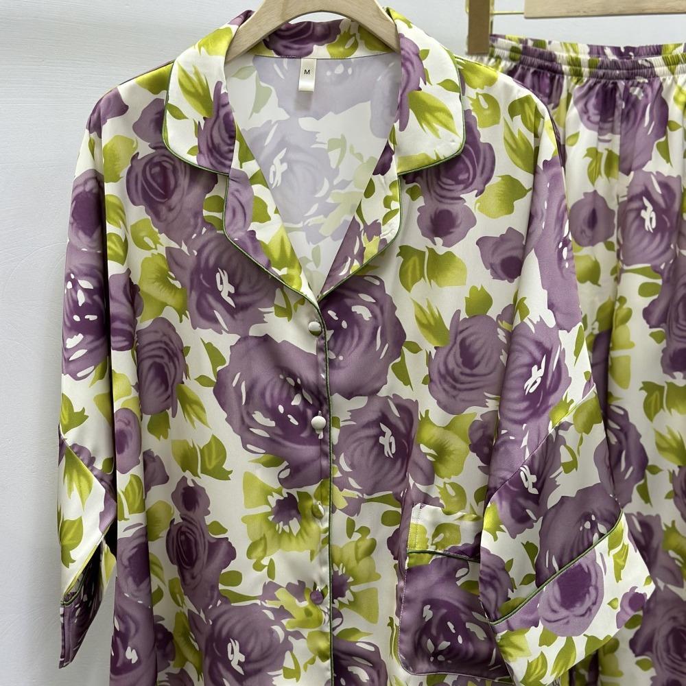 [Jardín de Ensueño Púrpura] Pijamas de mujer nuevos de primavera y otoño, pantalones de manga larga, traje fino transpirable, ropa de casa estampada de moda