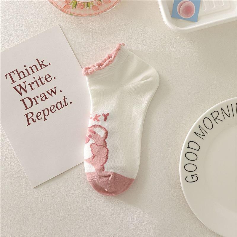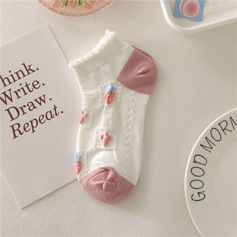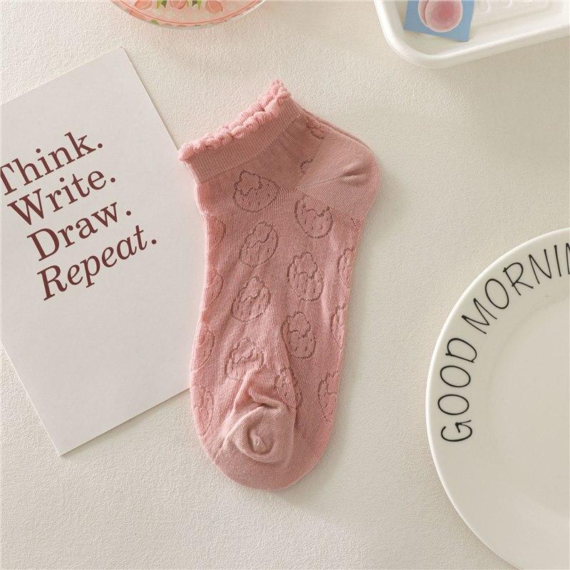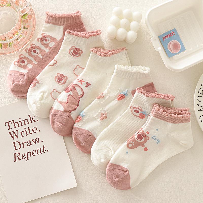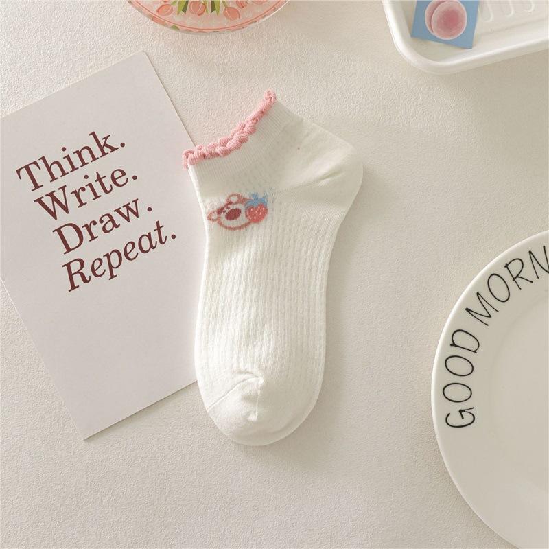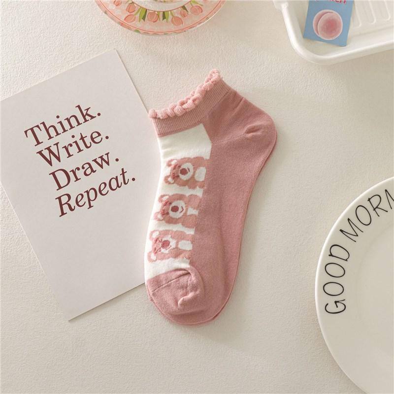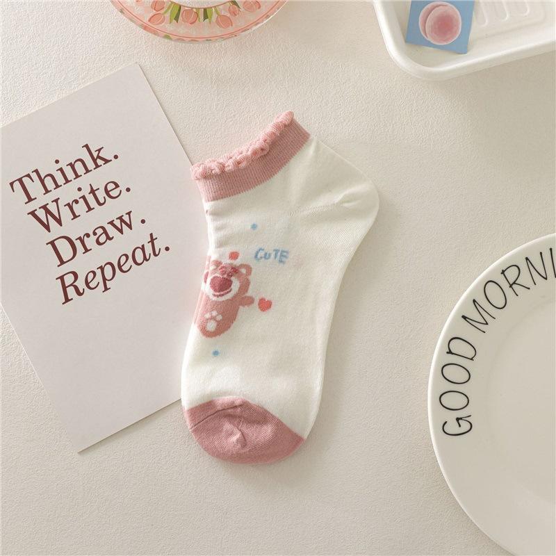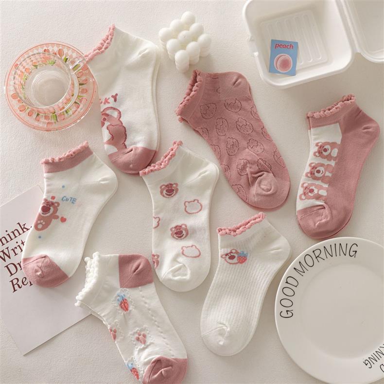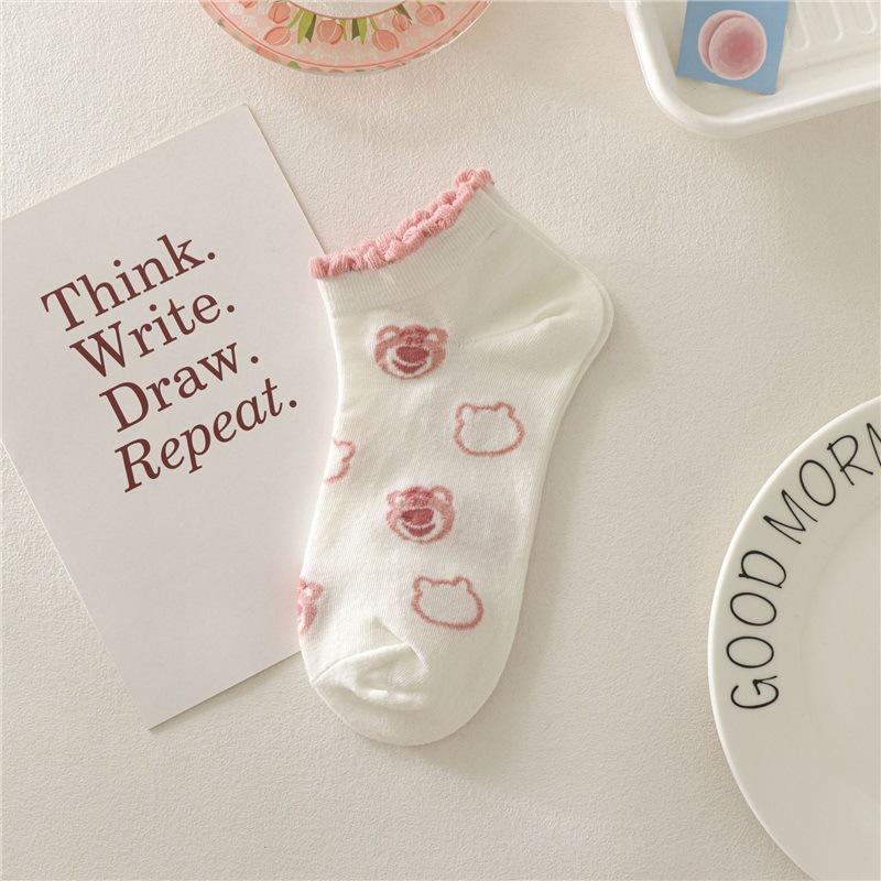 Calcetines Rosas de Verano Calcetines de Mujer Ins Trendy Lindo Japonés Fresa Oso Delgados Transpirables Calcetines de Barco para Estudiante