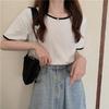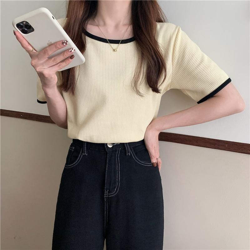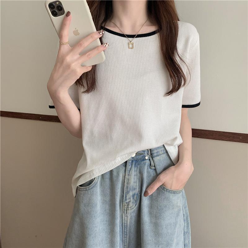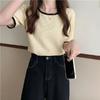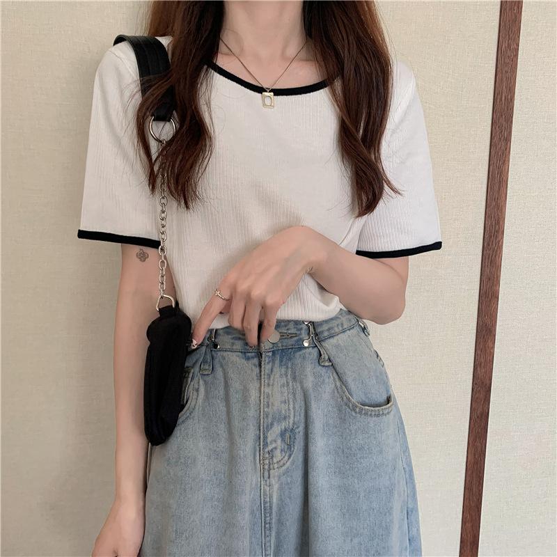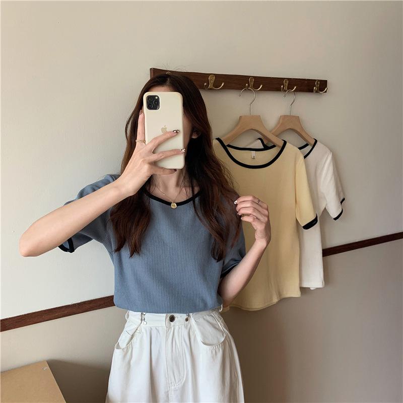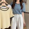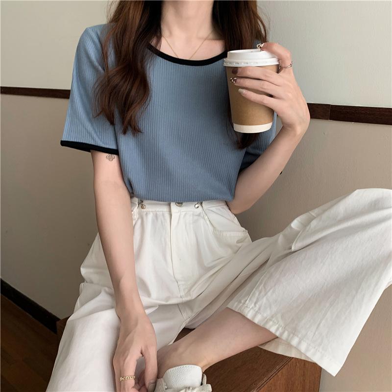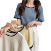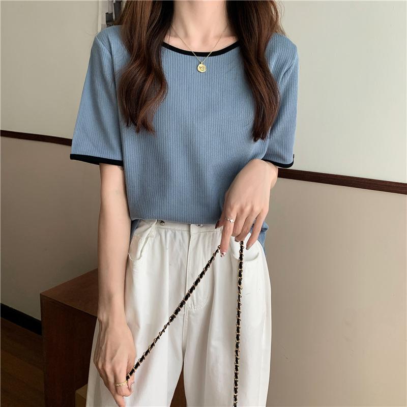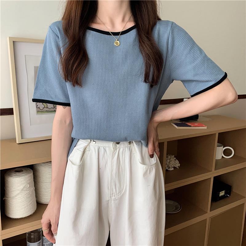 Suéter azul neblina top de manga corta clavícula diseño suelto sentido nicho camiseta manga media 1688 venta al por mayor ropa de mujer