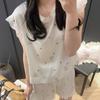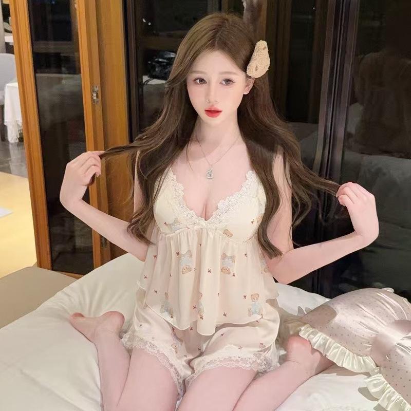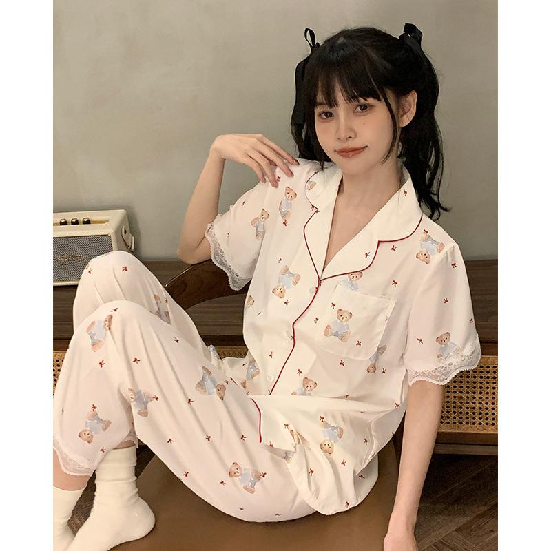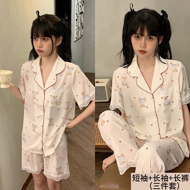 Pijamas de mujer lindos y dulces de oso de primavera y otoño, ropa de casa cómoda de seda de hielo de manga larga, ropa exterior