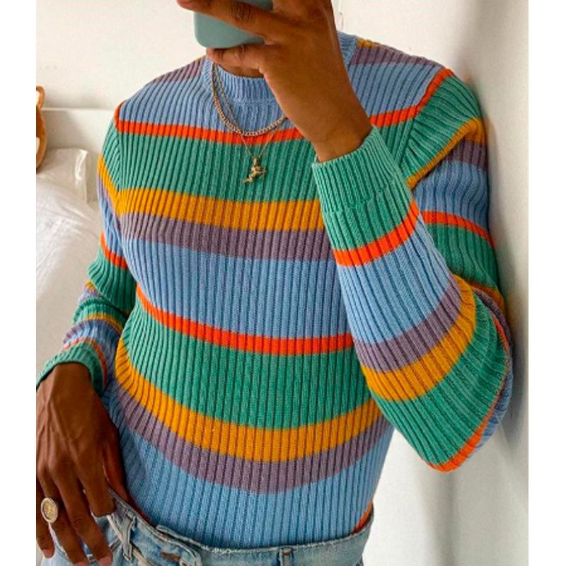Suéter de punto informal a rayas de arcoíris delgado coreano de comercio exterior transfronterizo nuevo de otoño e invierno de 2023 para Europa y Estados Unidos