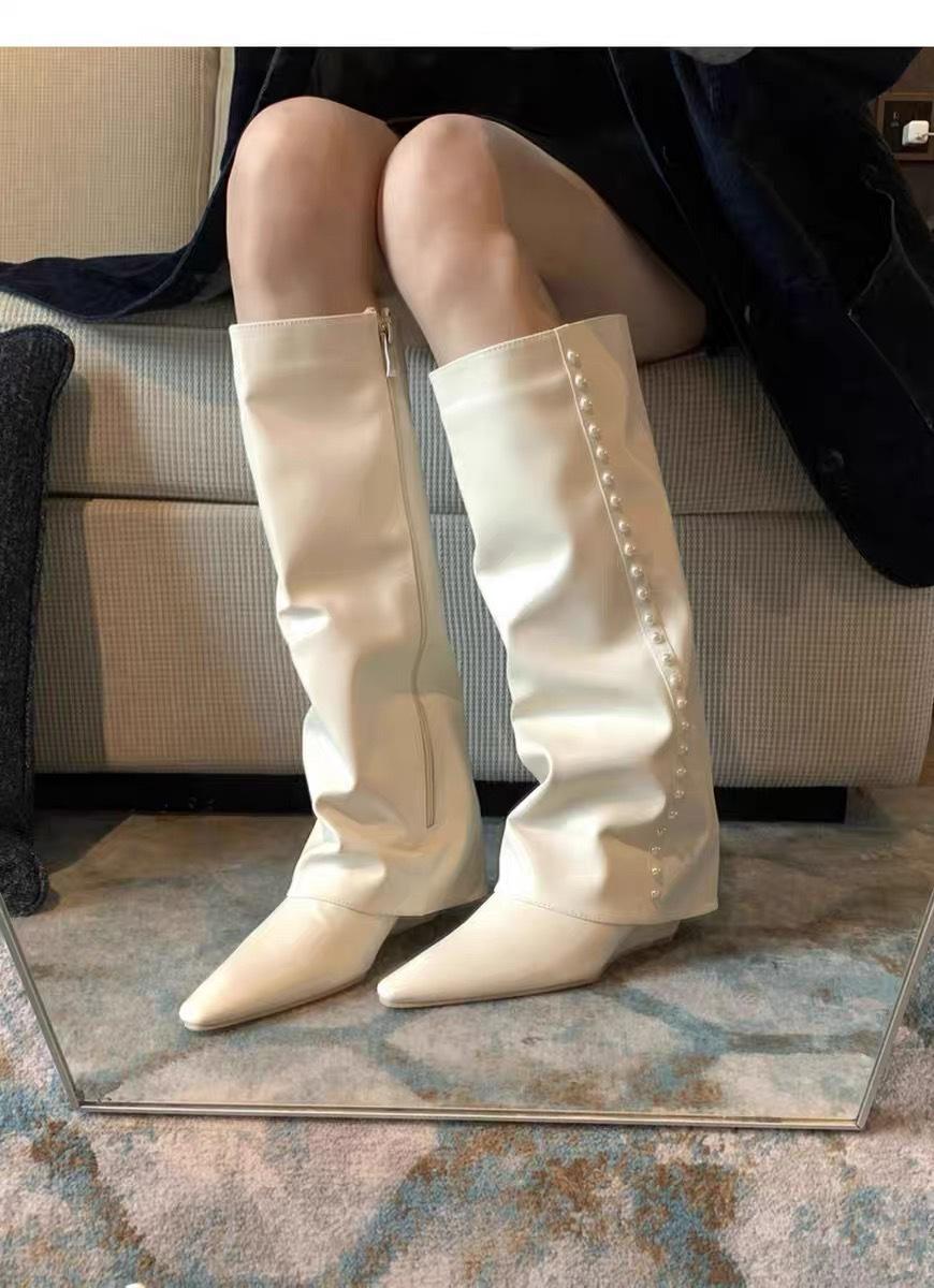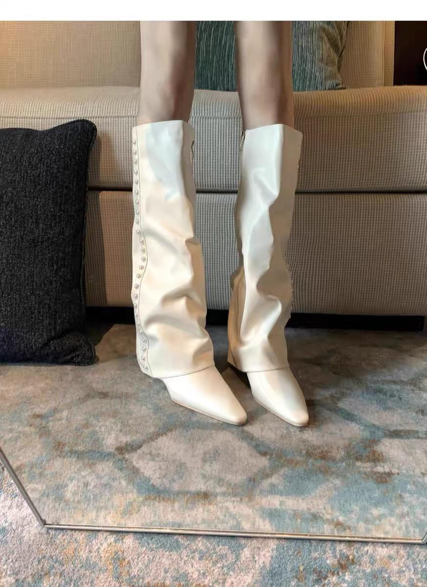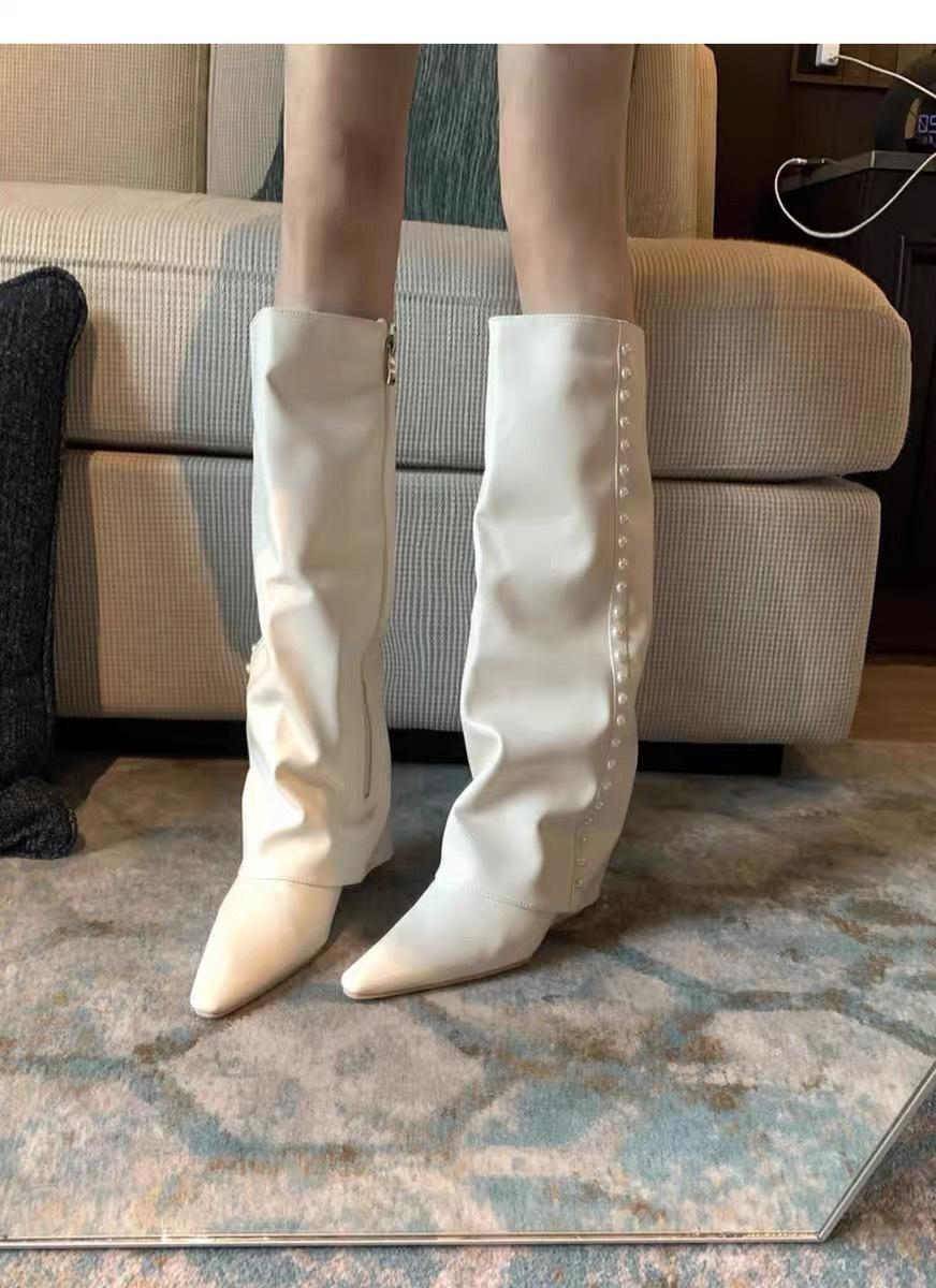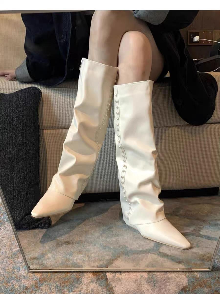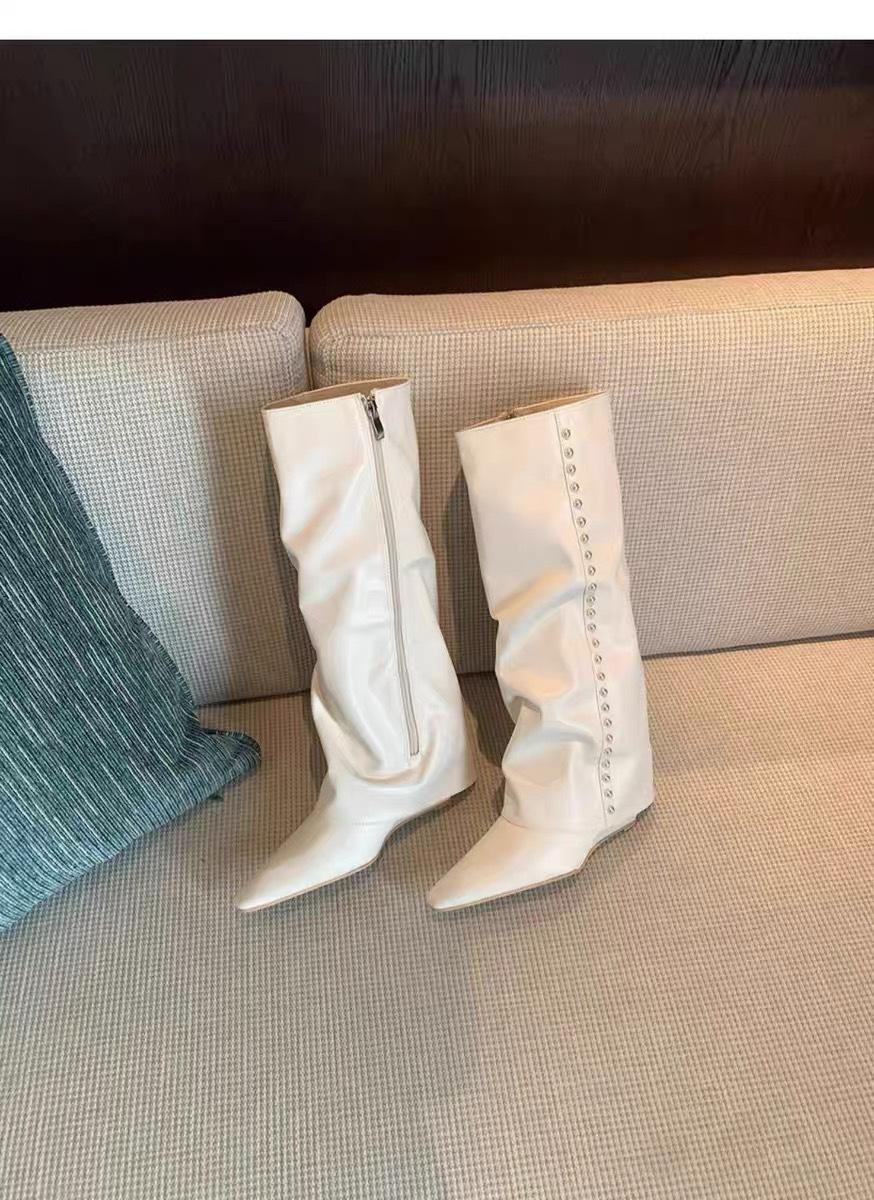 ¡Muestra tus piernas más delgadas! Botas Pantalón Blancas Nuevas Populares Gruesas mm Punta Puntiaguda Cuña Botas Altas sobre la Rodilla para Mujer