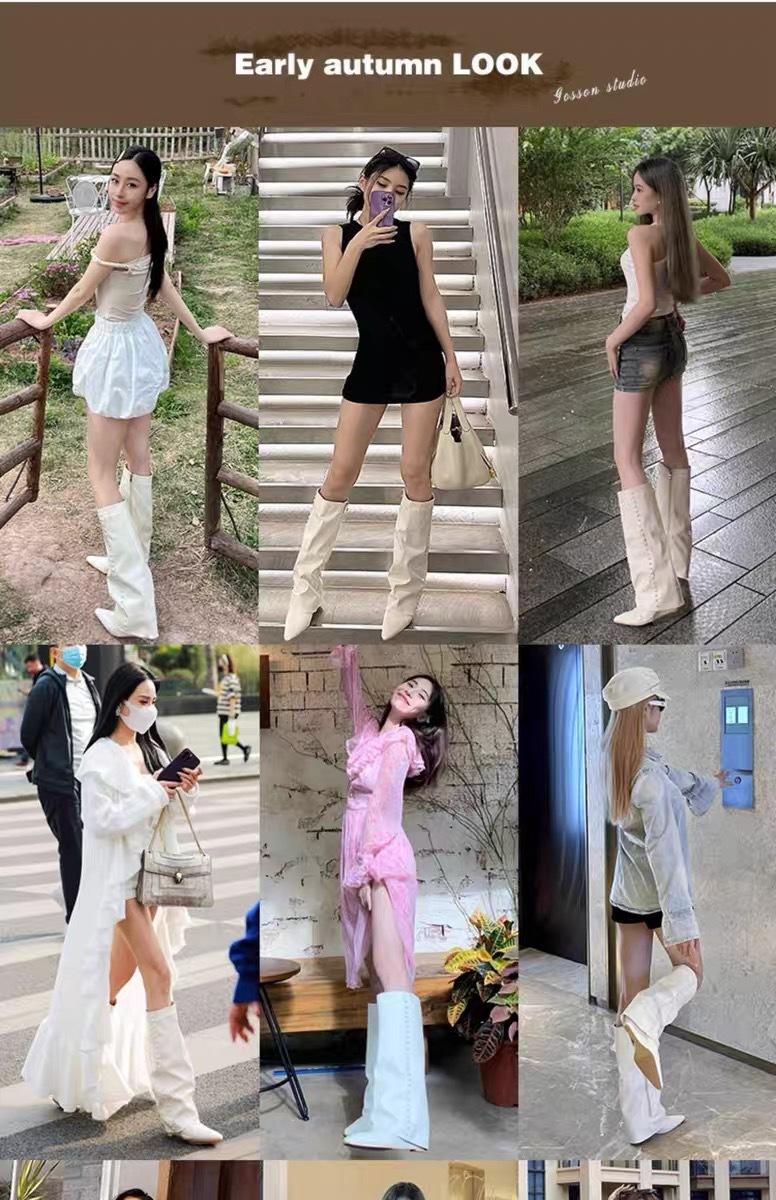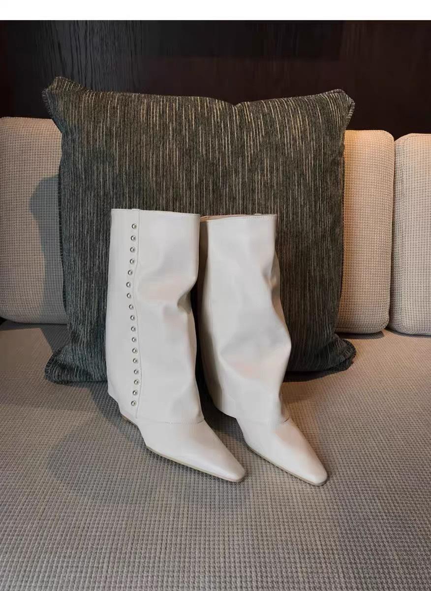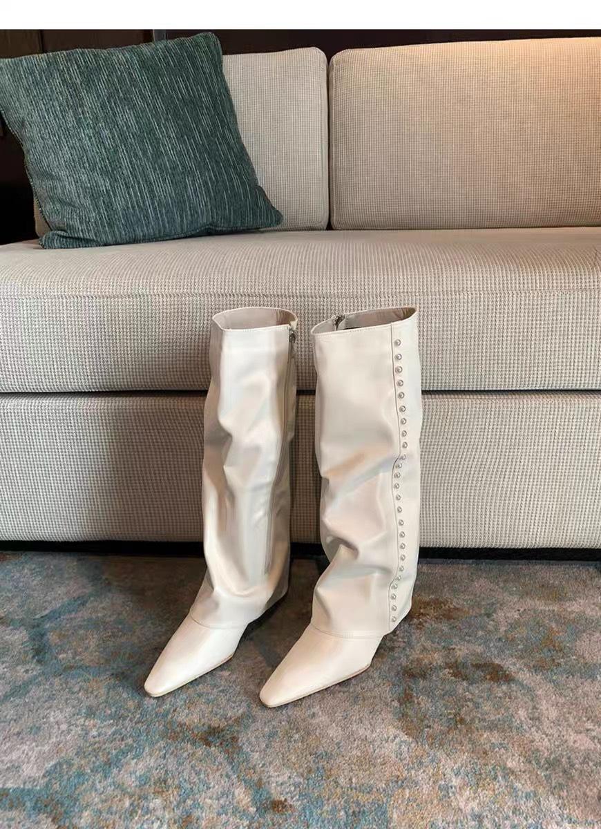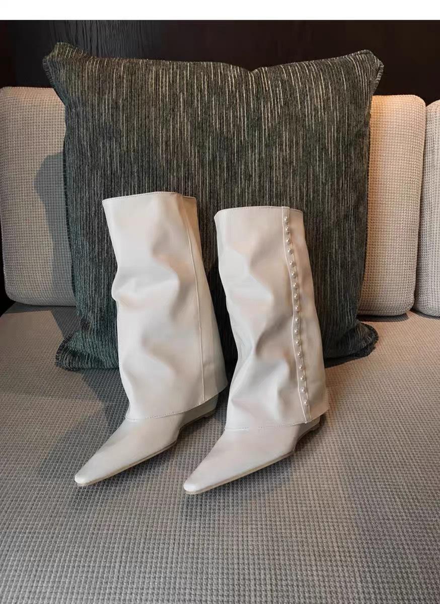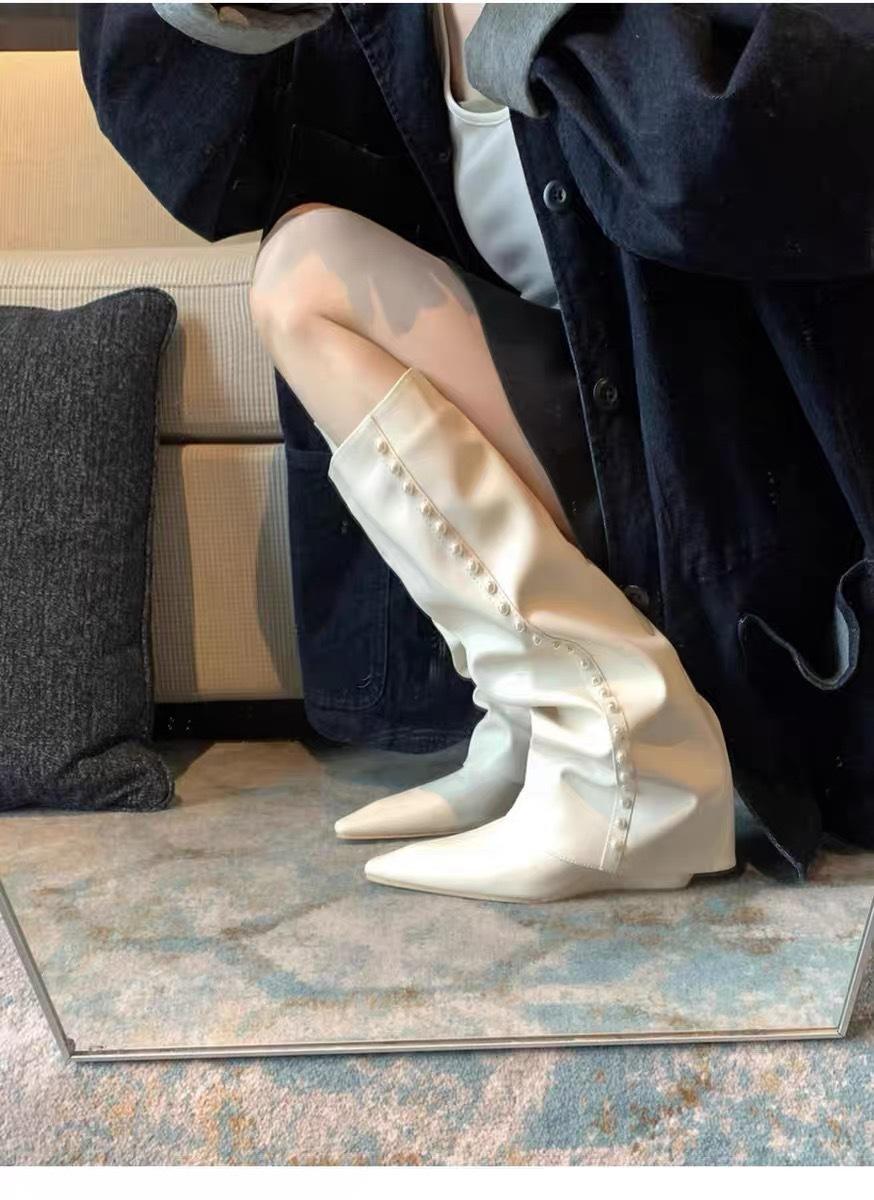 ¡Muestra tus piernas más delgadas! Botas Pantalón Blancas Nuevas Populares Gruesas mm Punta Puntiaguda Cuña Botas Altas sobre la Rodilla para Mujer