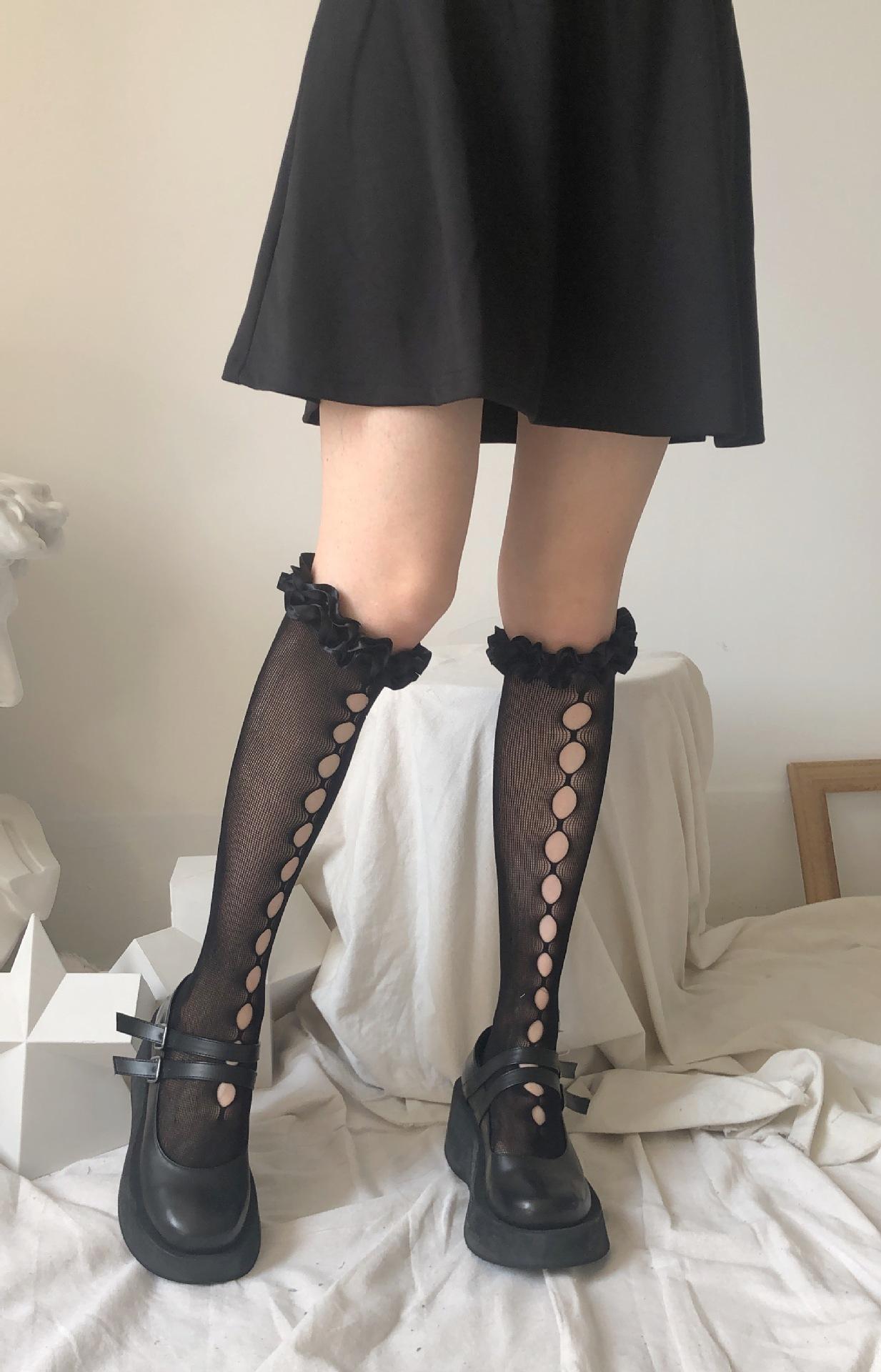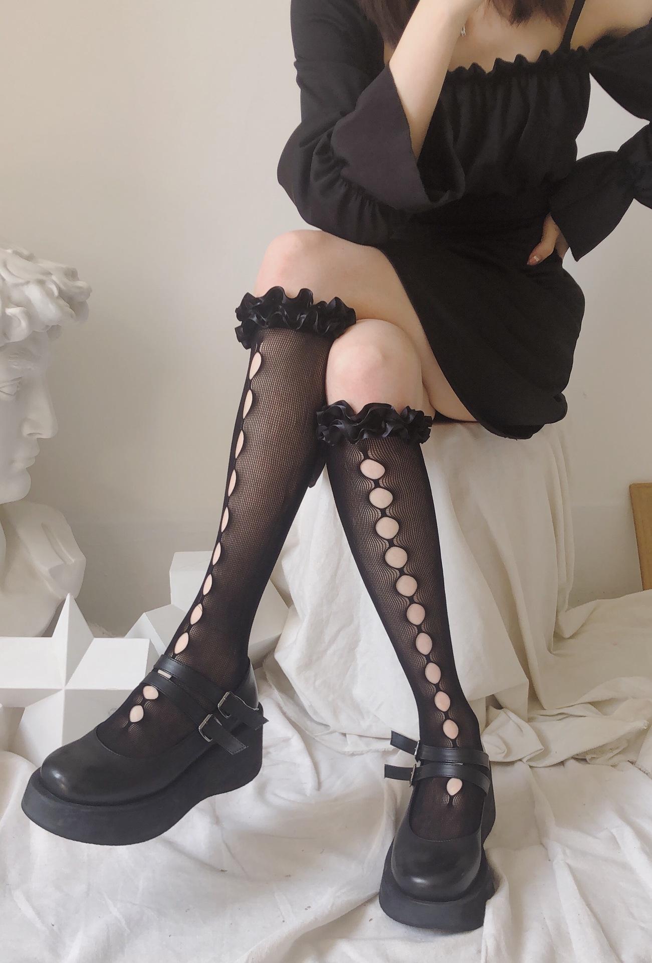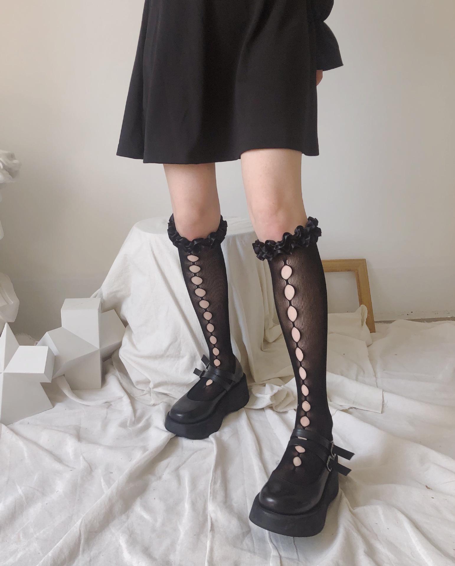 Hermoso Lolita Plisado Satén Oreja de Madera Nicho Oscuro Hueco Encaje de Alta Elasticidad Tubo Medio Sobre la Rodilla Uso