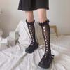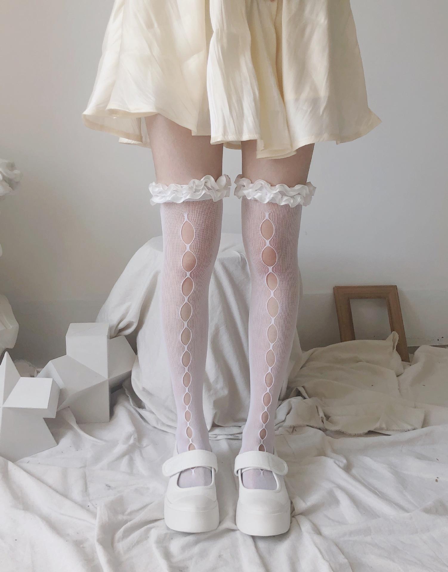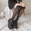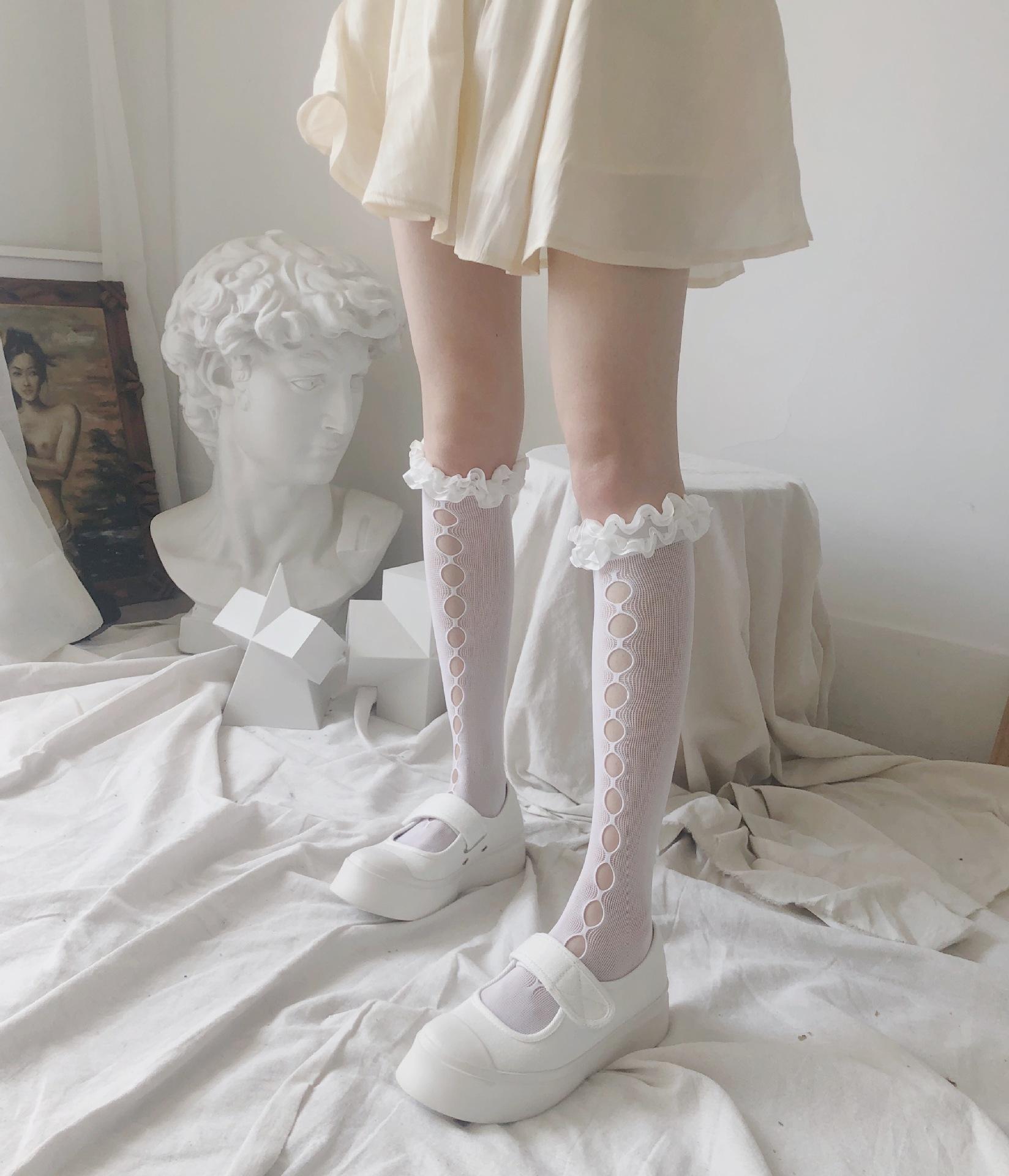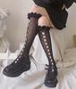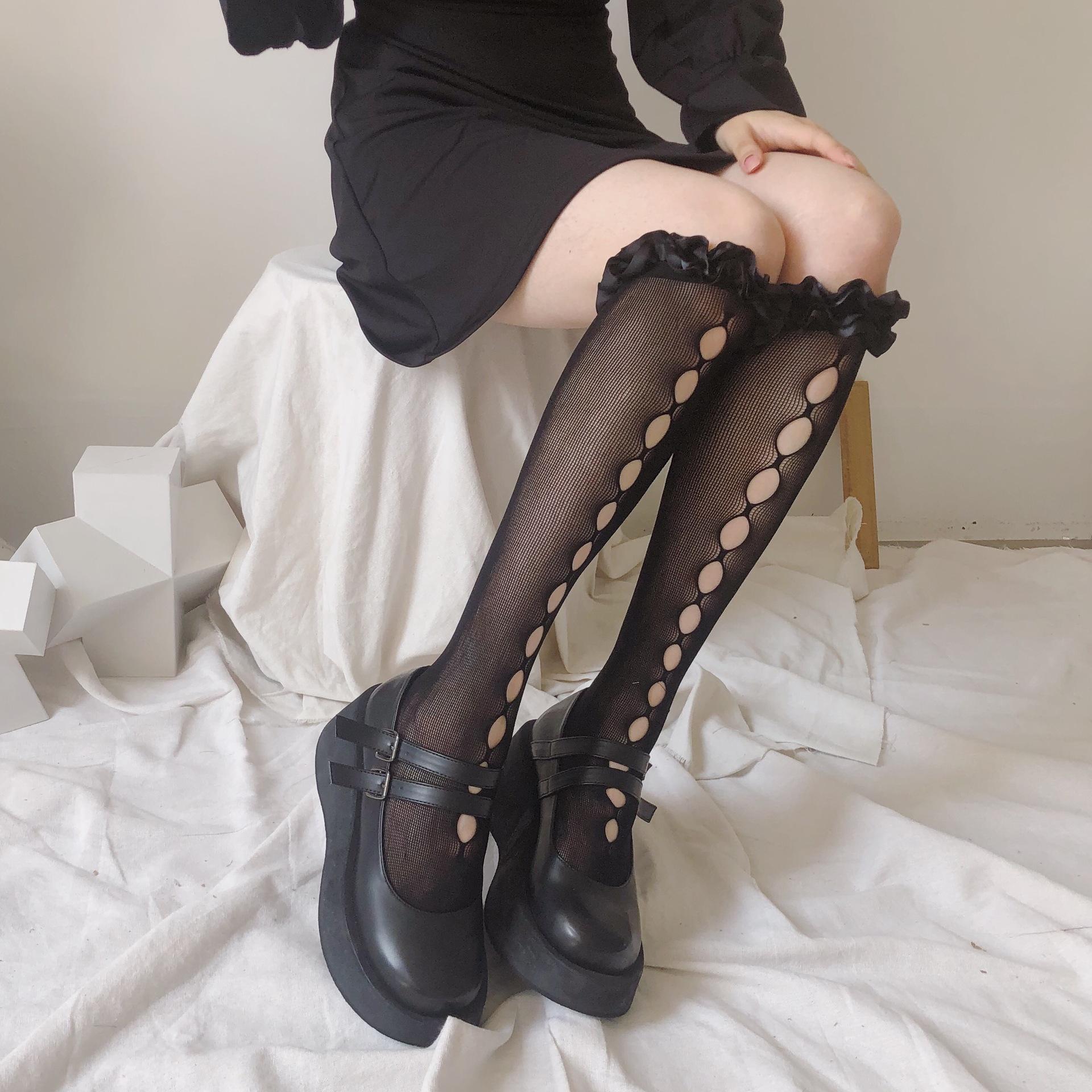 Hermoso Lolita Plisado Satén Oreja de Madera Nicho Oscuro Hueco Encaje de Alta Elasticidad Tubo Medio Sobre la Rodilla Uso