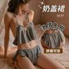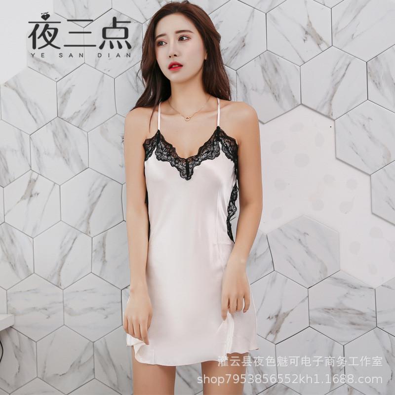 Pijama de mujer de imitación de seda de hielo sexy caliente sin espalda lencería de encaje adulto camisón de tirantes conjunto de tres piezas