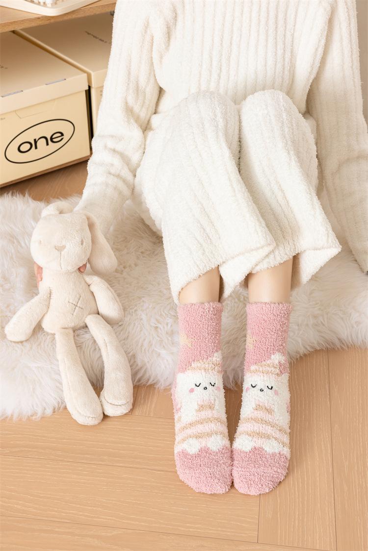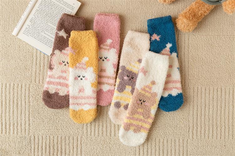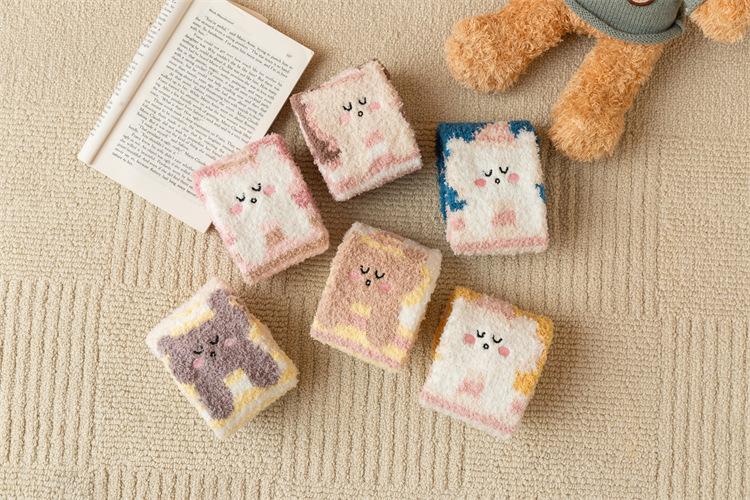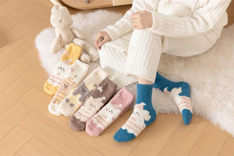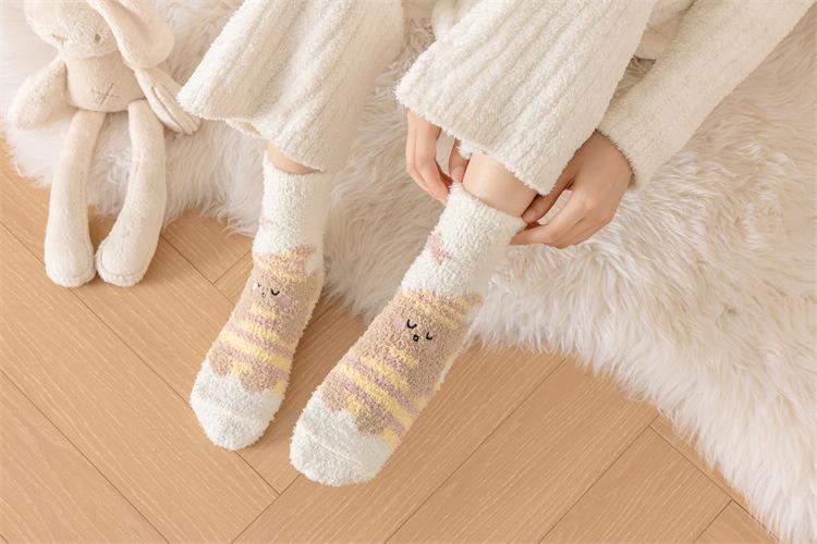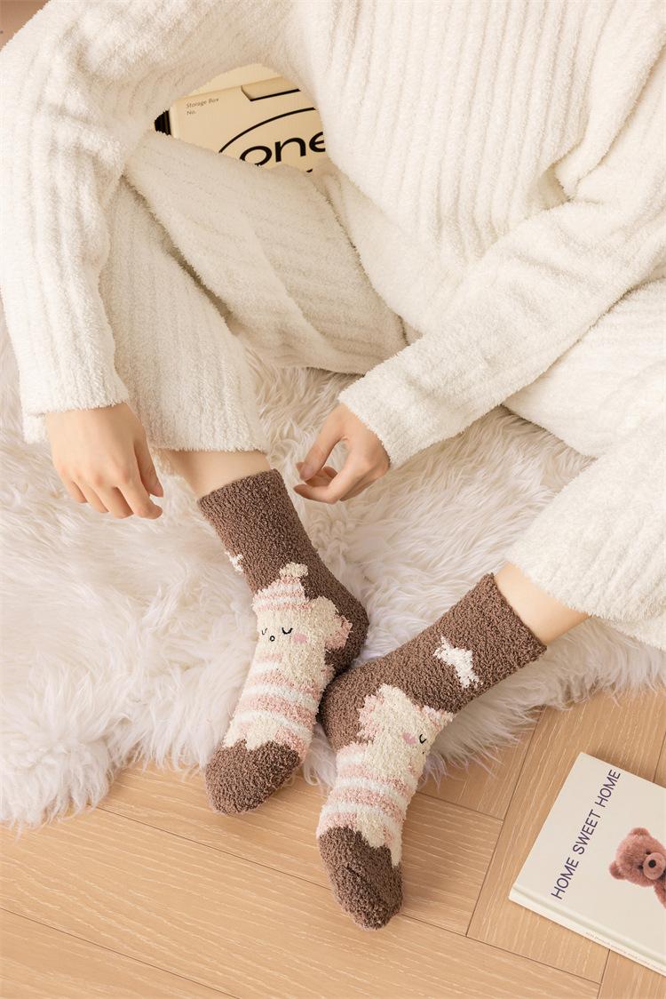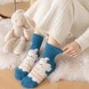 Calcetines gruesos de lana con forro polar para otoño e invierno, calcetines de media pantorrilla con dibujos animados, calcetines cálidos de lana coral sin pelusa para mujer