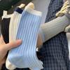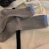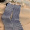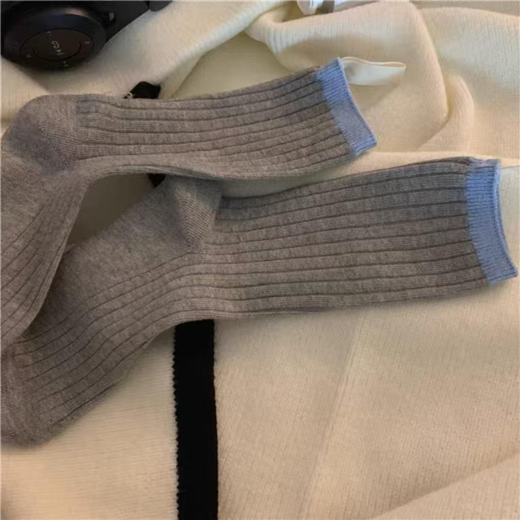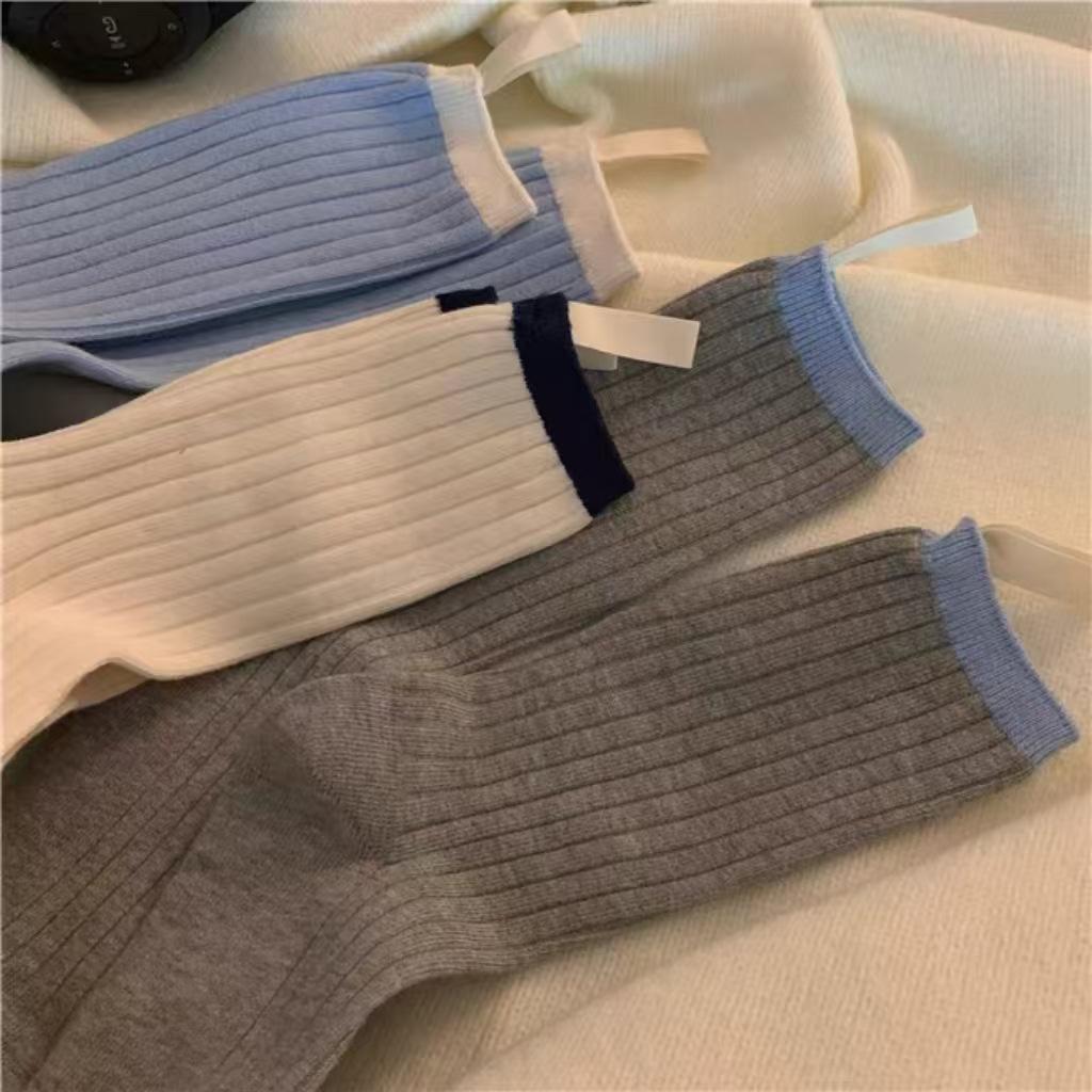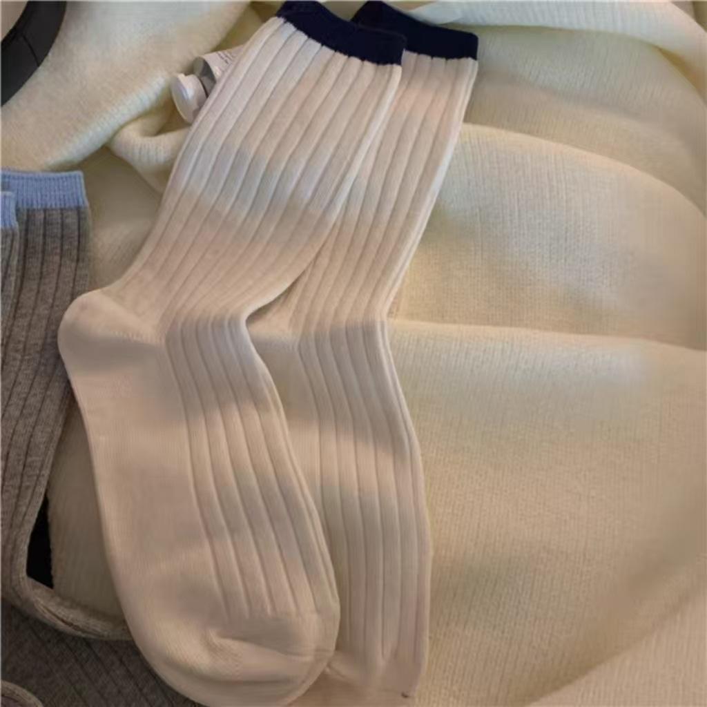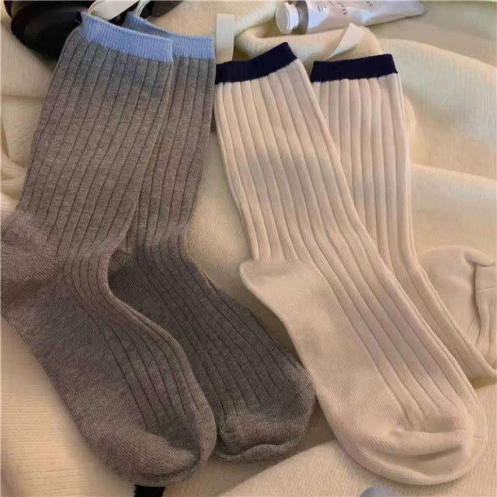 Calcetines de otoño para mujer, con etiqueta pequeña de tela y colores contrastantes, estilo japonés, con patrón vertical simple, de moda, con costuras de color liso y apilables para combinar.