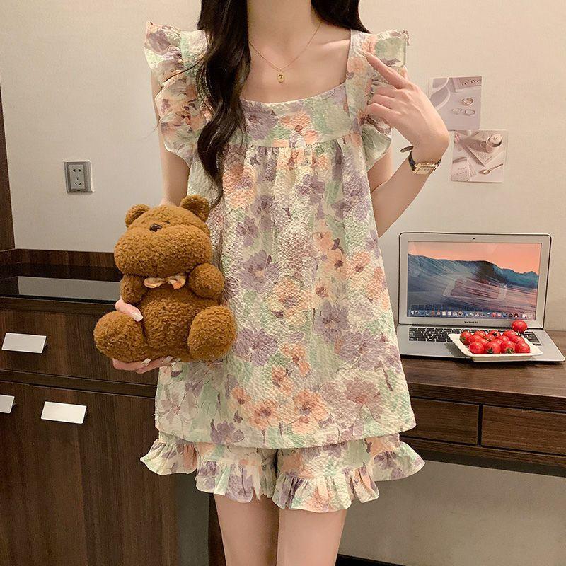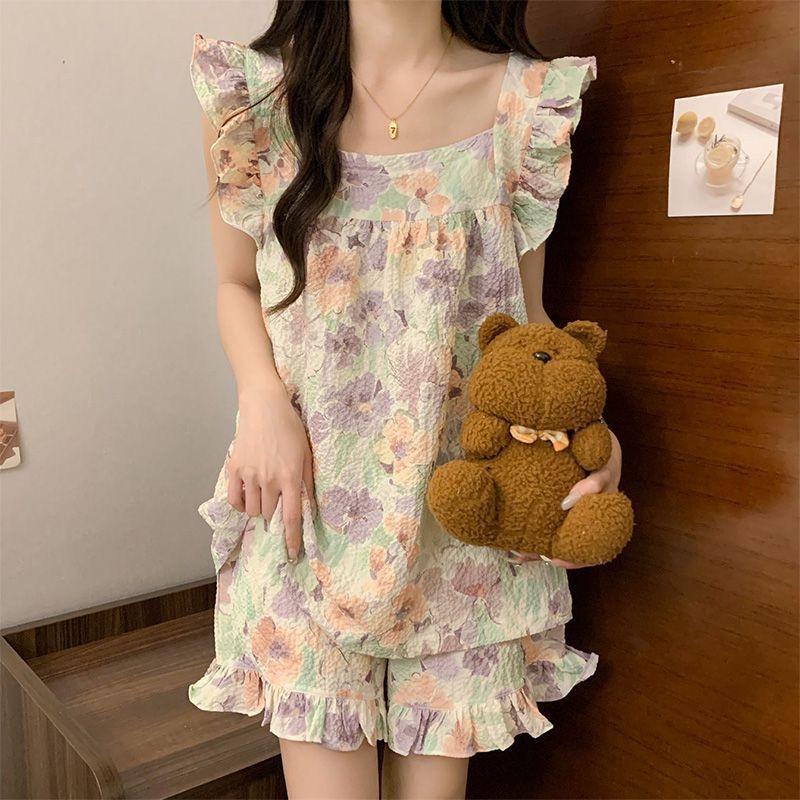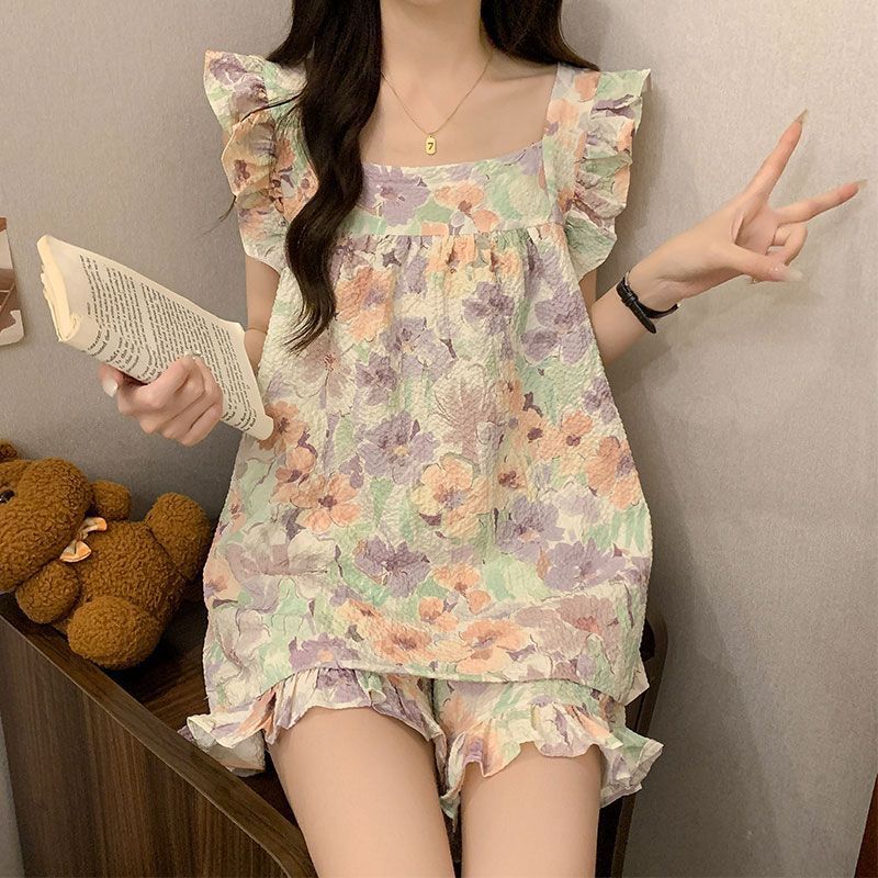 Pijamas de verano de nuevo estilo para mujer, sencillos, con mangas cortas y volantes, ropa de casa para niña