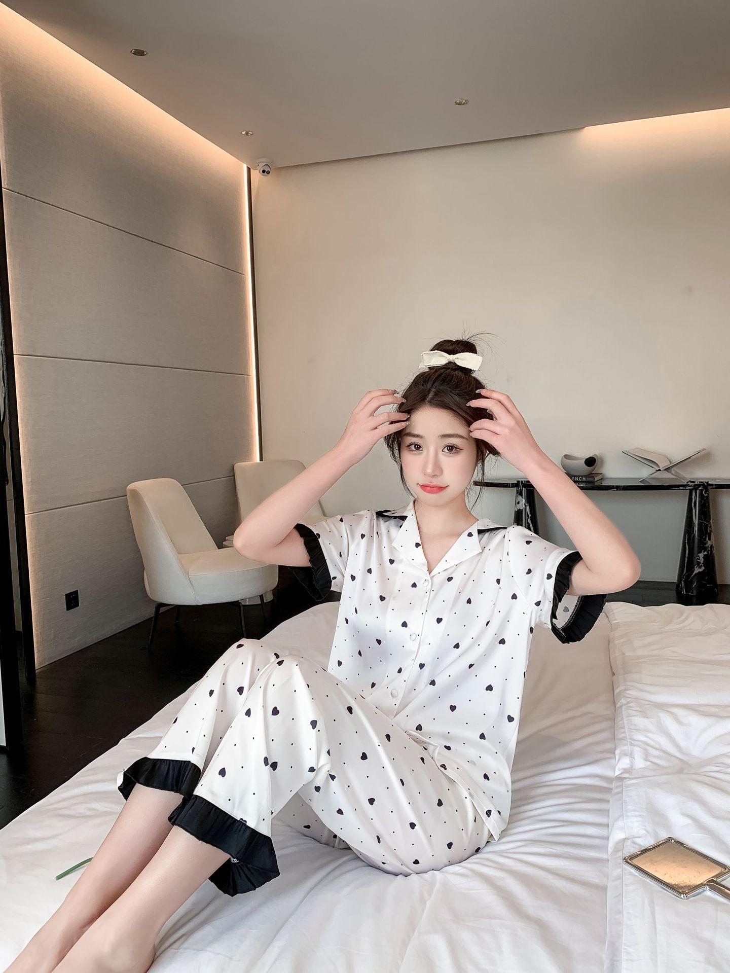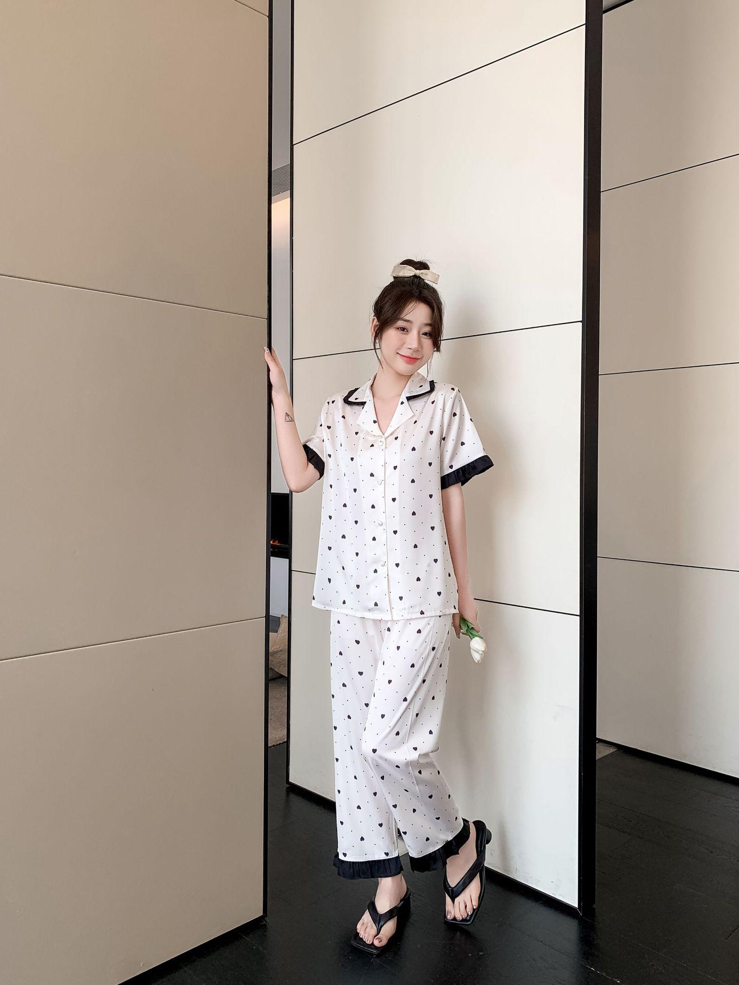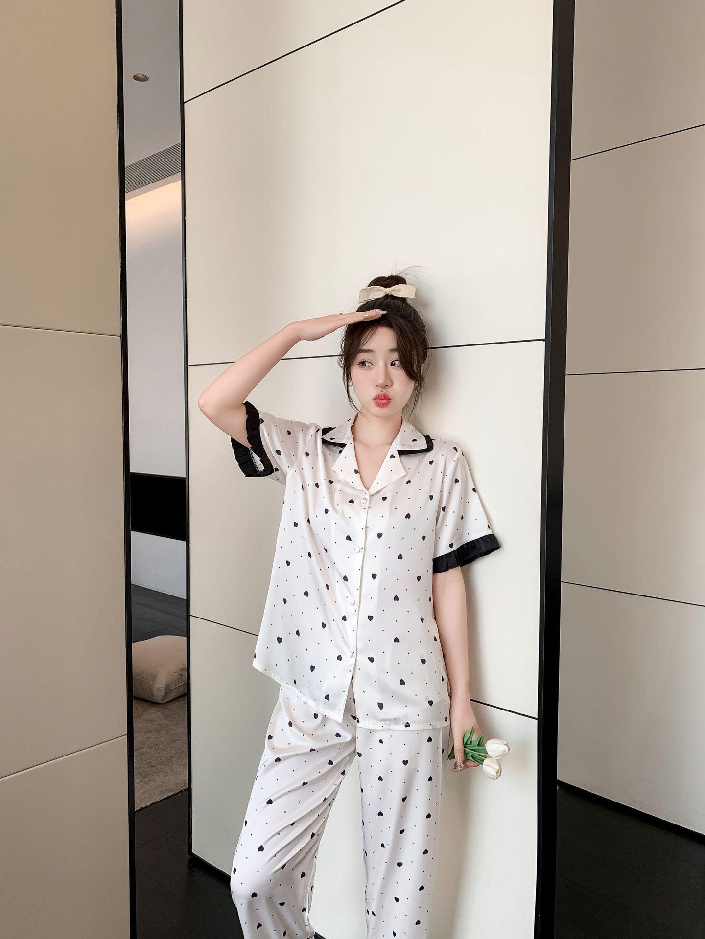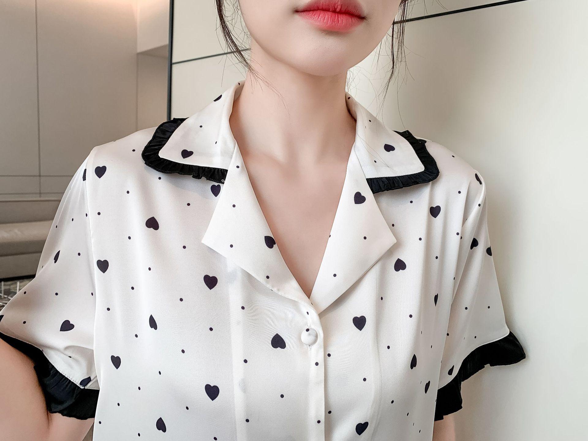 Pijamas de seda de hielo para mujer, ropa de dormir de manga corta con estampado de amor para el hogar, pijamas de seda de imitación, venta al por mayor, primavera y verano 2023