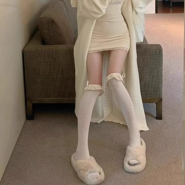 Calcetines de encaje por encima de la rodilla Medias de algodón Lolita de color blanco leche puro Calcetines de mujer estilo ballet con costuras de cinta