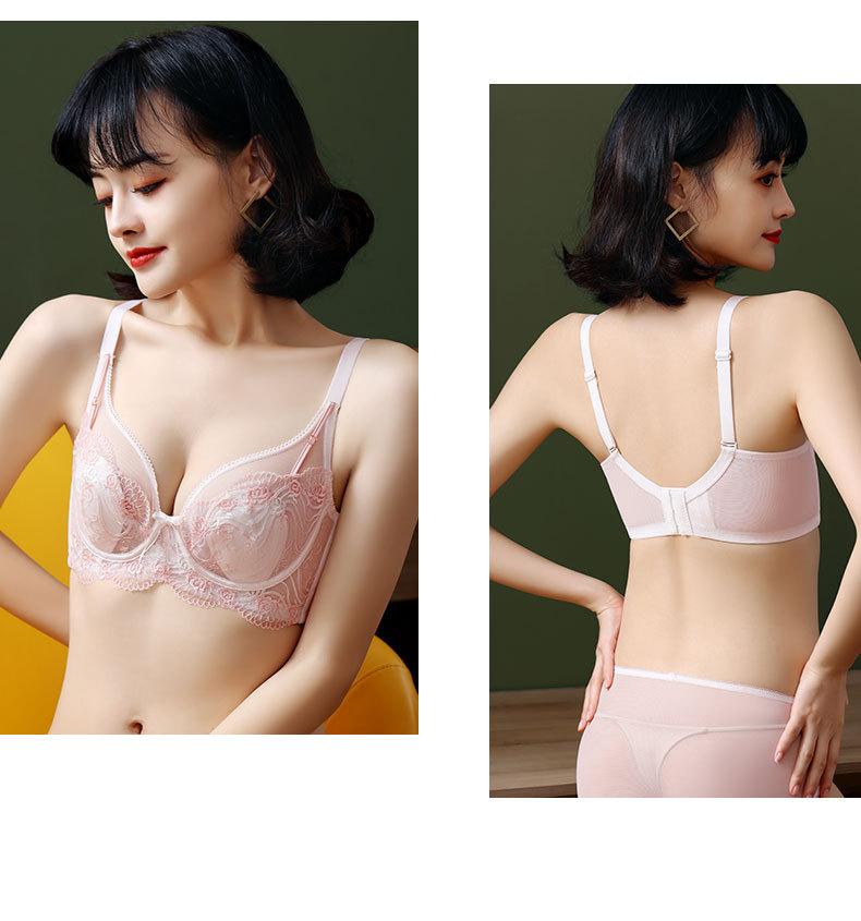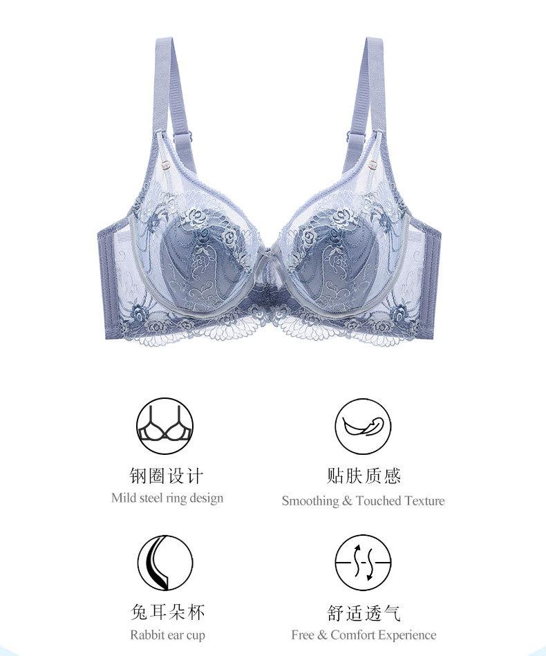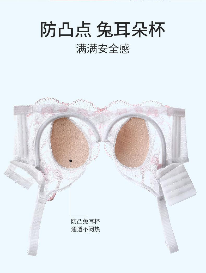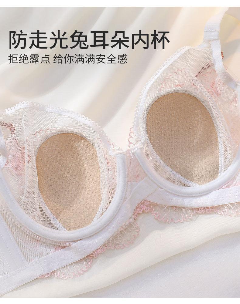 Ropa interior sexy de encaje bordado con aro de acero, copas recogidas tipo oreja de conejo para busto grande, ultradelgado, transpirable, sujetador superior